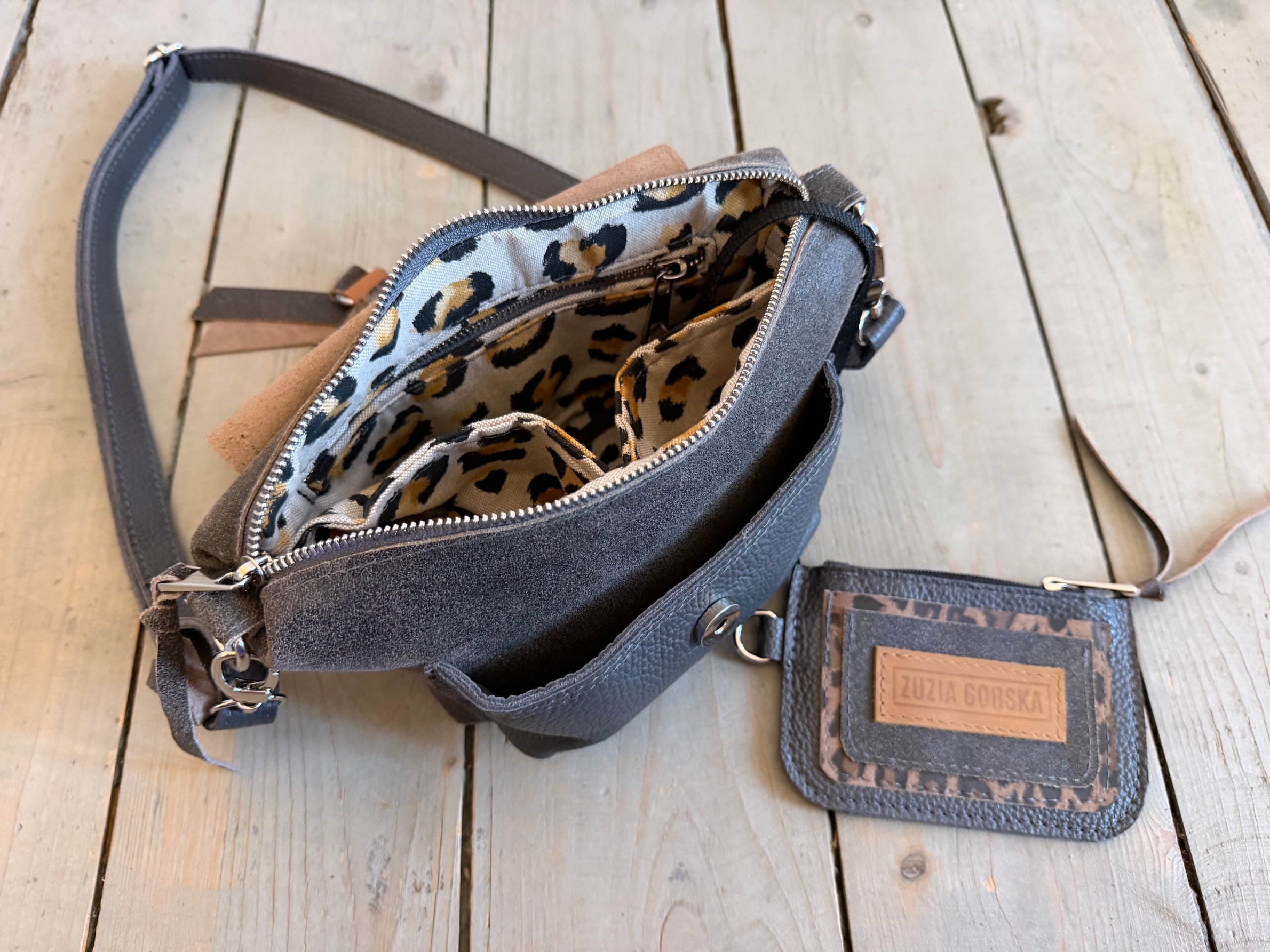 Uszyta ze skóry naturalnej welurowej + licowej + nubukowej + bawełnianej podszewki.