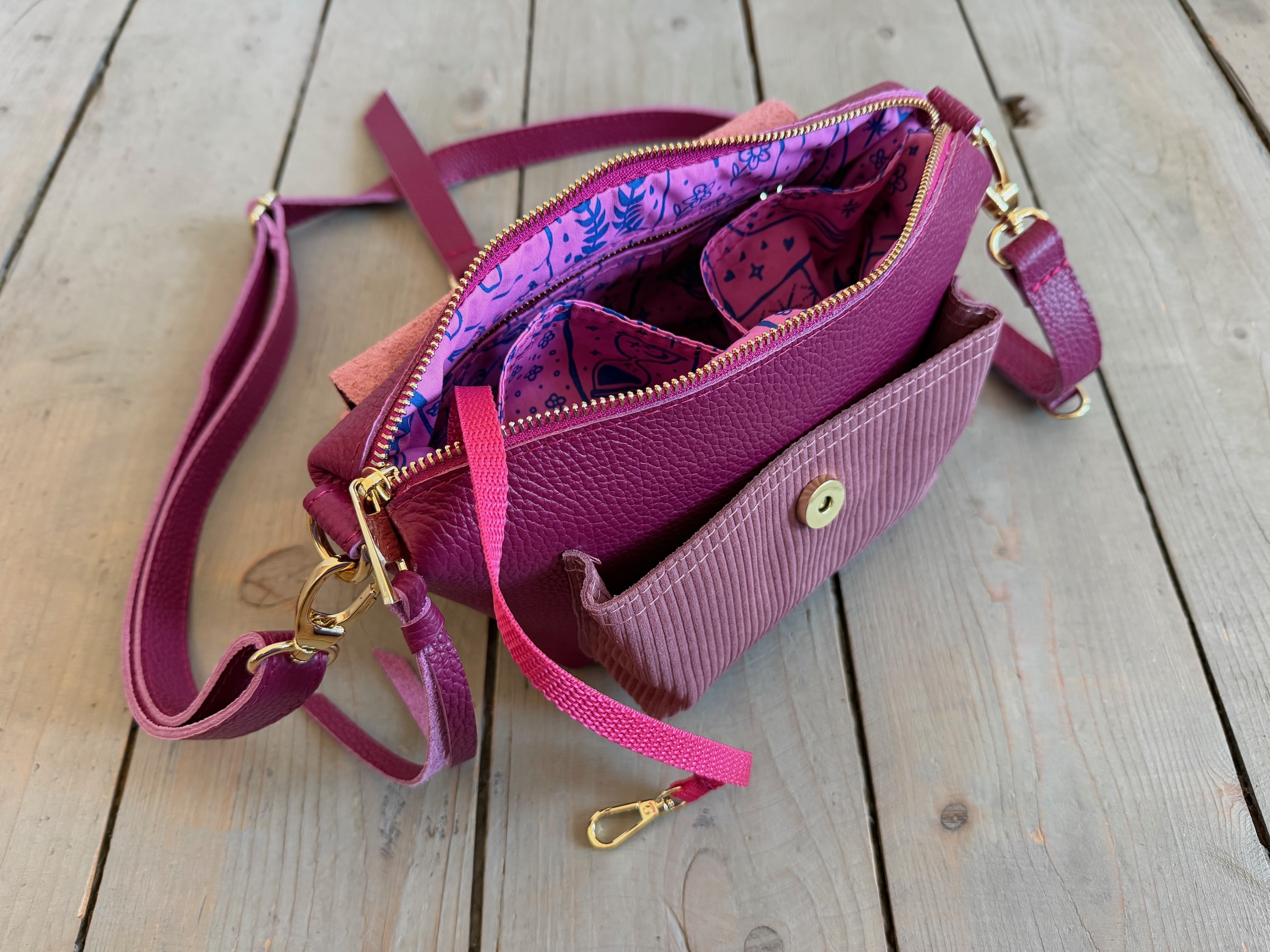 Uszyta ze skóry naturalnej licowej + nubukowej + welurowej + bawełnianej podszewki.