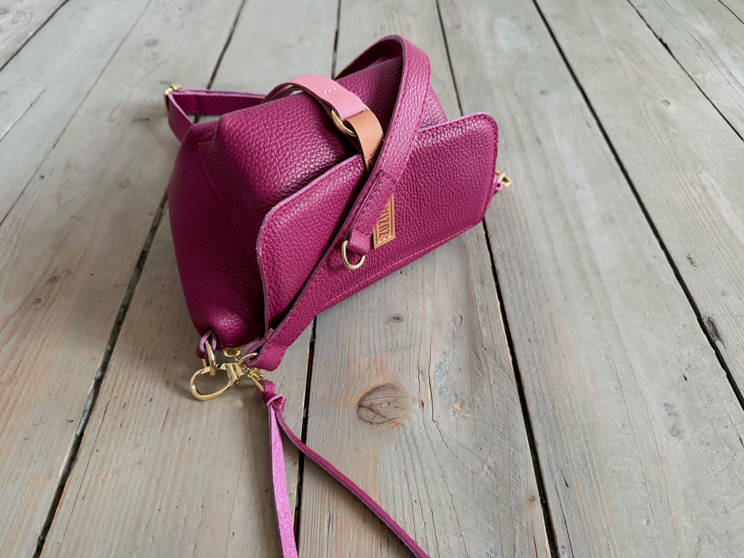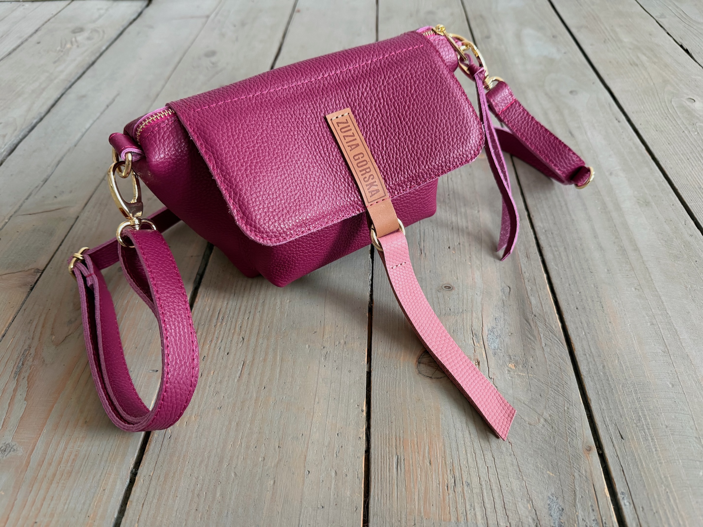 Uszyta ze skóry naturalnej licowej + bawełnianej podszewki.