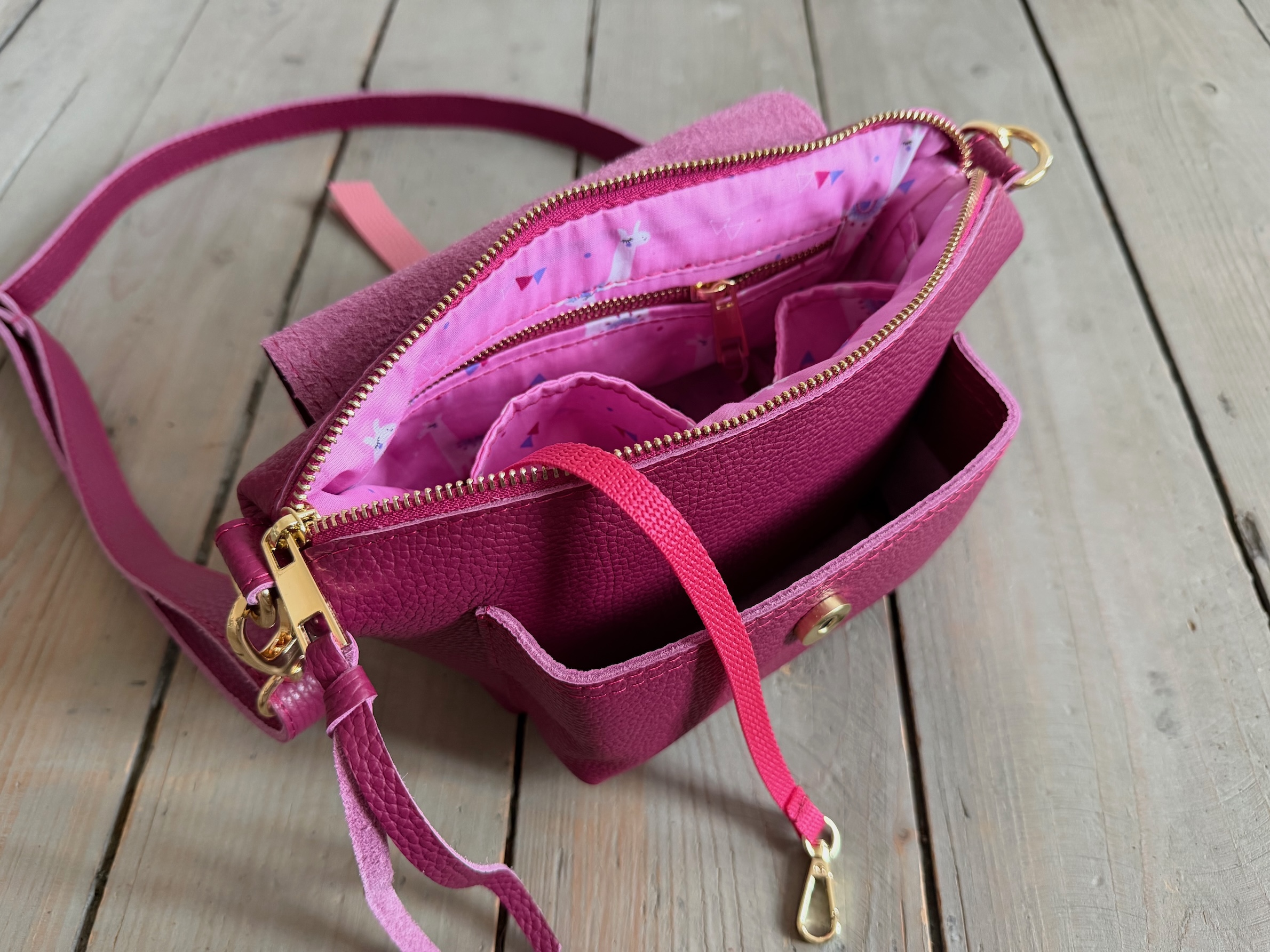 Wewnątrz kieszonka na zamek, dwie kieszonki wsuwki oraz smyczka z karabińczykiem.
