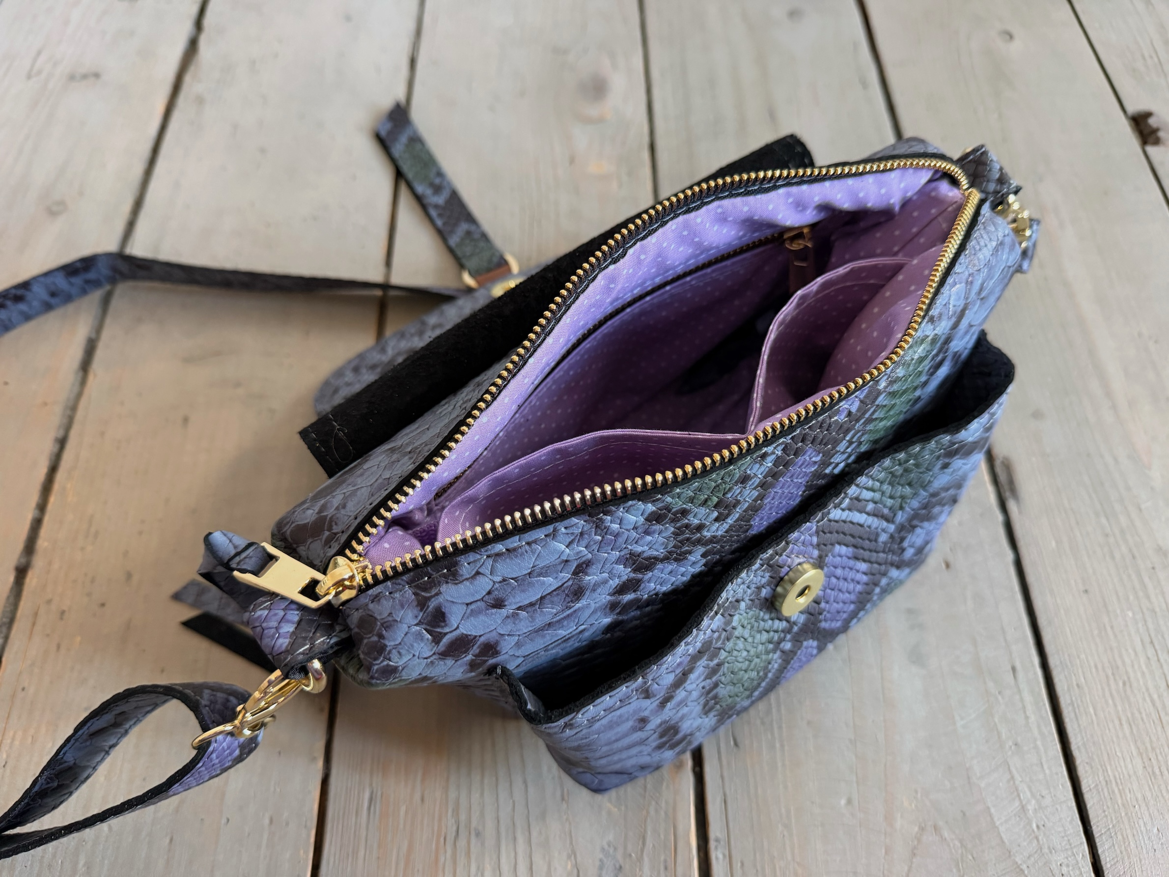Wewnątrz kieszonka na zamek, dwie kieszonki wsuwki oraz smyczka z karabińczykiem.
