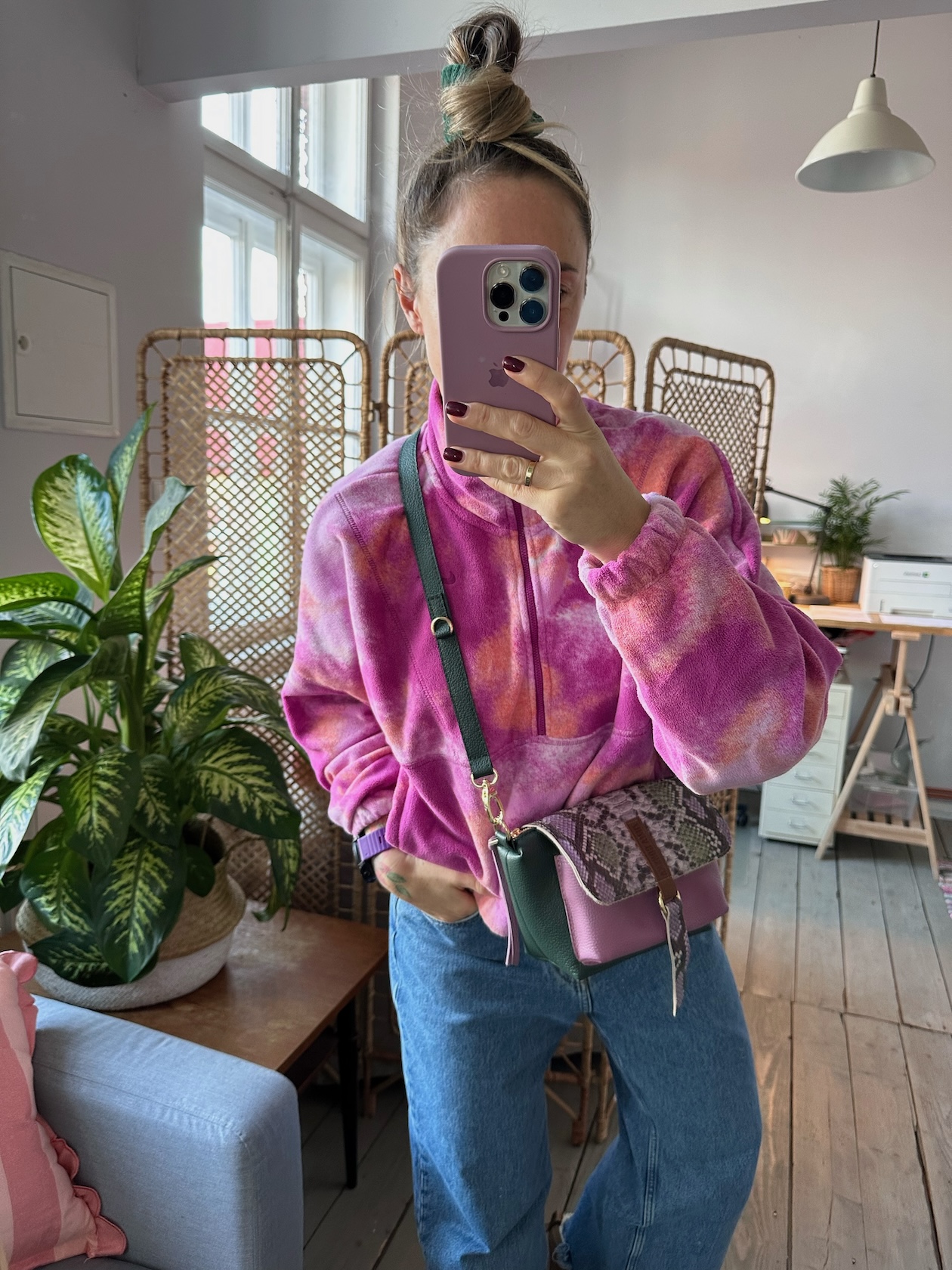 Na zewnątrz naszyta kieszonka idealna na telefon, zamykana na magnes.
