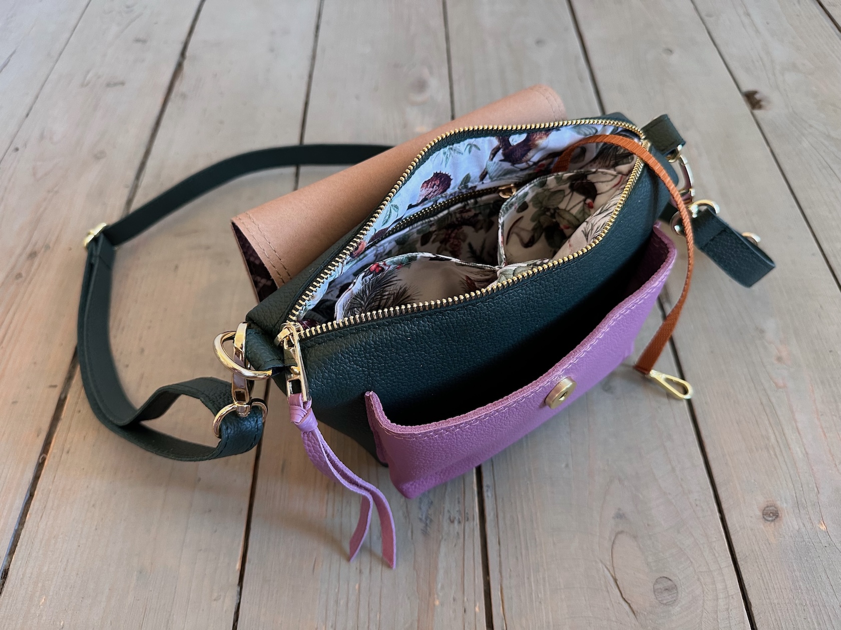Wewnątrz kieszonka na zamek, dwie kieszonki wsuwki oraz smyczka z karabińczykiem.