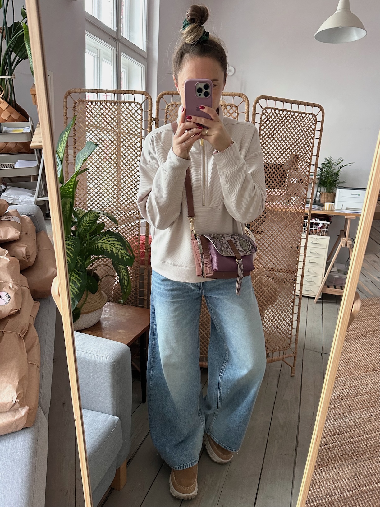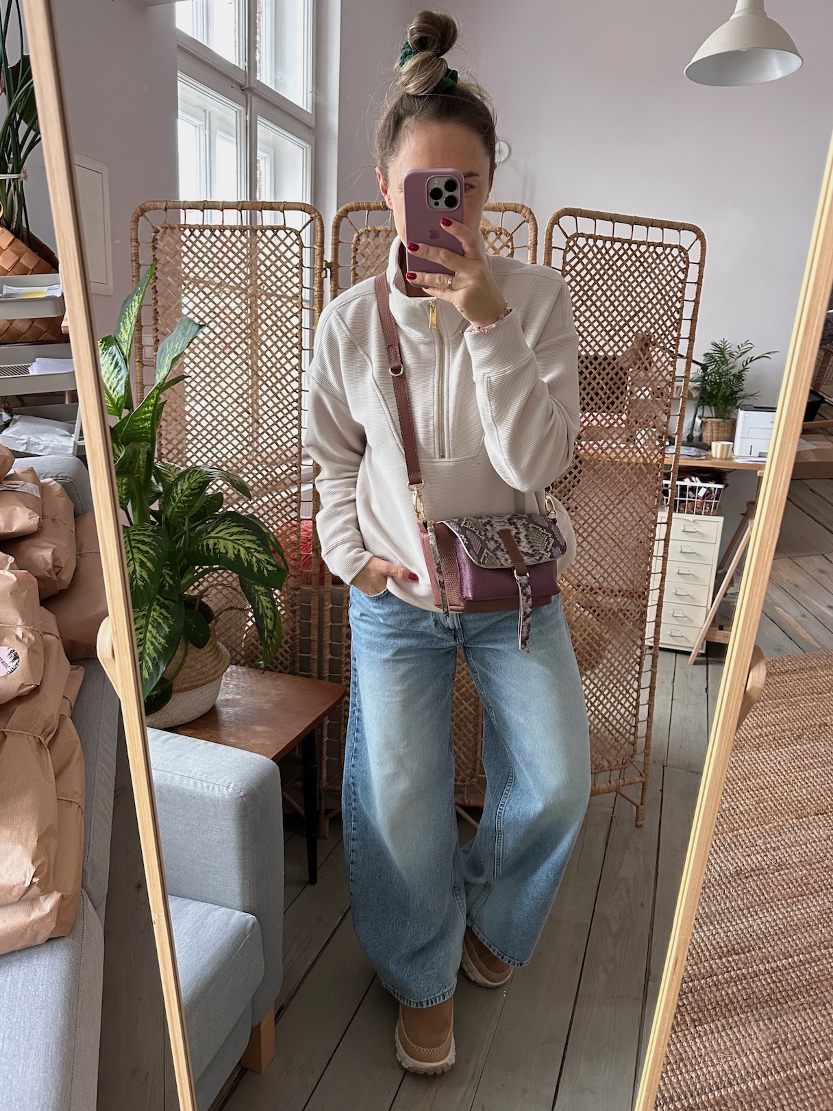 Na zewnątrz naszyta kieszonka idealna na telefon, zamykana na magnes.