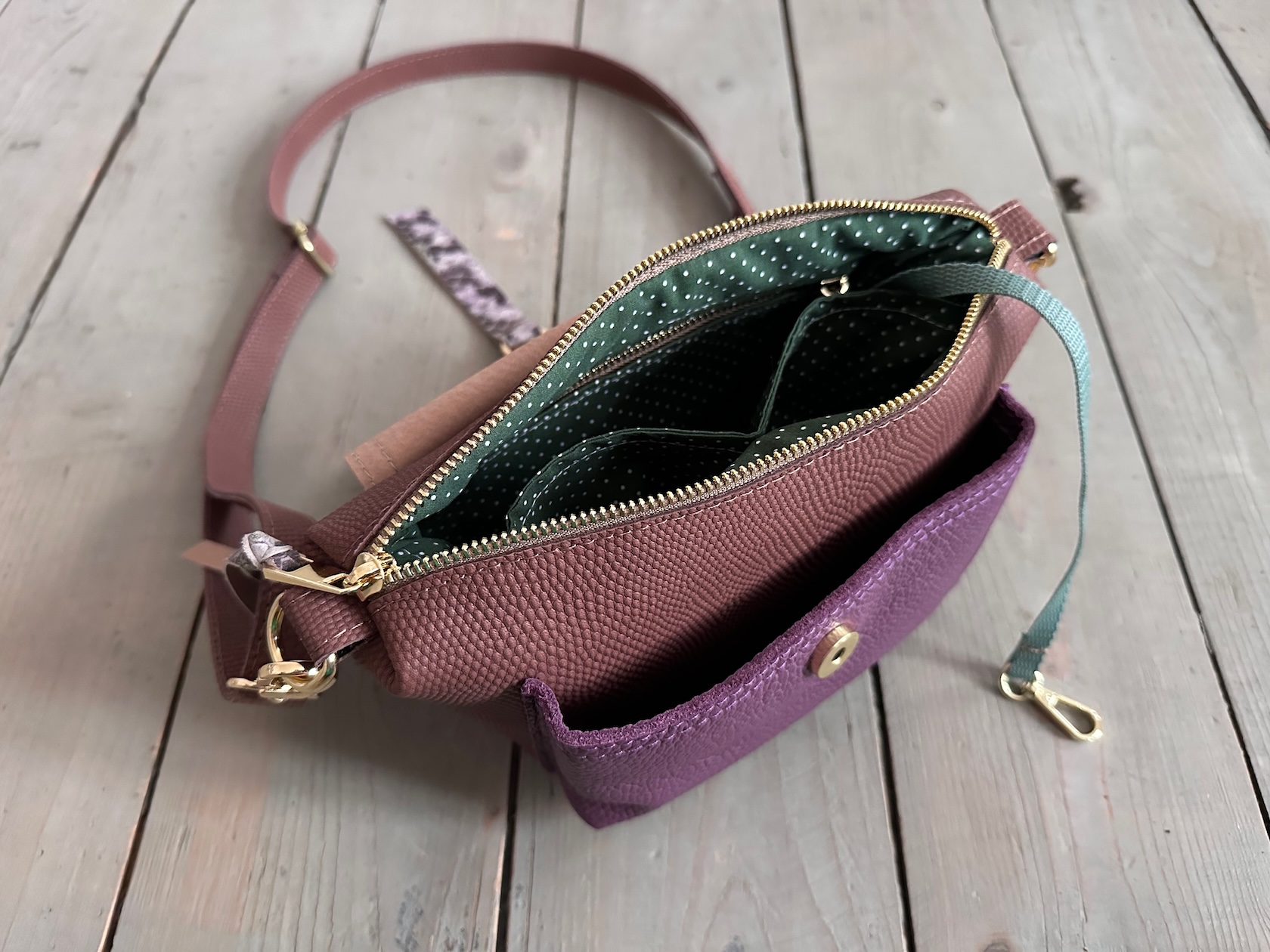 Wewnątrz kieszonka na zamek, dwie kieszonki wsuwki oraz smyczka z karabińczykiem.