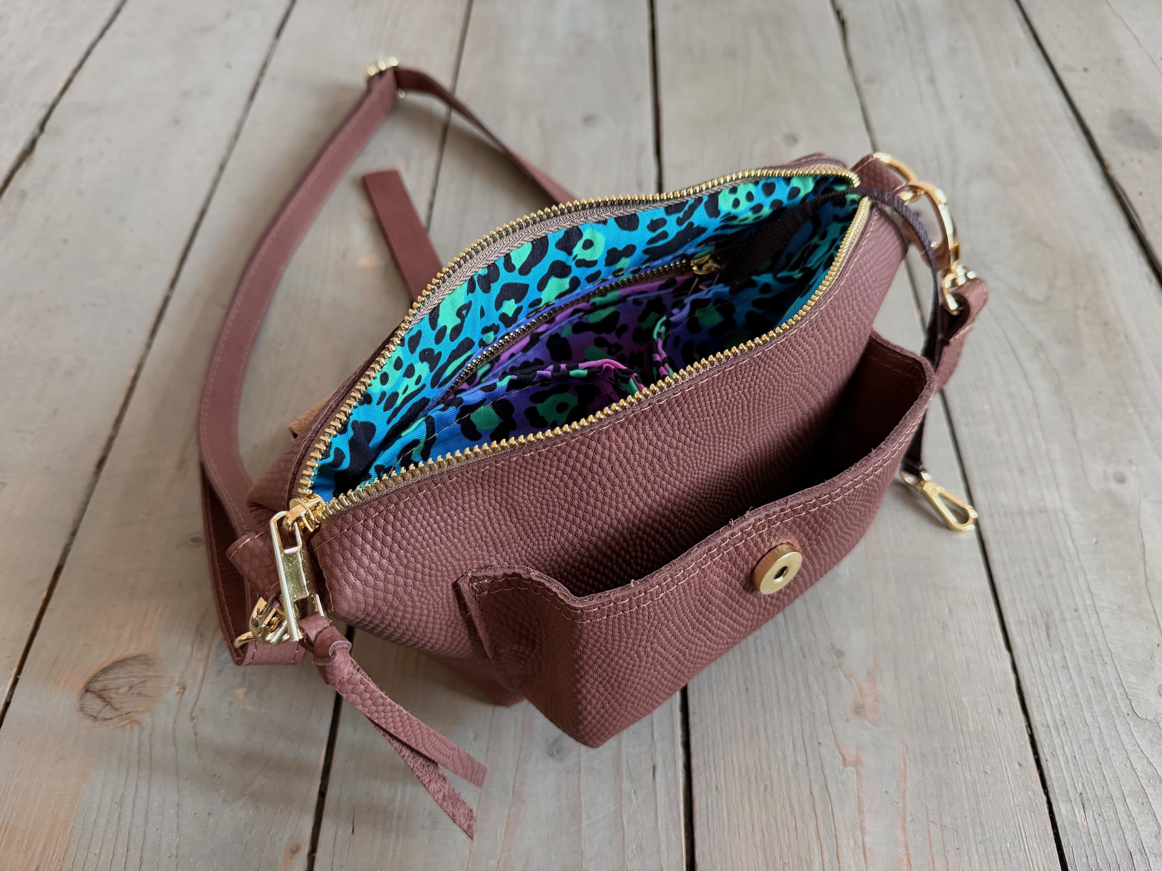 Uszyta ze skóry naturalnej licowej + welurowej + bawełnianej podszewki.