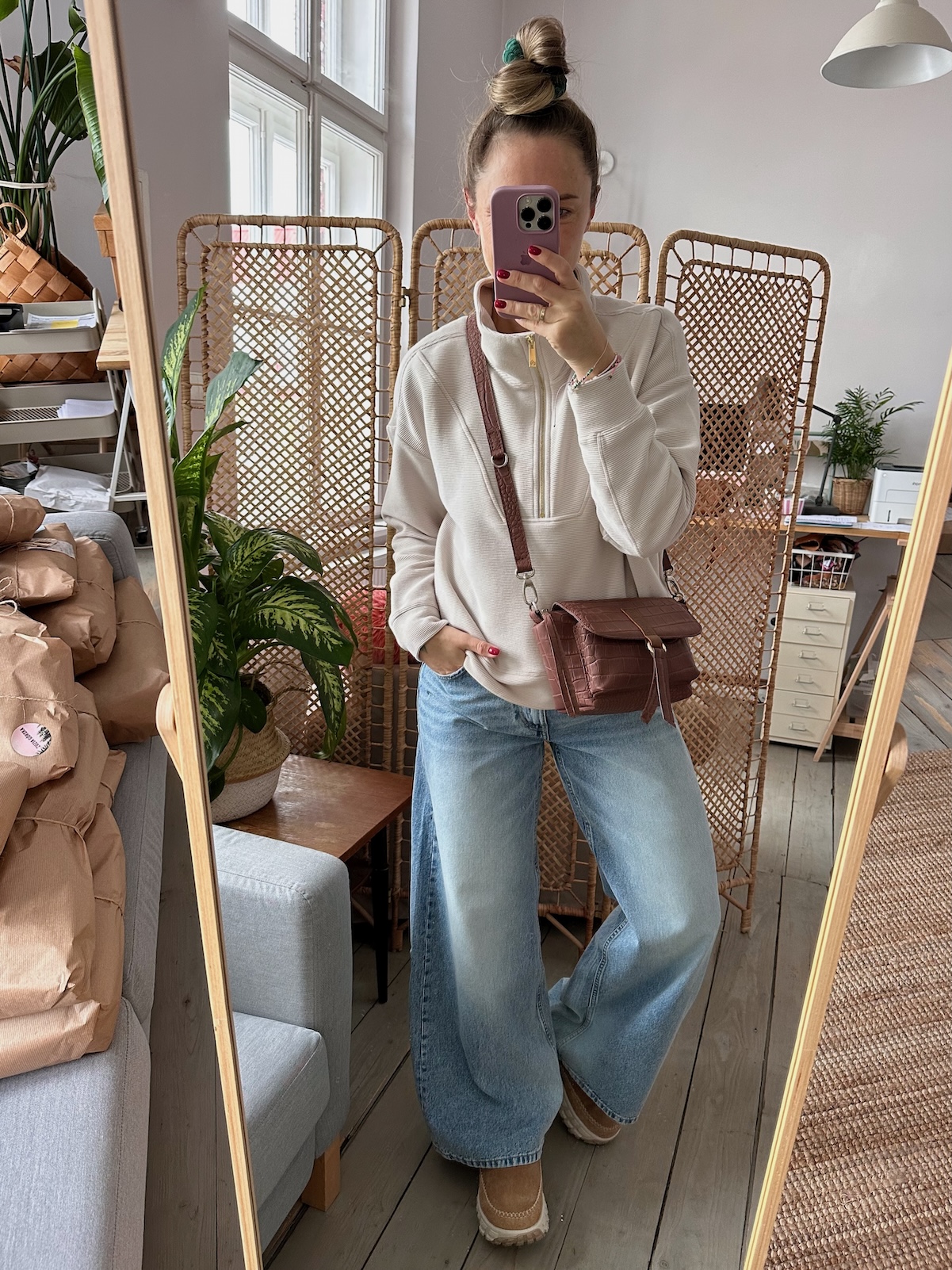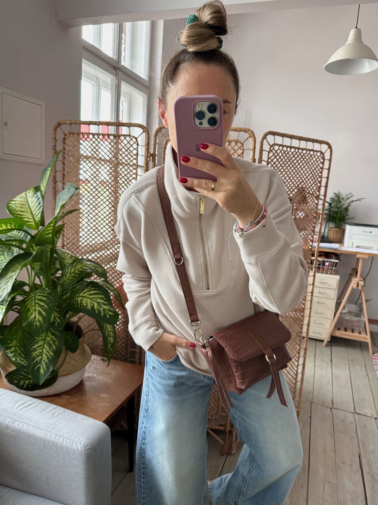 Na zewnątrz naszyta kieszonka idealna na telefon, zamykana na magnes.