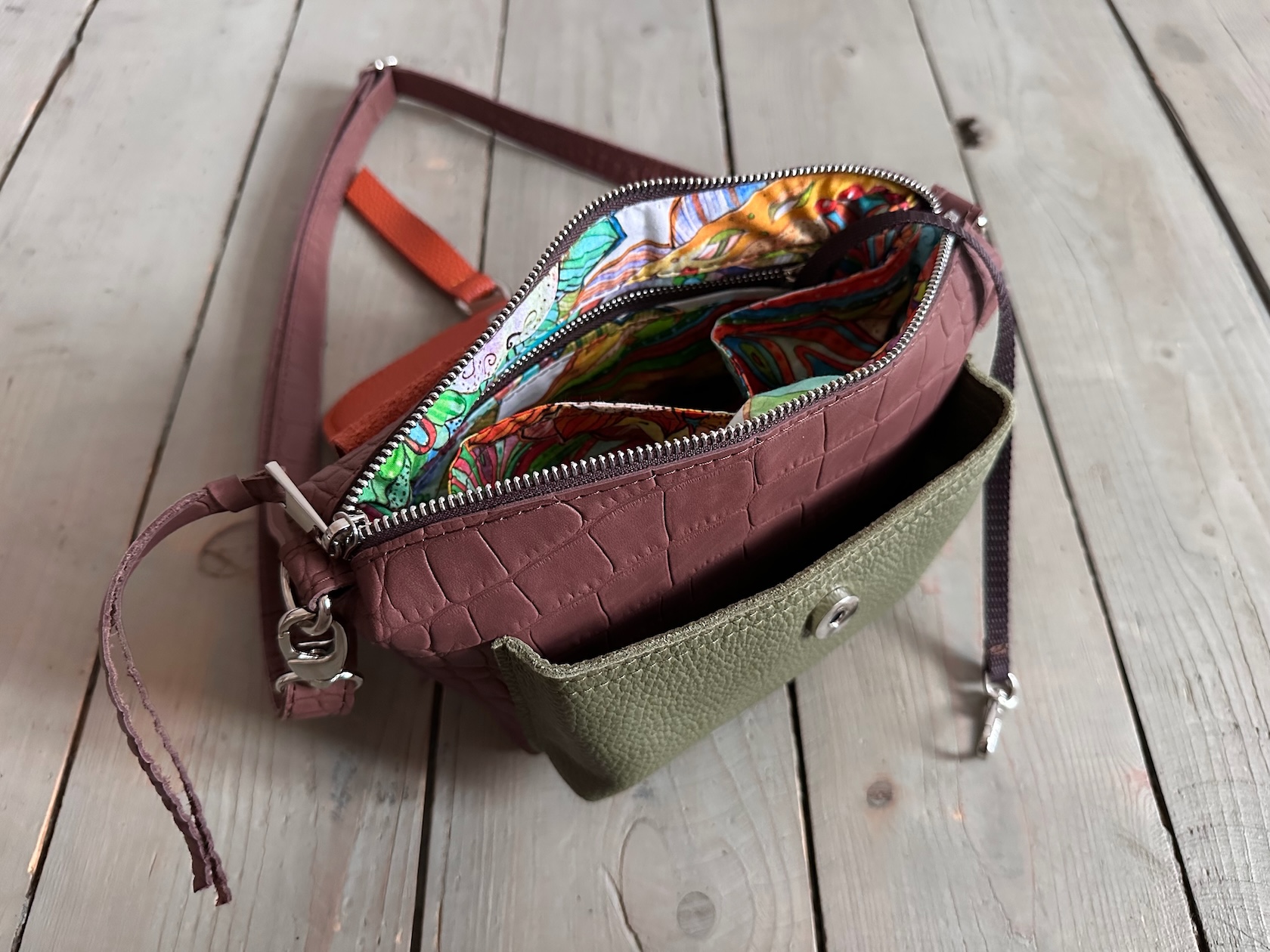 Wewnątrz kieszonka na zamek, dwie kieszonki wsuwki oraz smyczka z karabińczykiem.