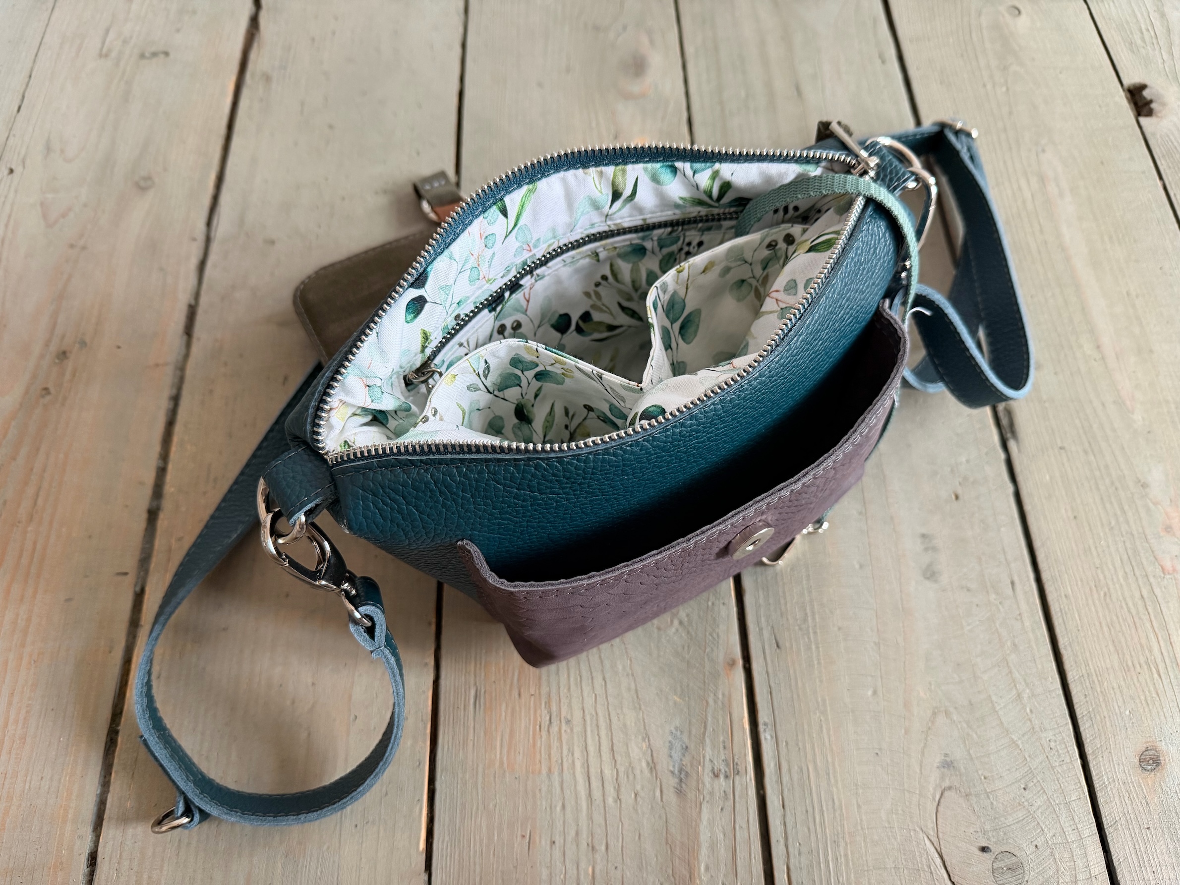 Uszyta ze skóry naturalnej licowej + nubukowej + welurowej + bawełnianej podszewki.