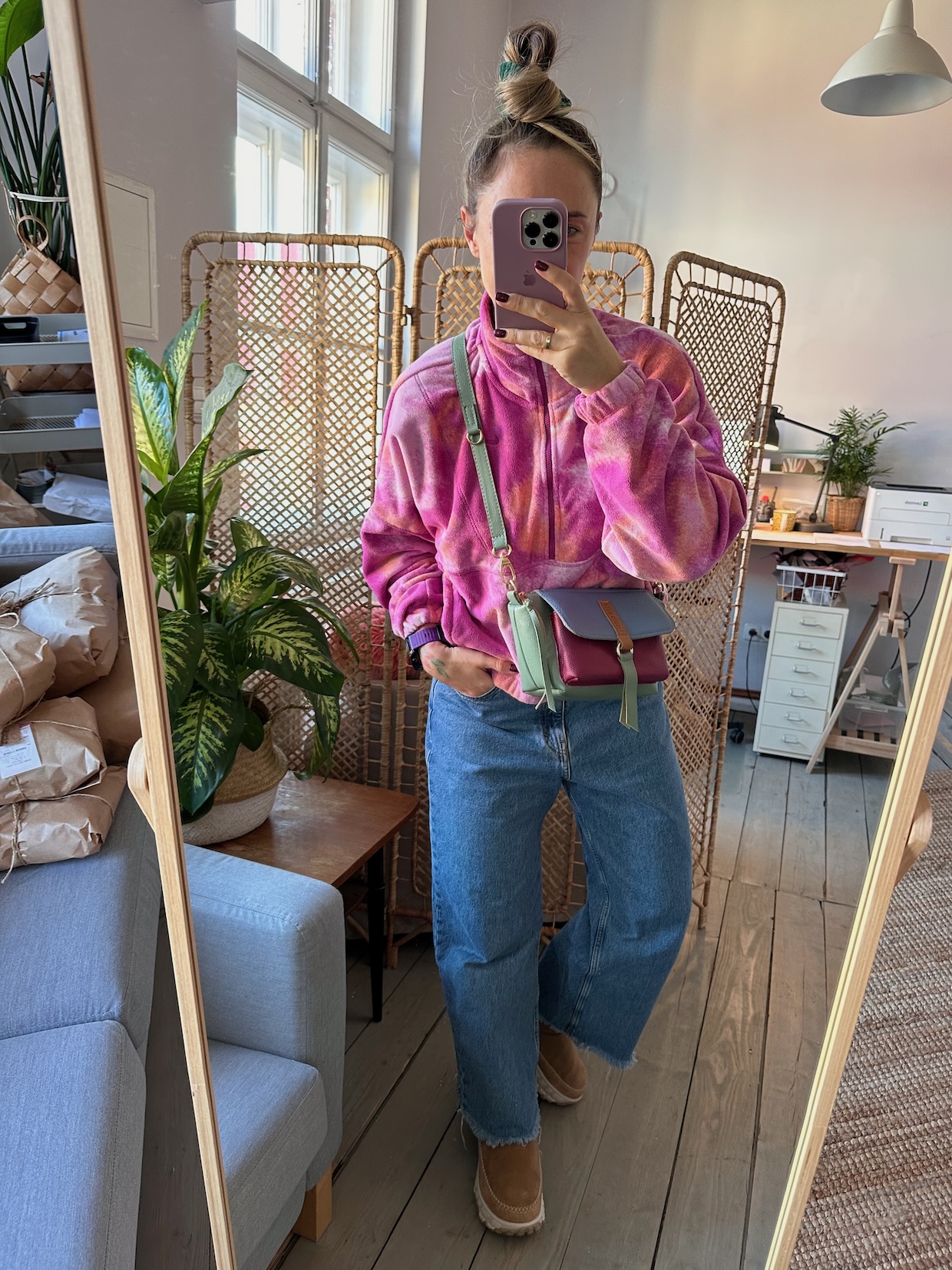Na zewnątrz naszyta kieszonka idealna na telefon, zamykana na magnes.