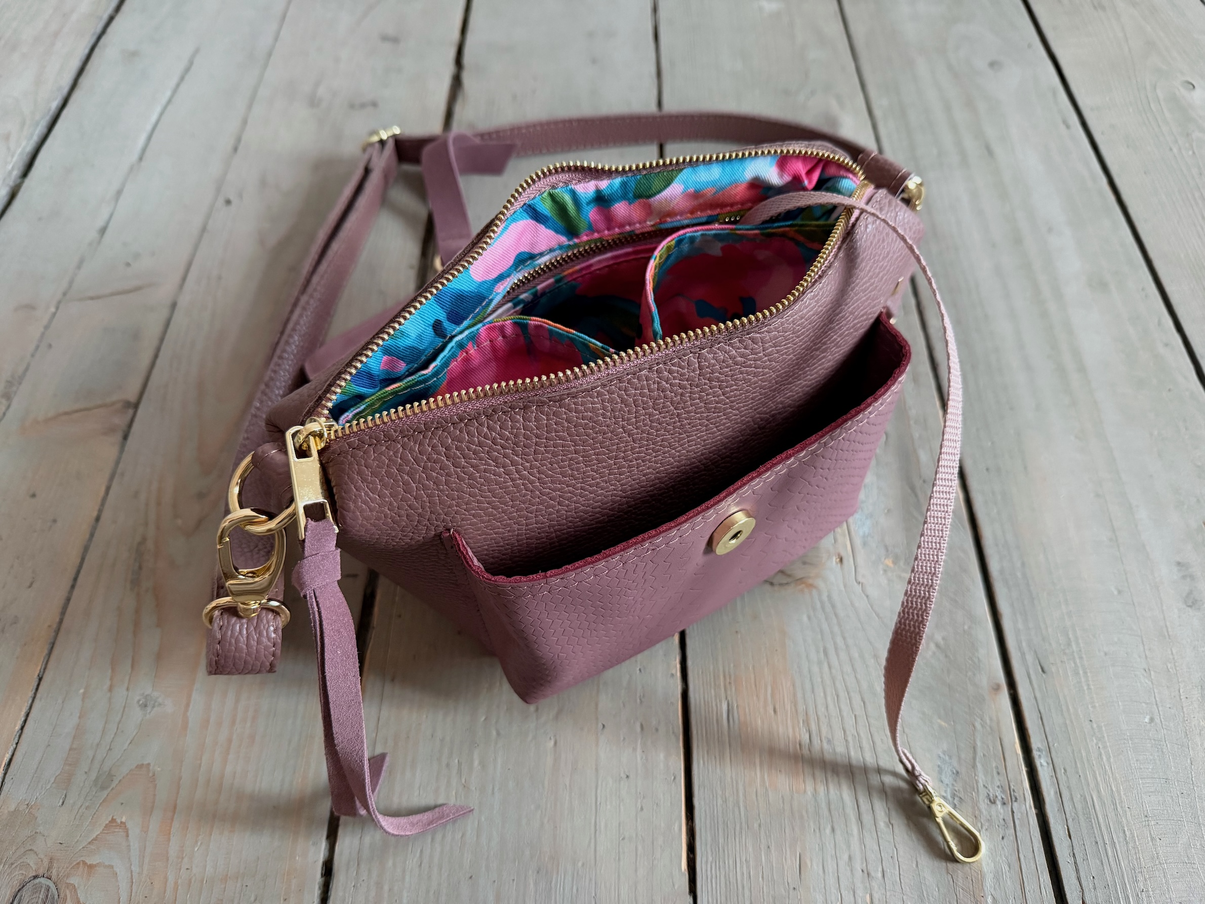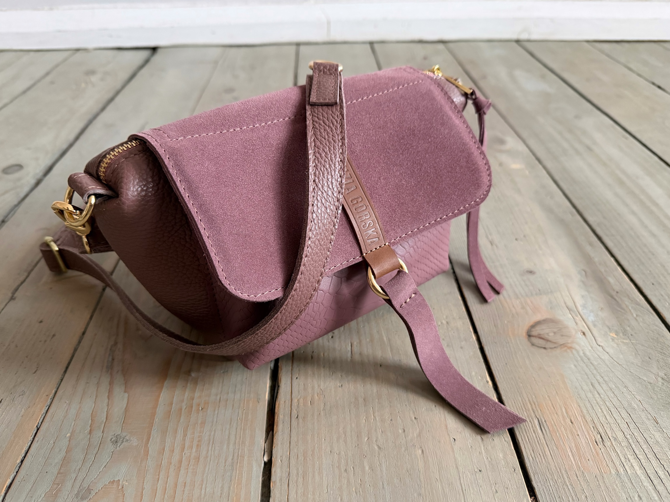 Uszyta ze skóry naturalnej licowej + welurowej + bawełnianej podszewki.