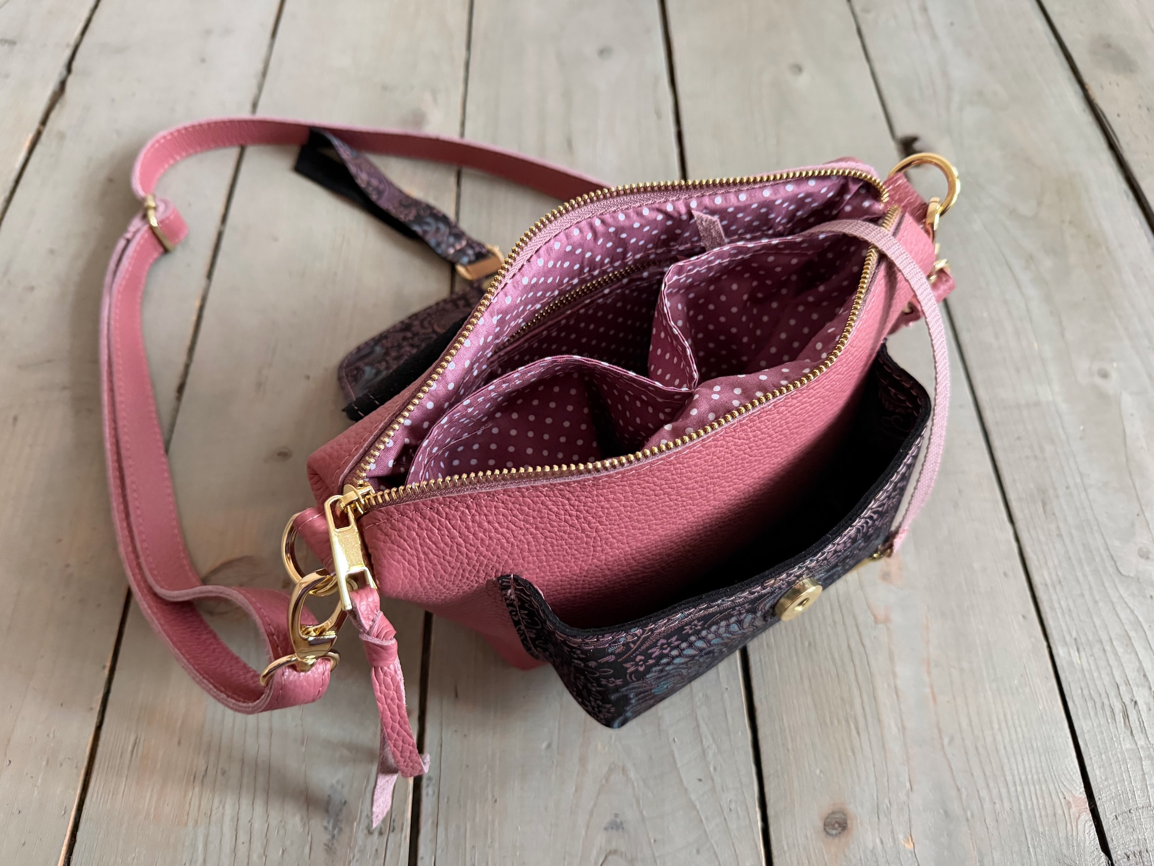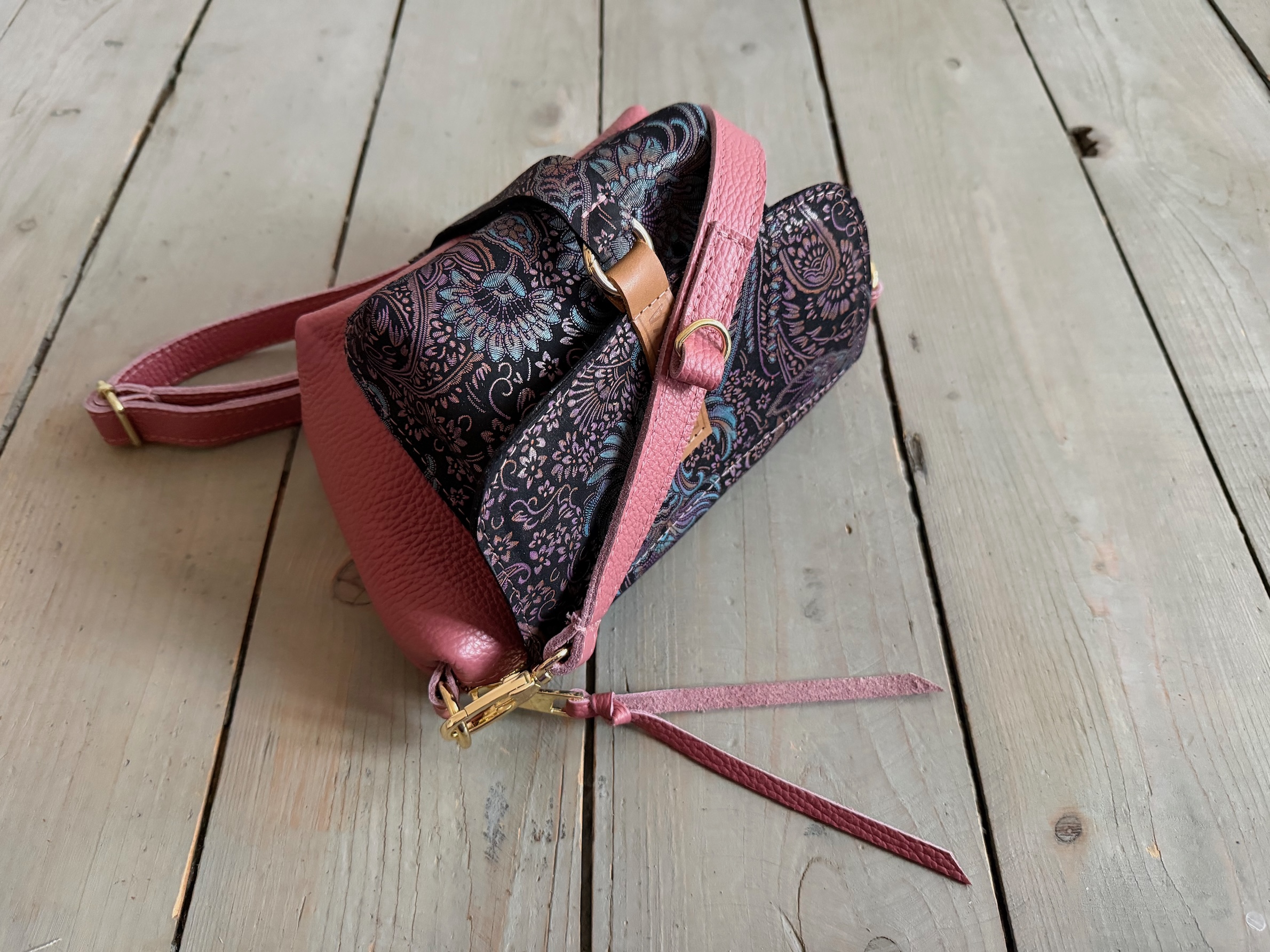 Uszyta ze skóry naturalnej licowej + nubukowej + bawełnianej podszewki.
