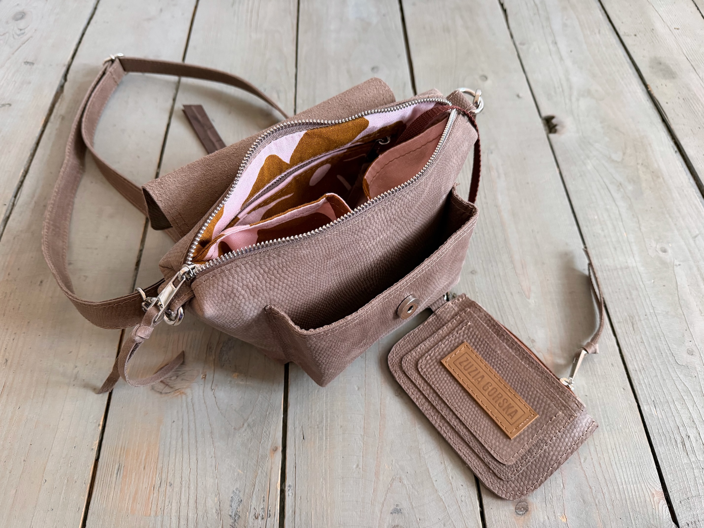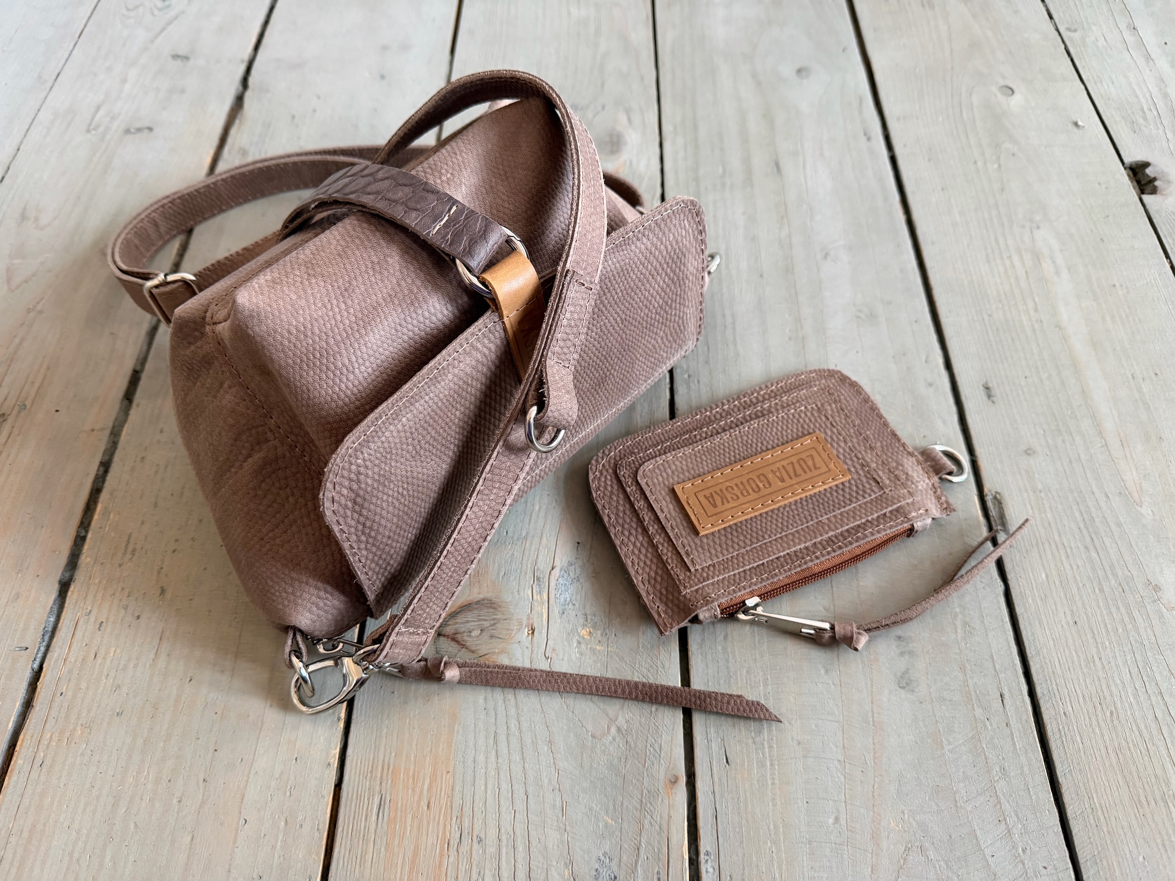 Uszyta ze skóry naturalnej typu pull up woskowanej + bawełnianej podszewki.