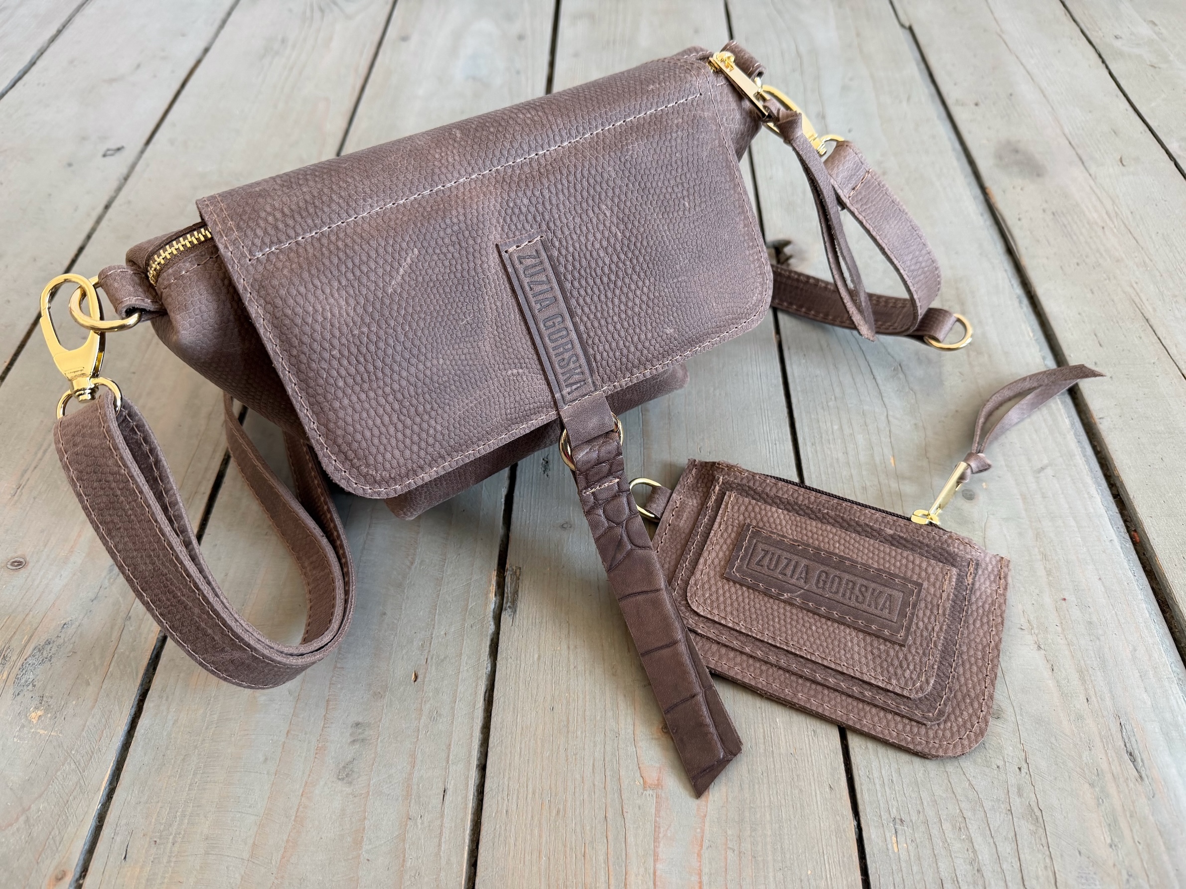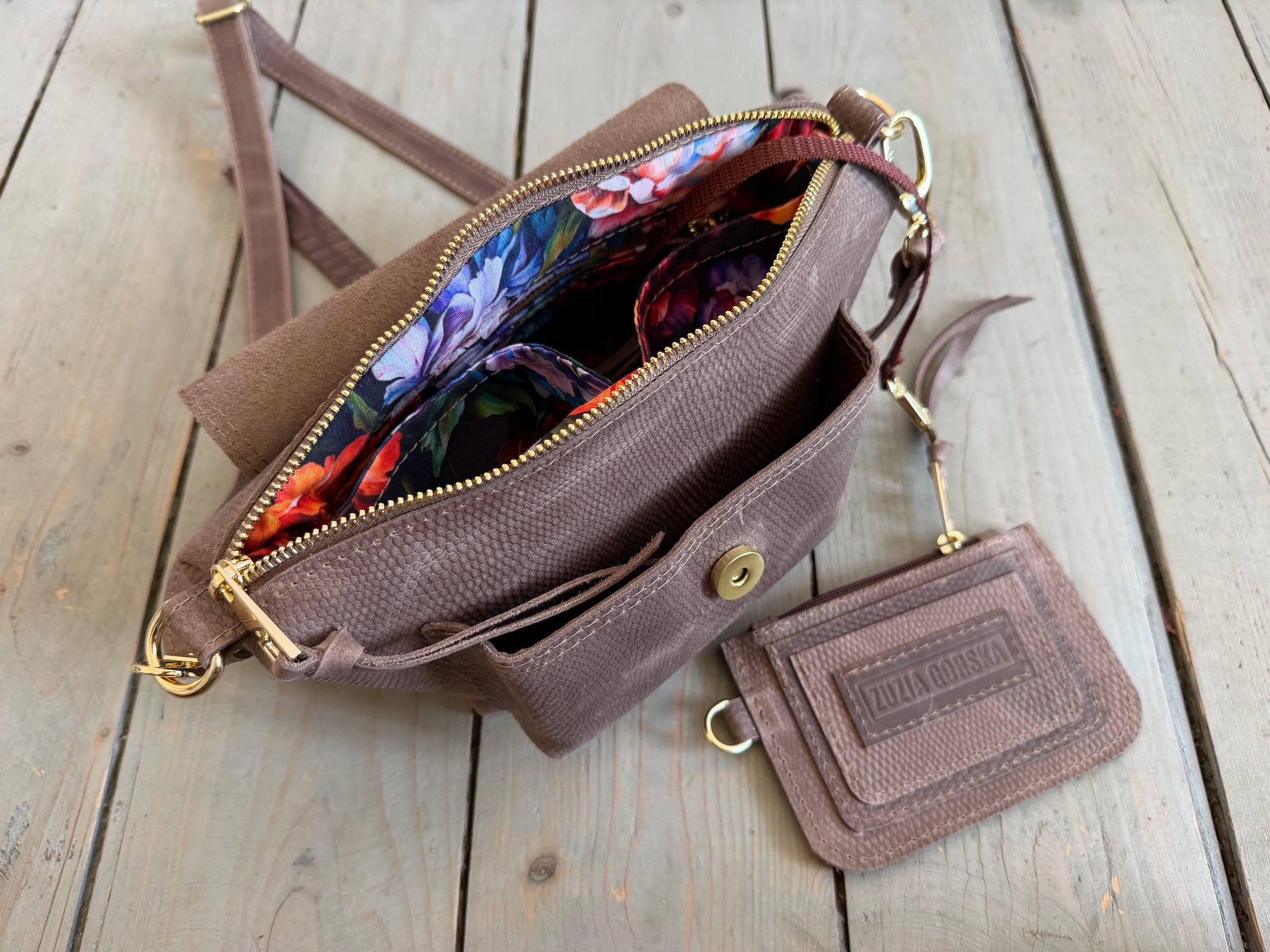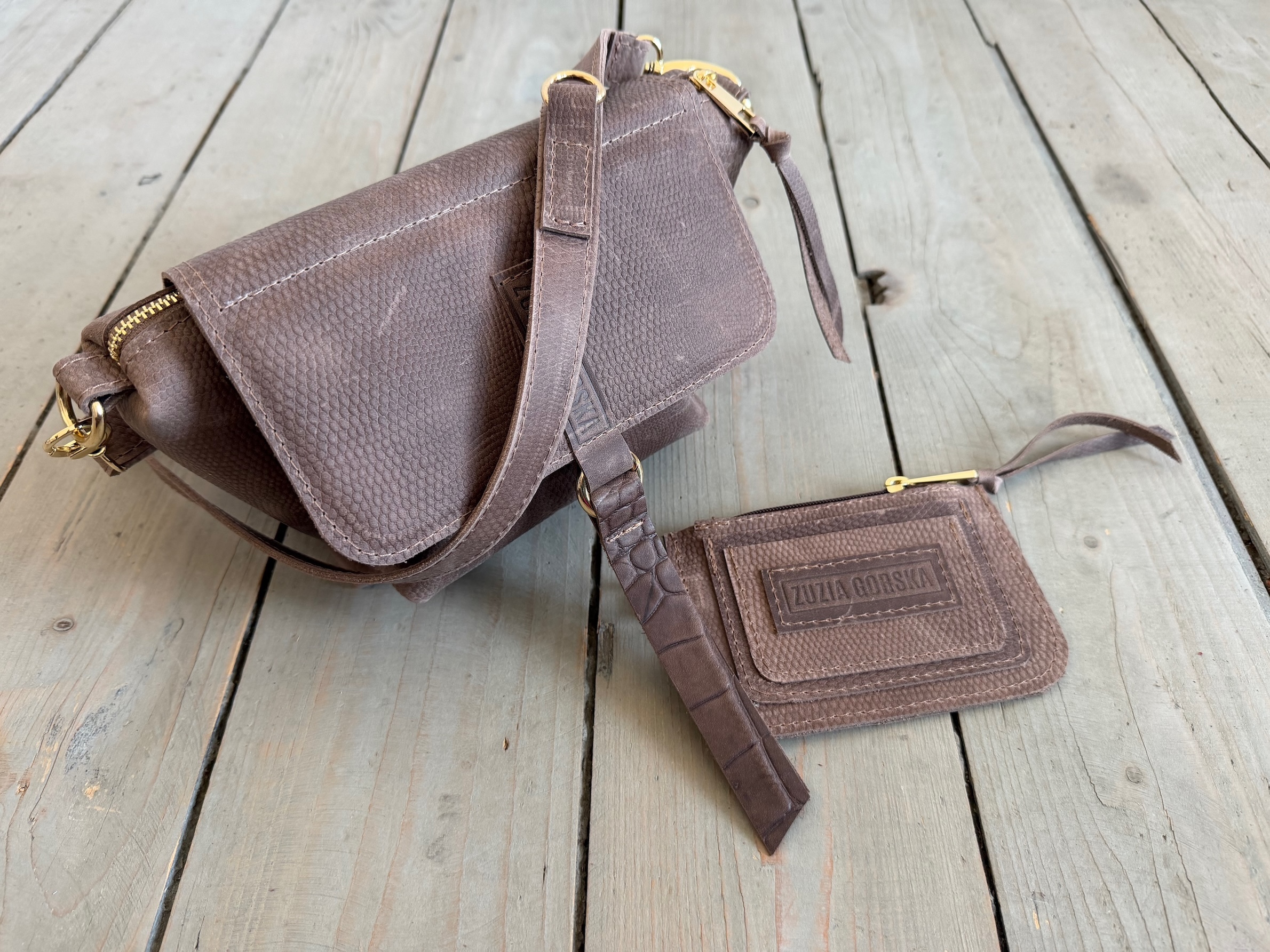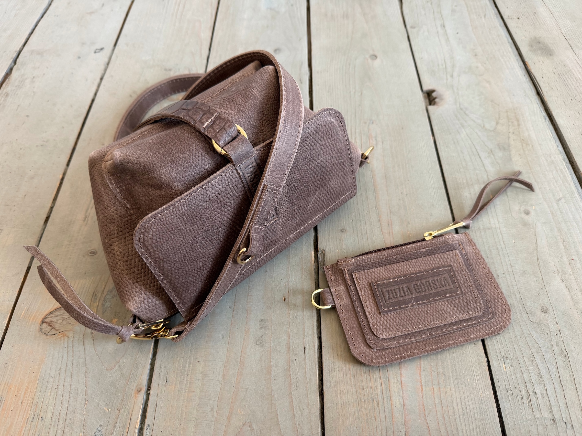 Uszyta ze skóry naturalnej typu pull up woskowanej + bawełnianej podszewki.