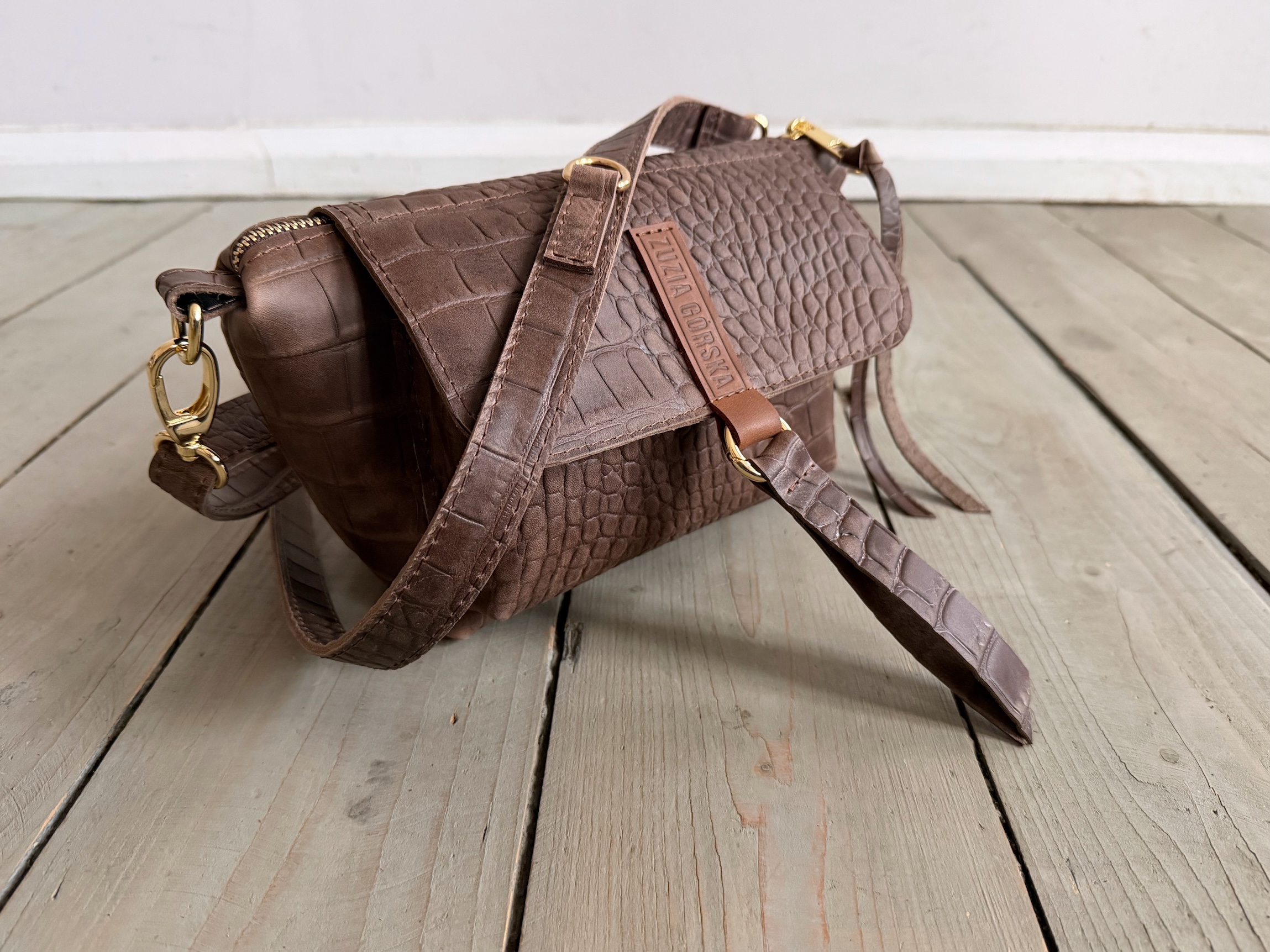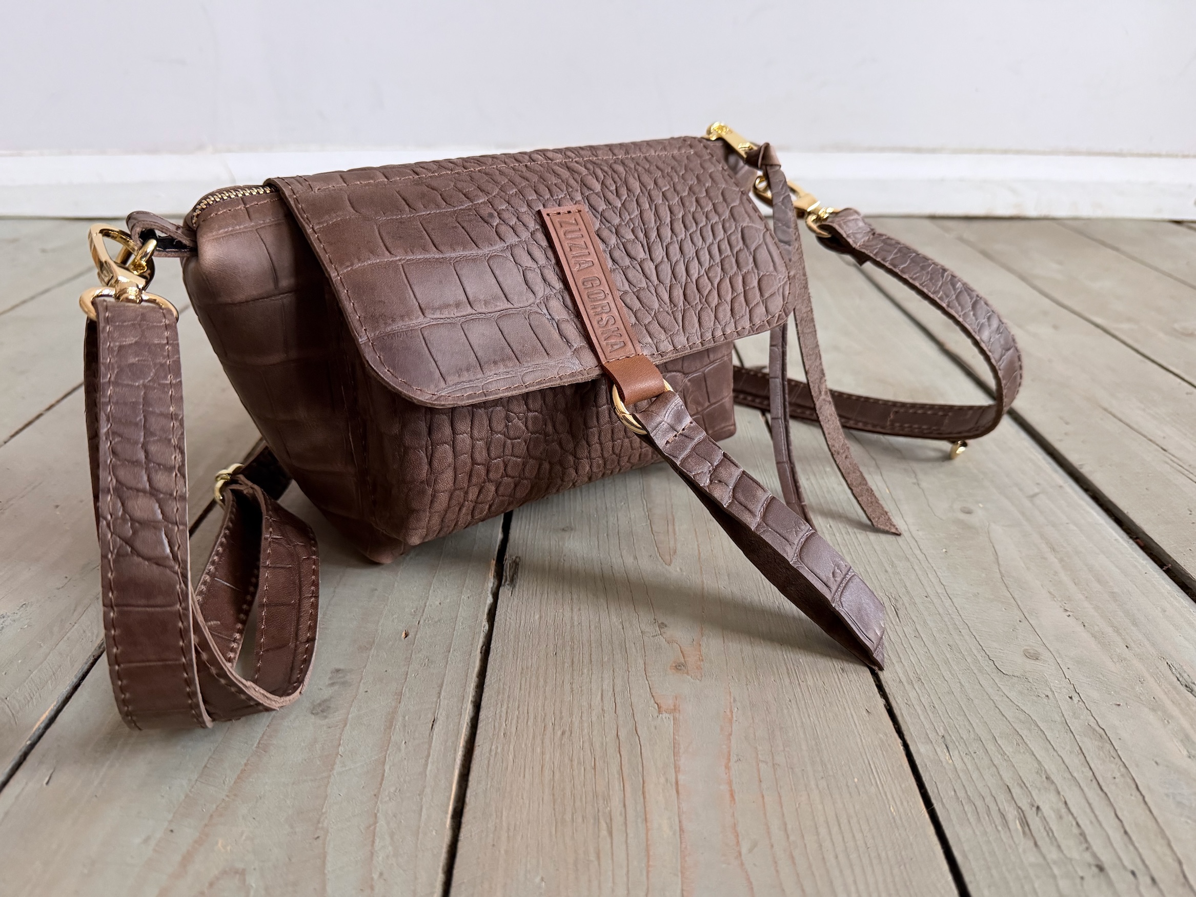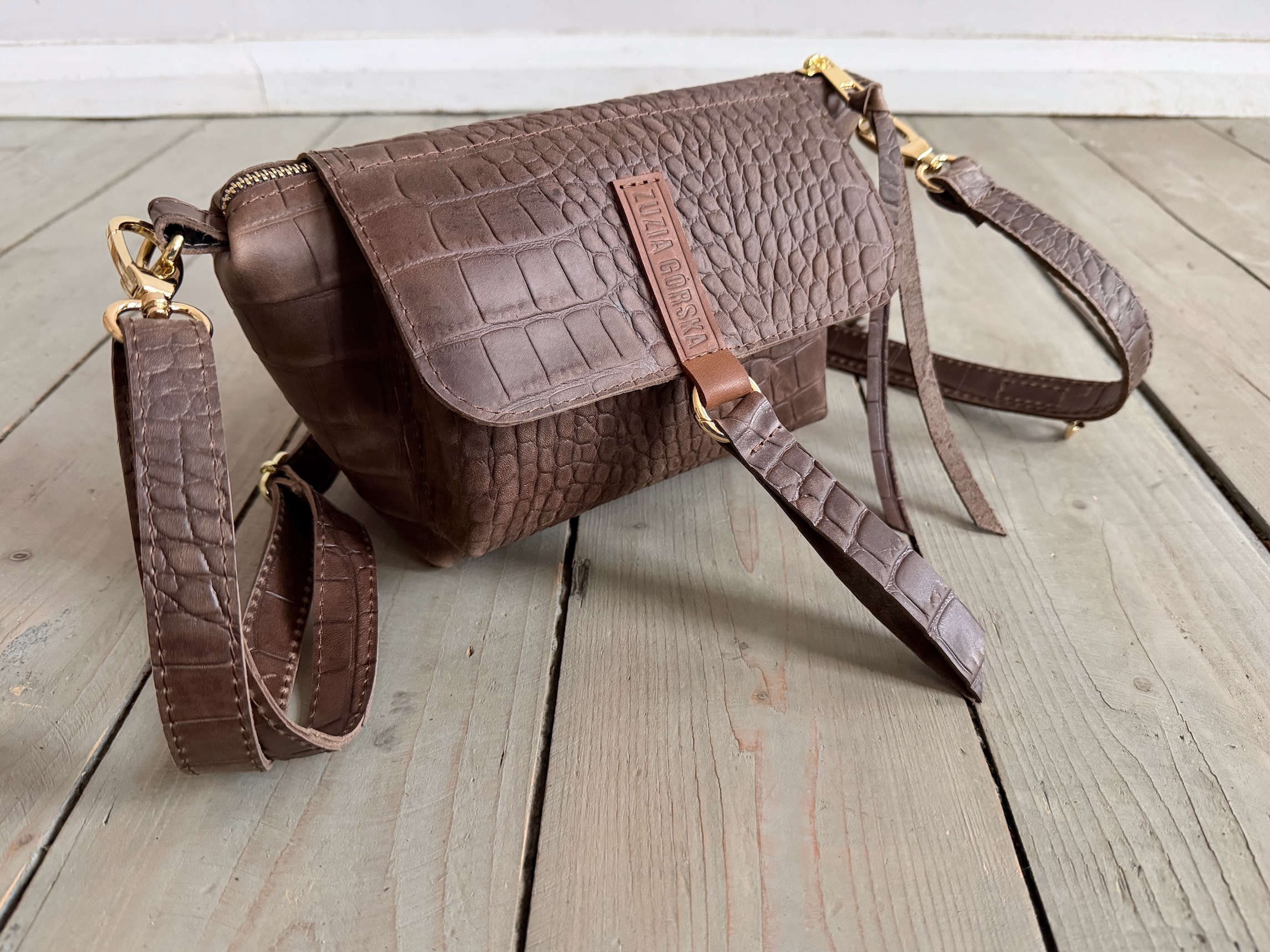 Uszyta ze skóry naturalnej typu pull up woskowanej + bawełnianej podszewki.