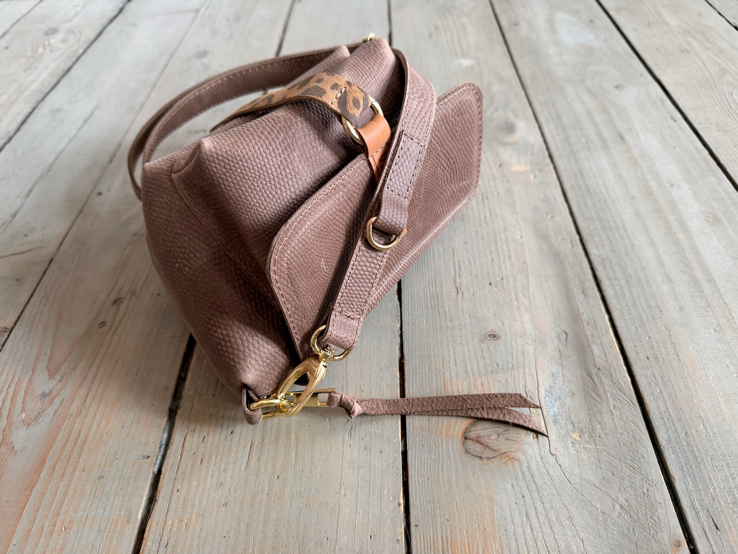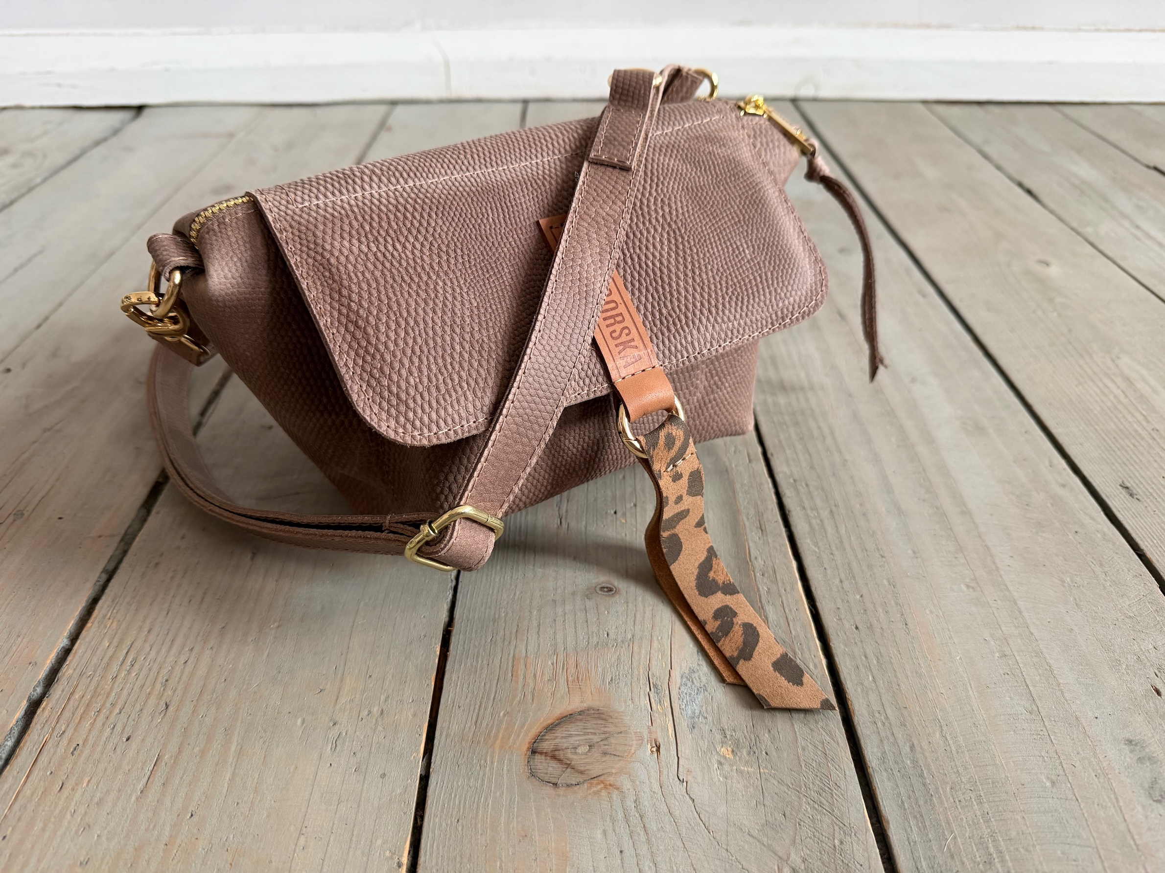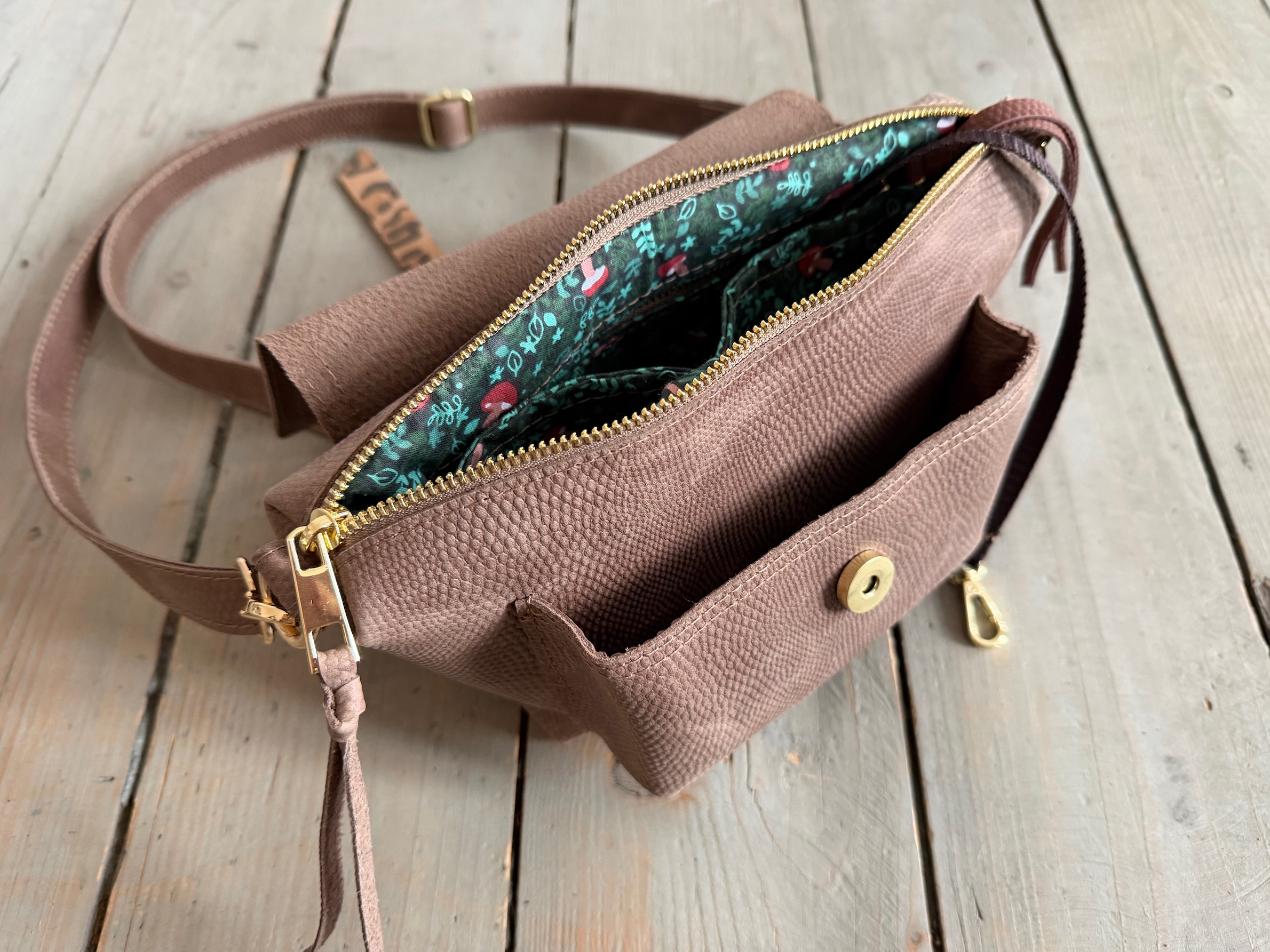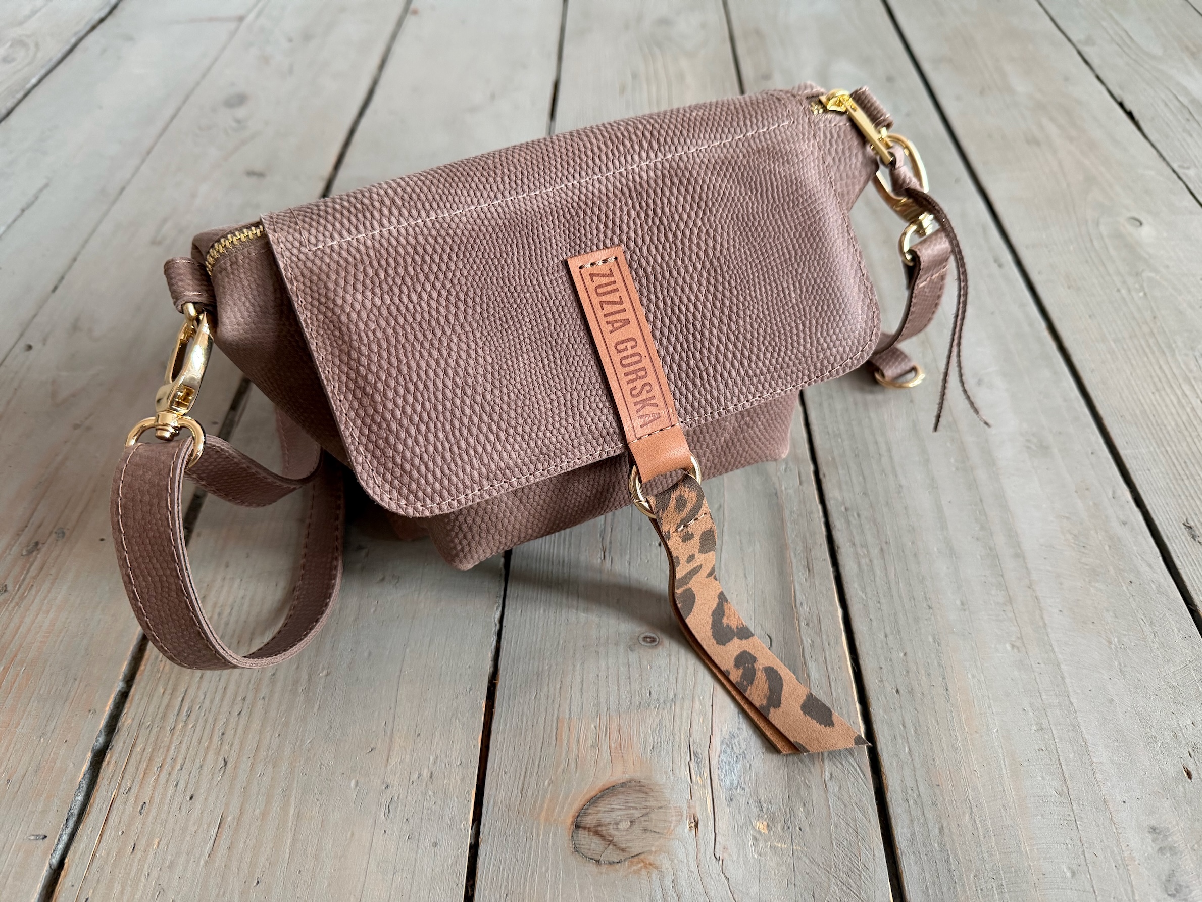 Uszyta ze skóry naturalnej typu pull up woskowanej + bawełnianej podszewki.
