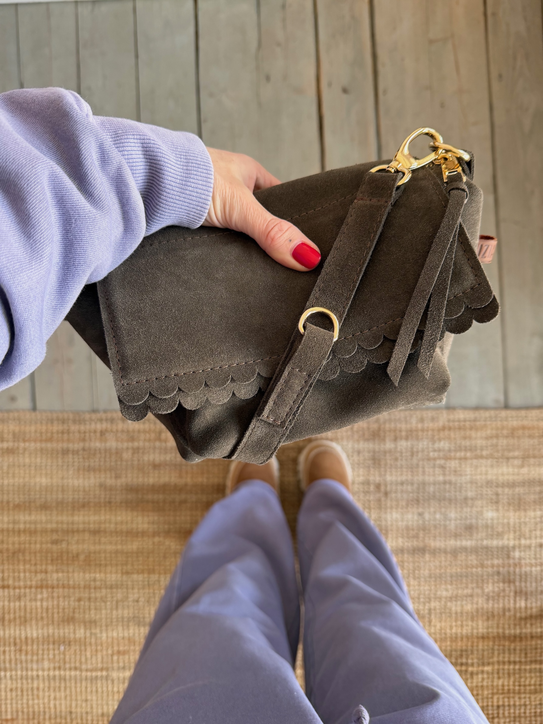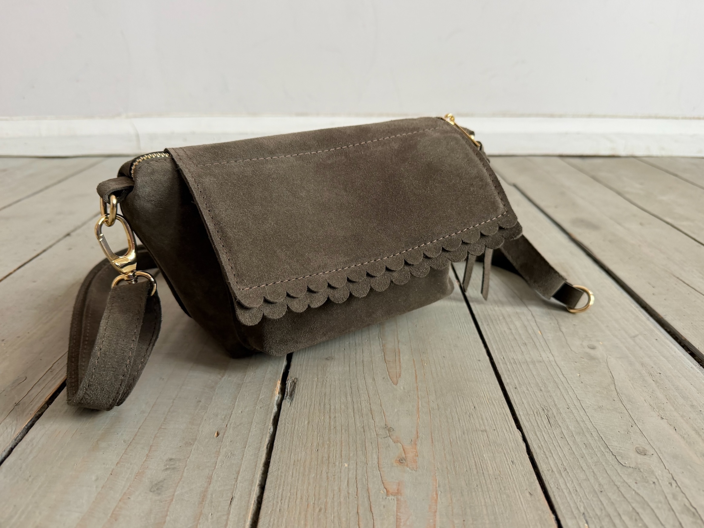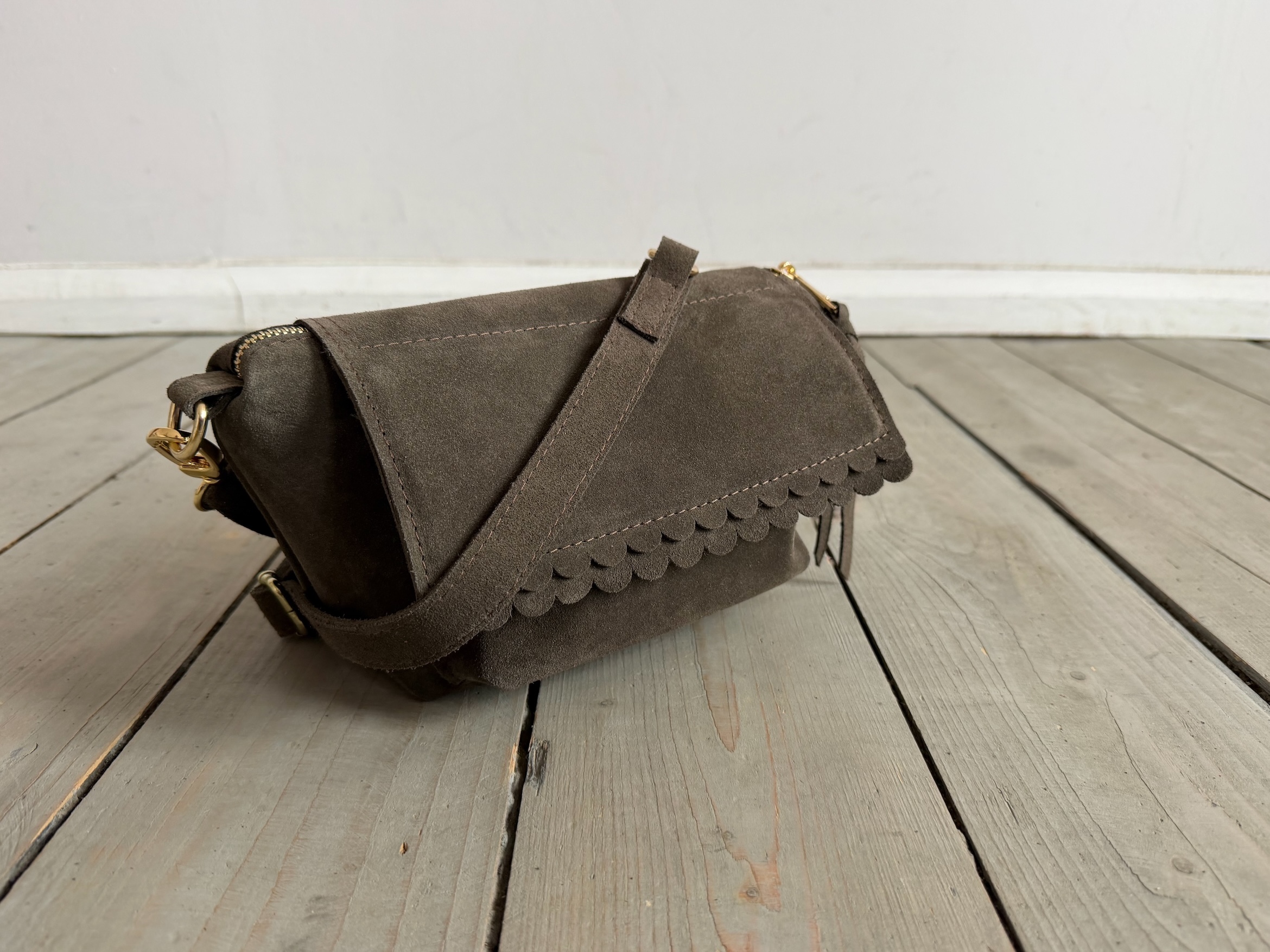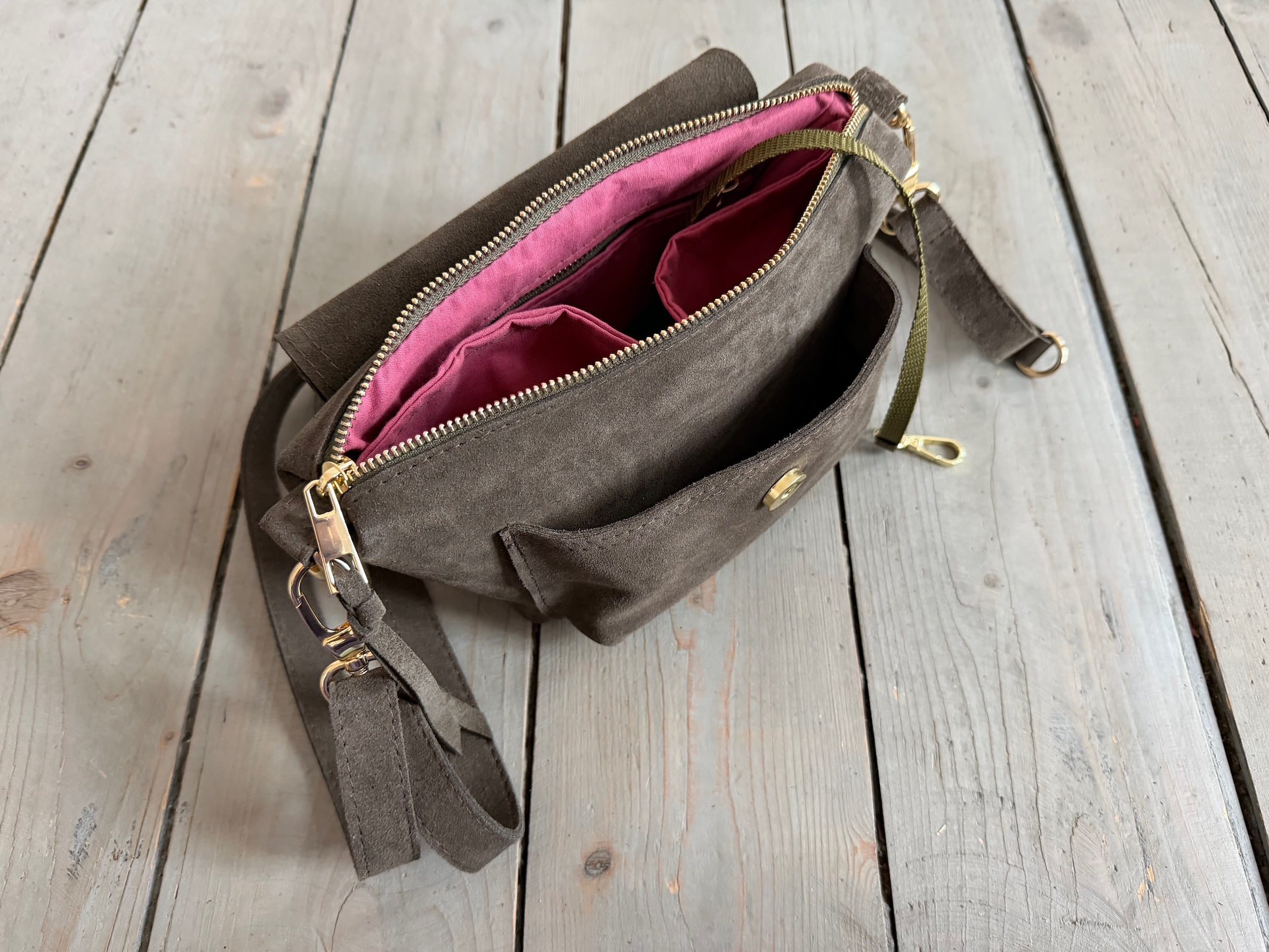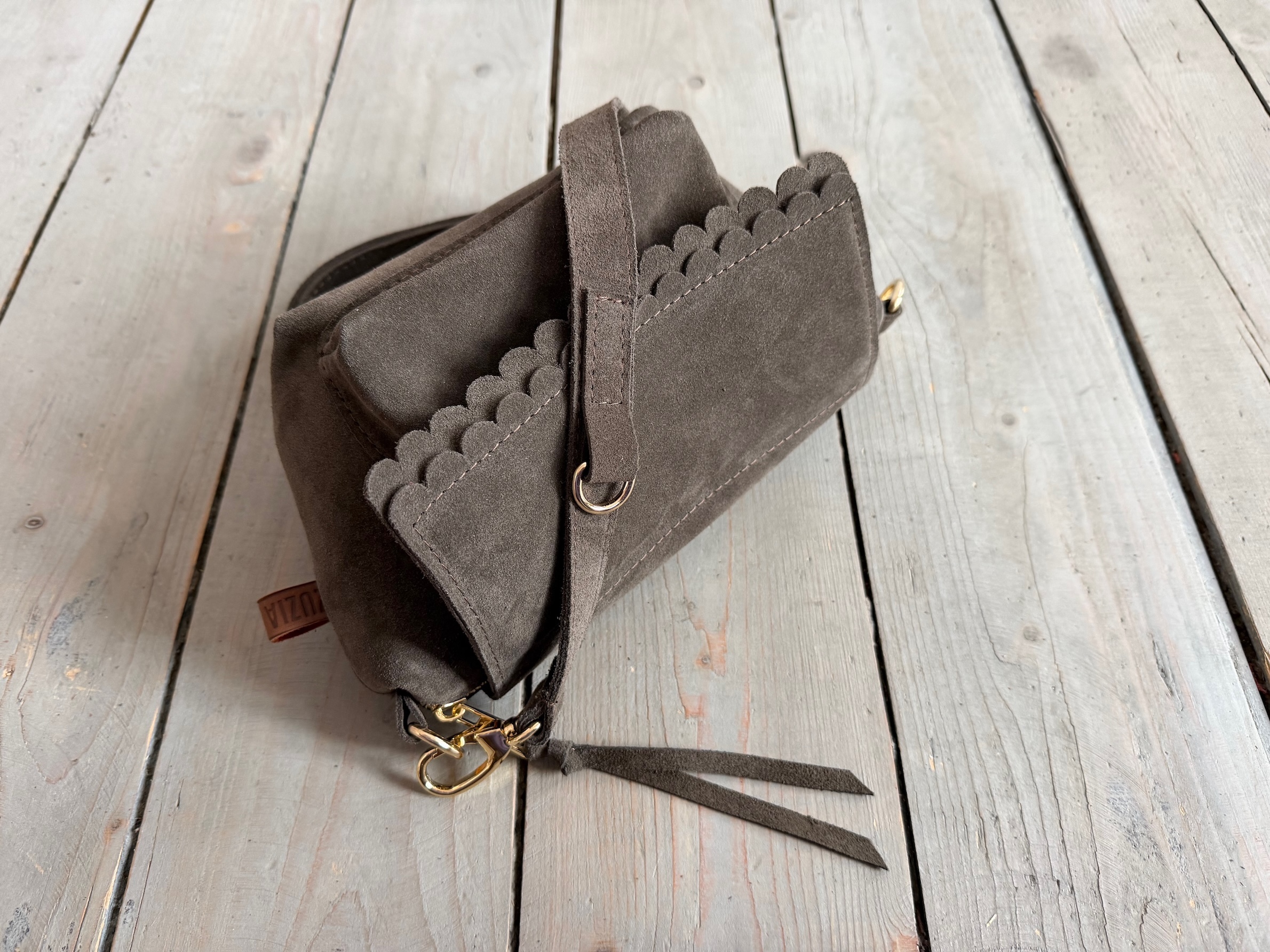 Uszyta ze skóry naturalnej welurowej + bawełnianej podszewki.
