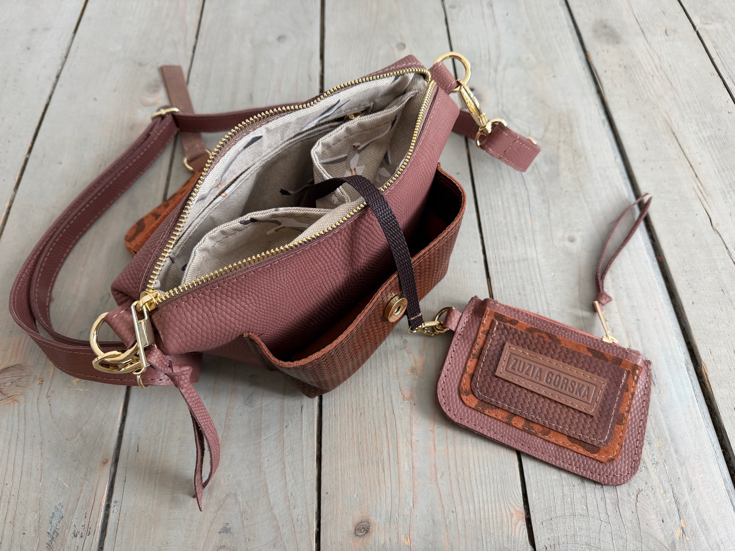 Wewnątrz kieszonka na zamek, dwie kieszonki wsuwki oraz smyczka z karabińczykiem.