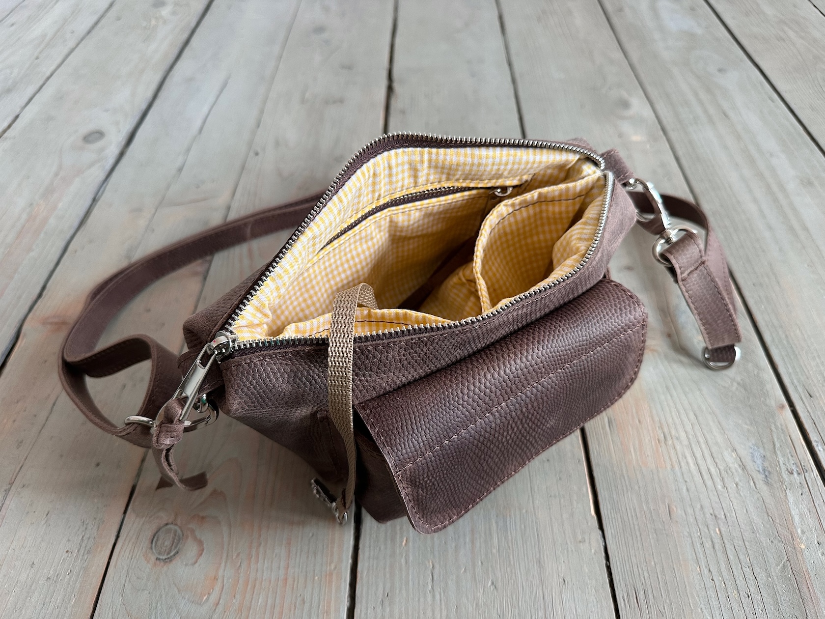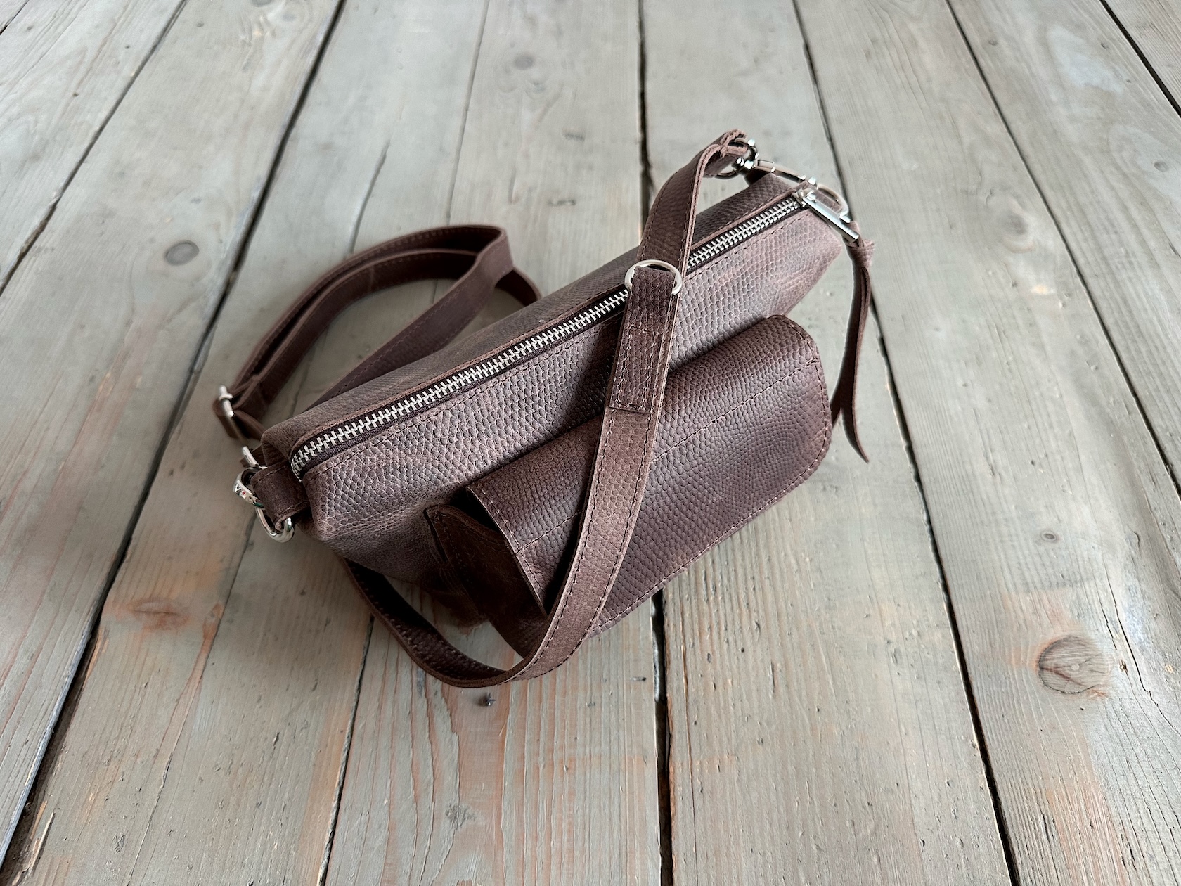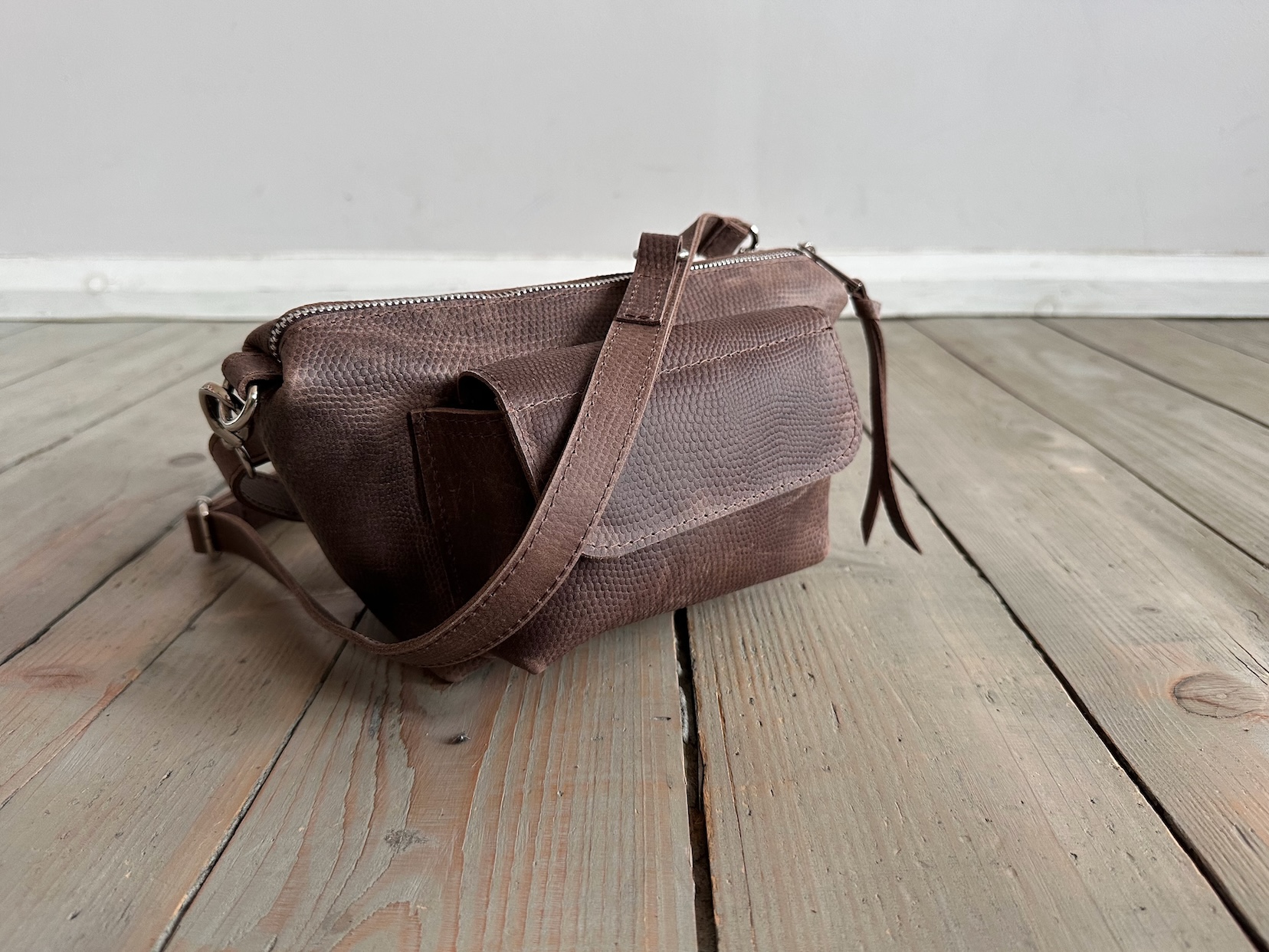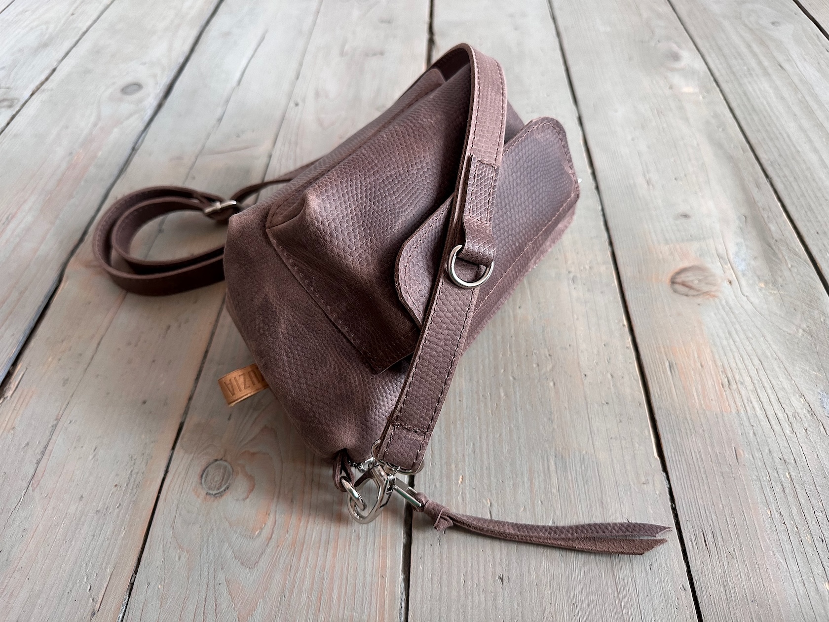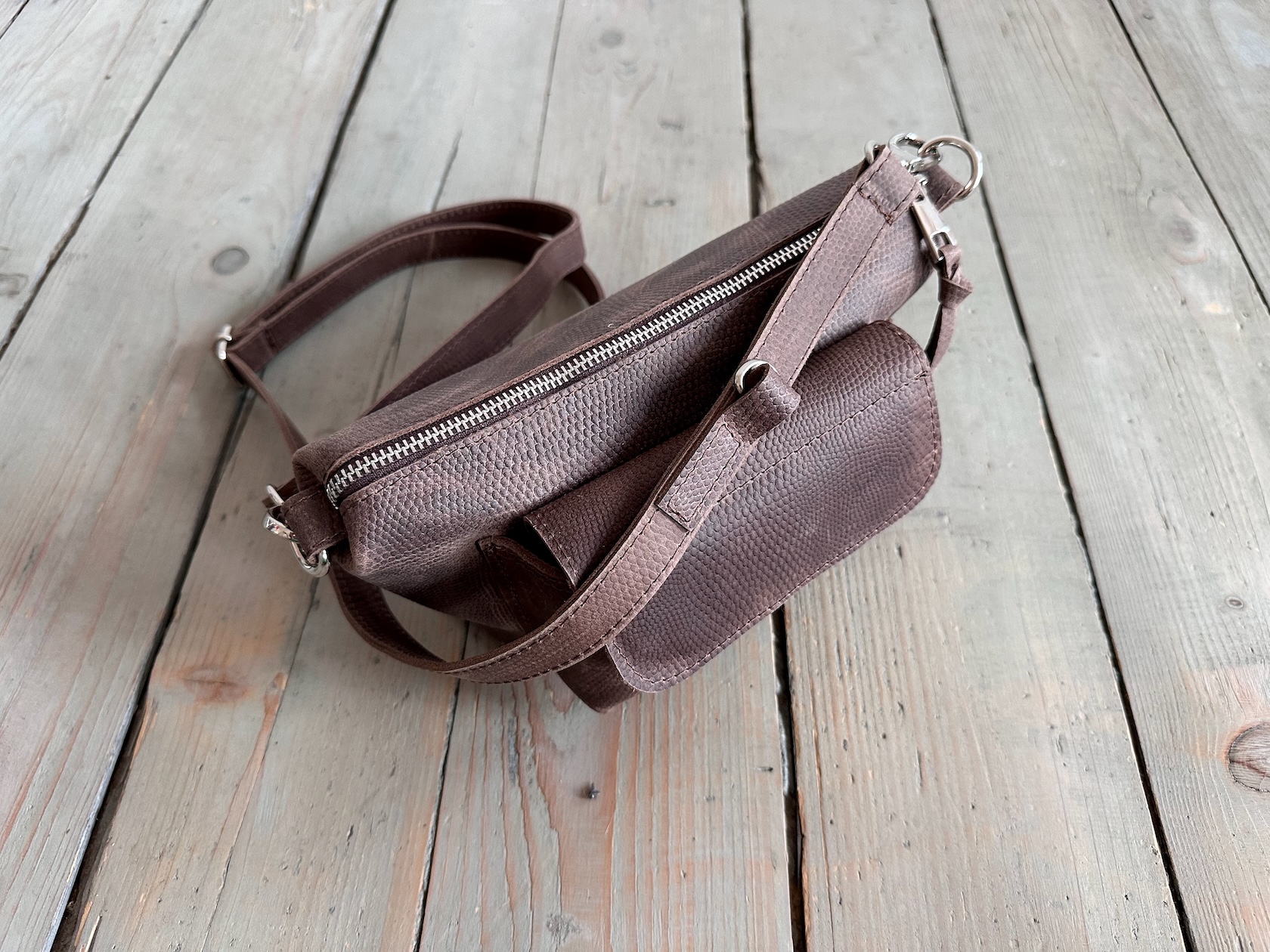 Uszyta ze skóry naturalnej typu pull-up woskowanej + bawełnianej podszewki.