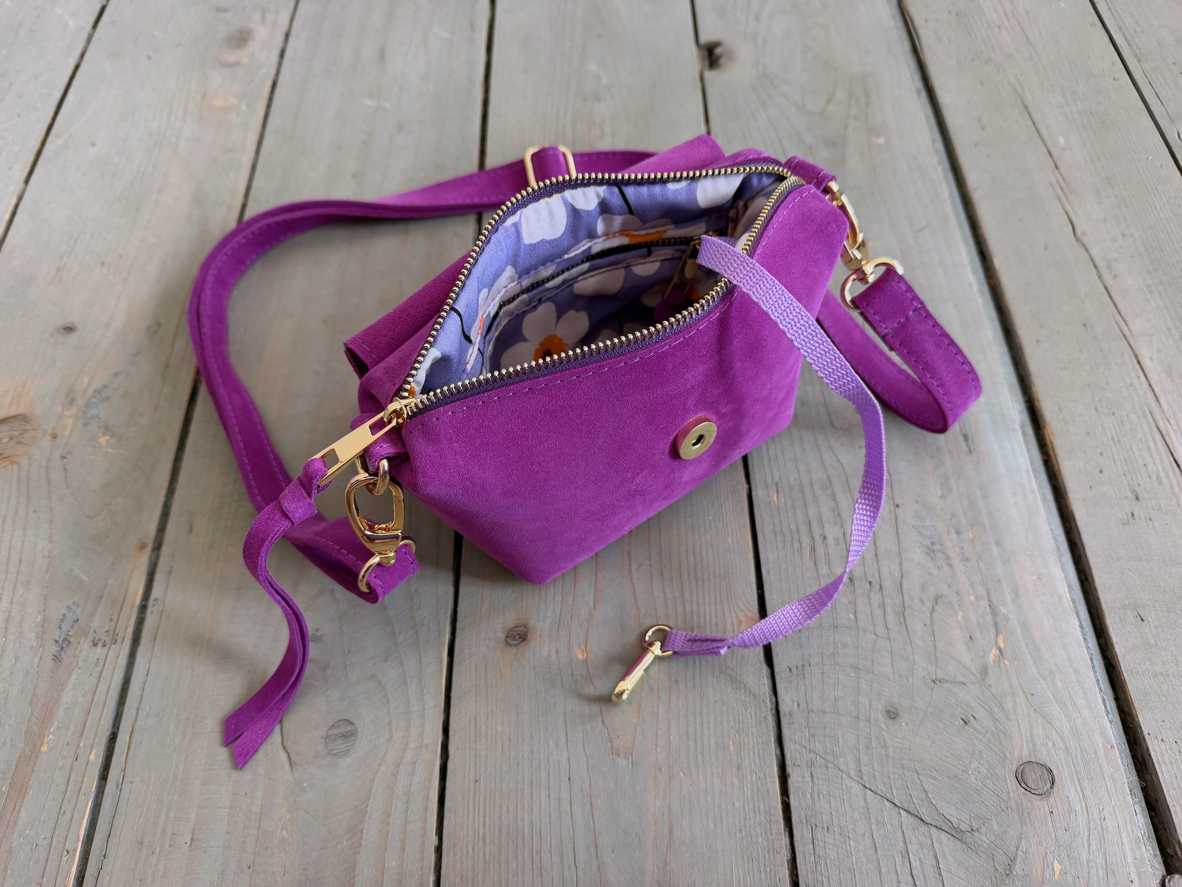 Uszyta ze skóry naturalnej welurowej + bawełnianej podszewki.