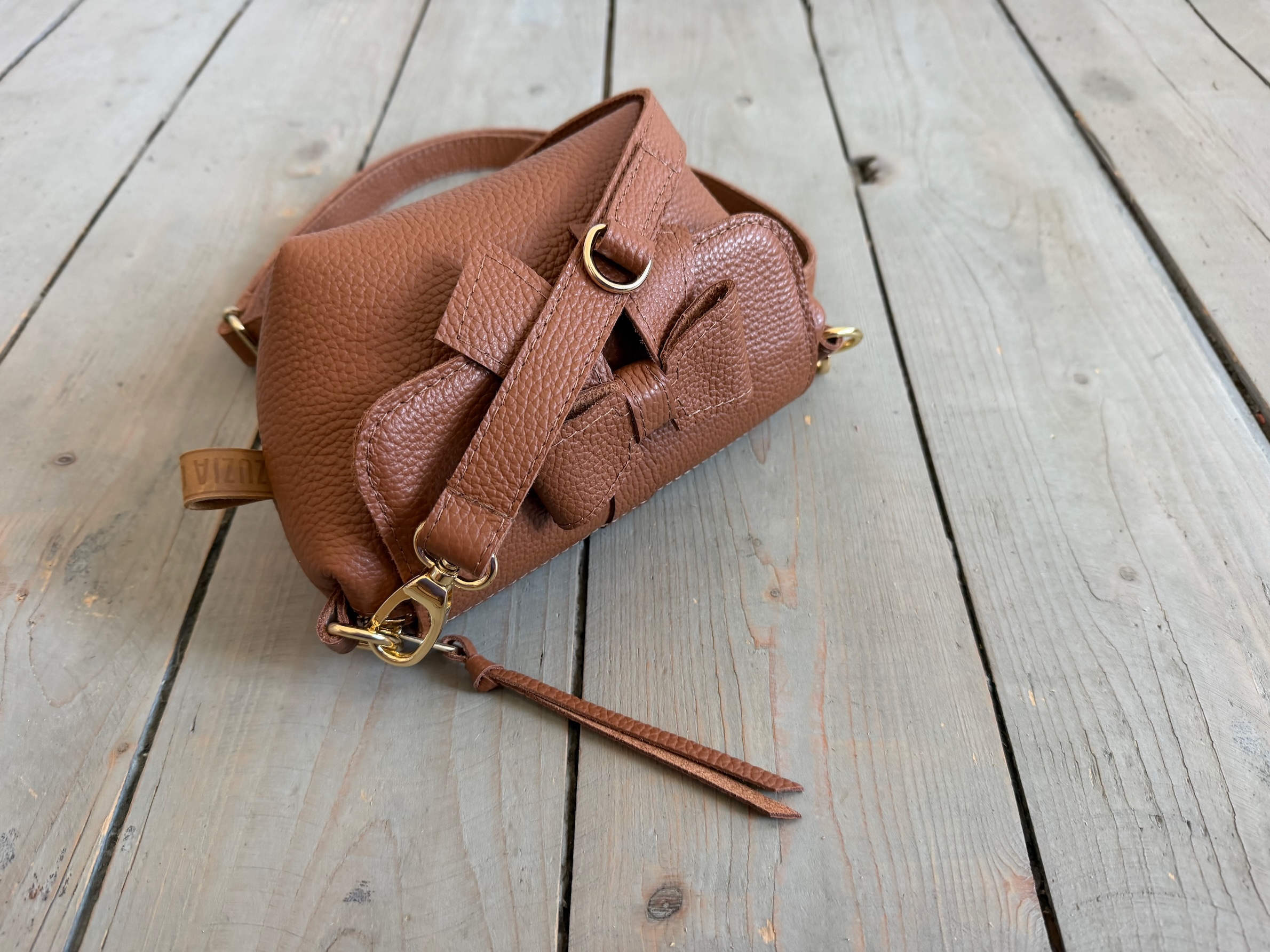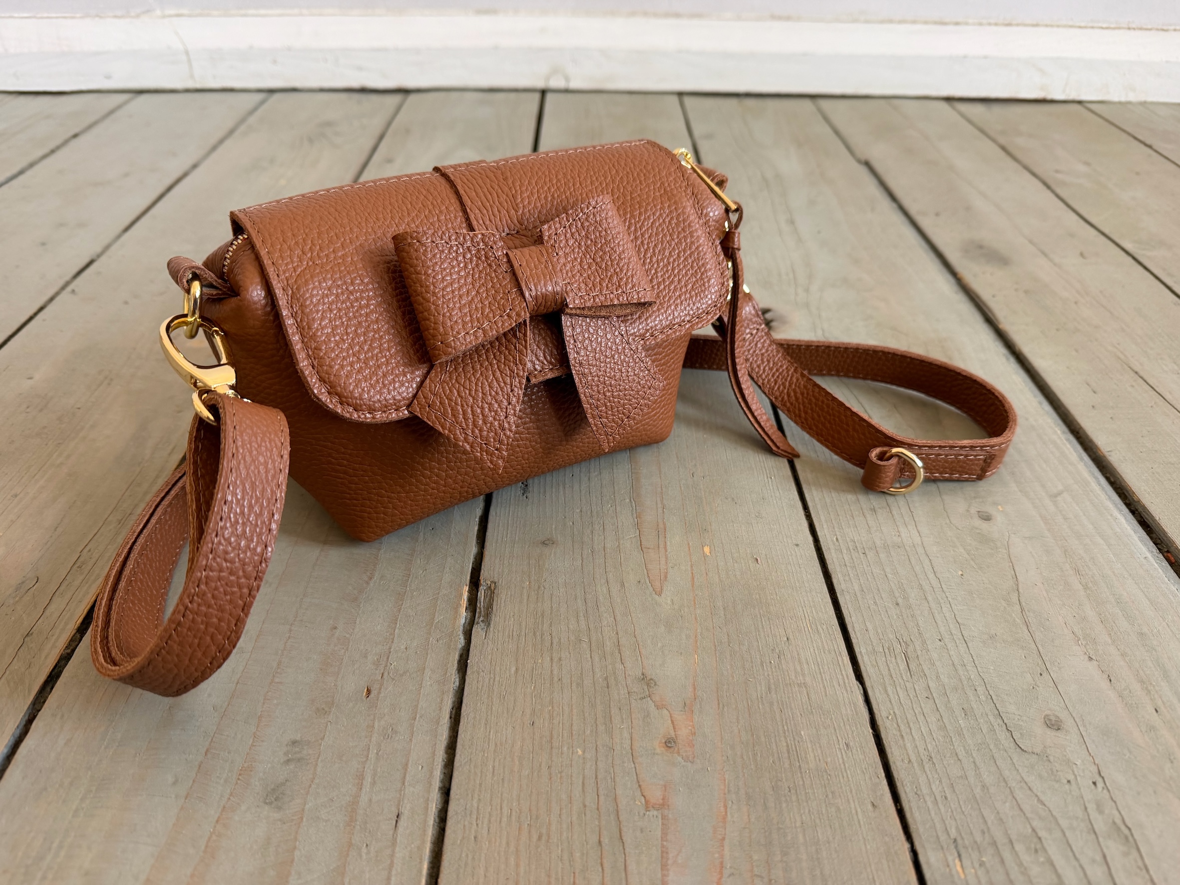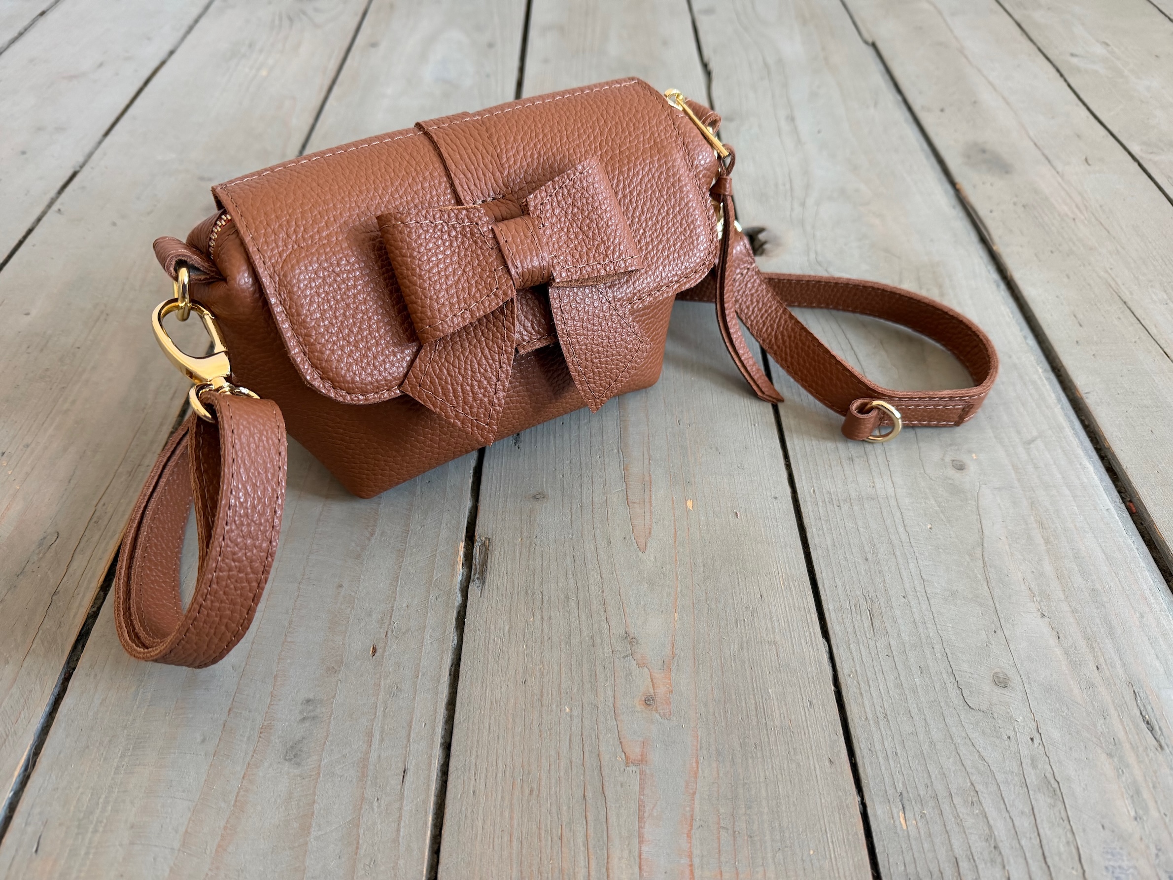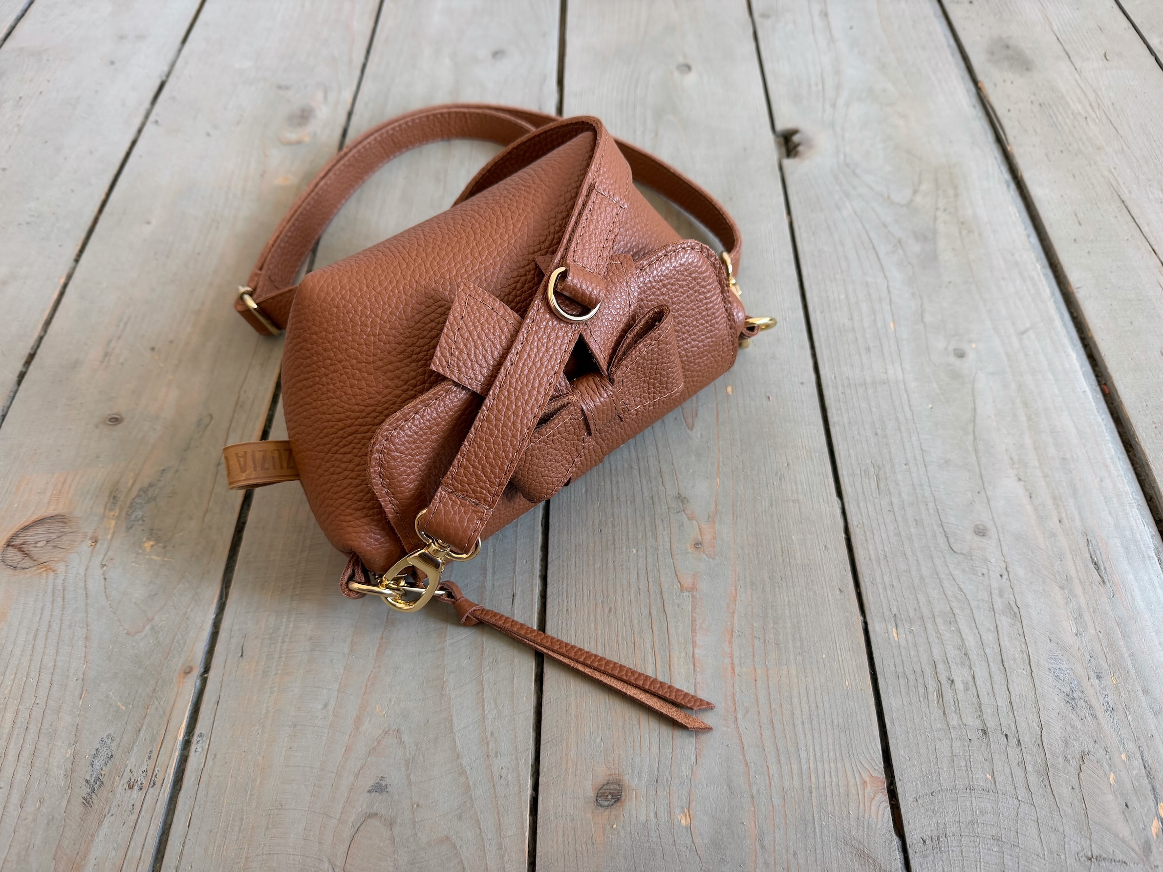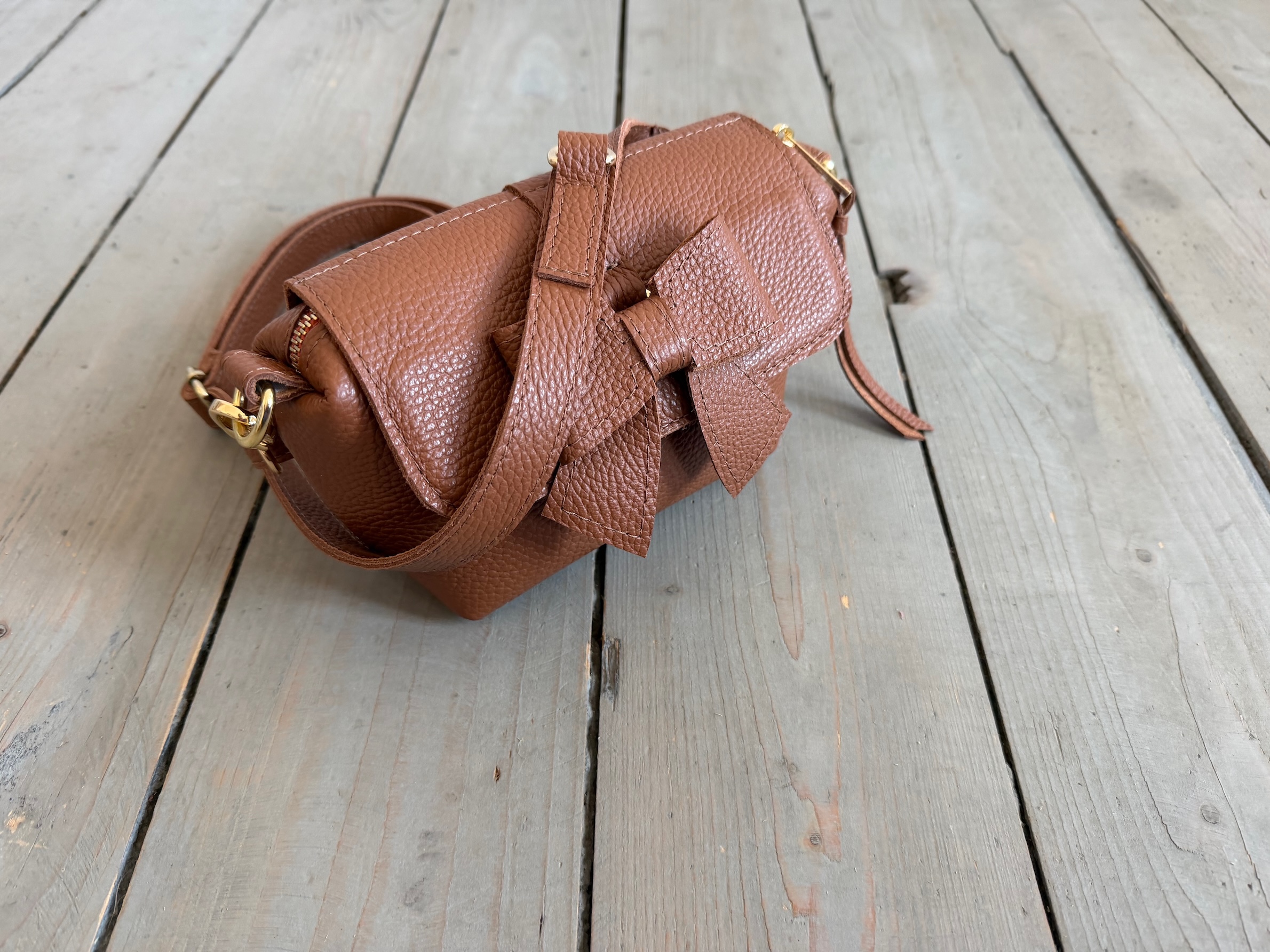 Mała pękata torebka z odpinaną kokardką z przodu.
