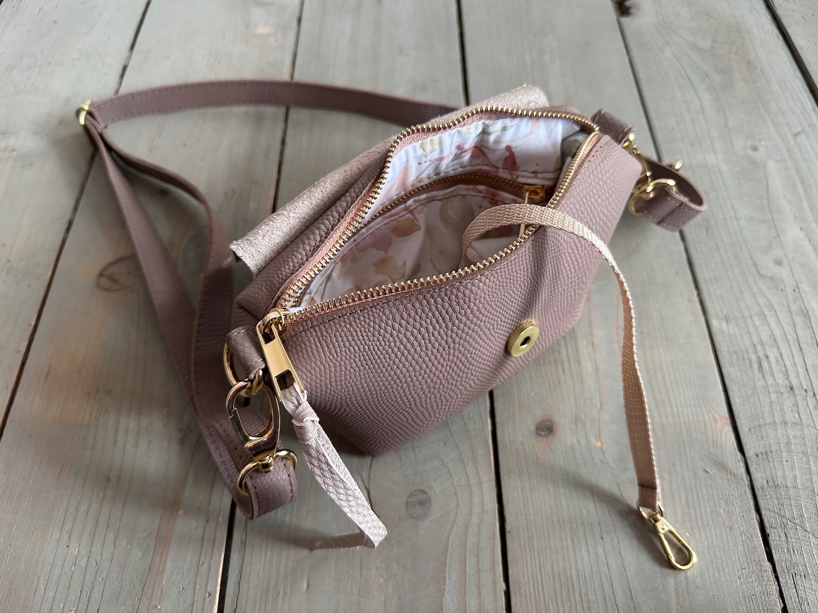 Wewnątrz kieszonka na zamek oraz smyczka z karabińczykiem.