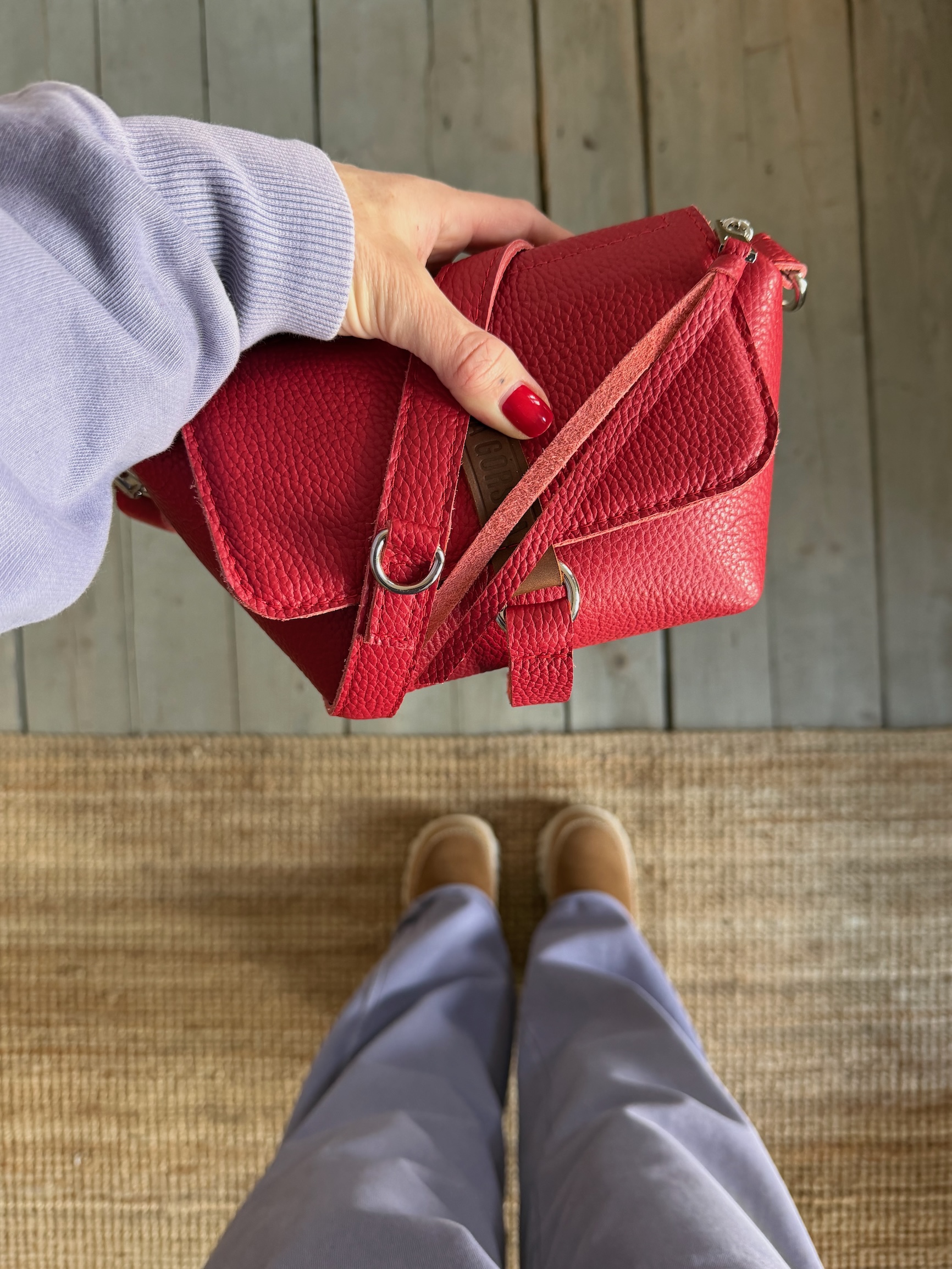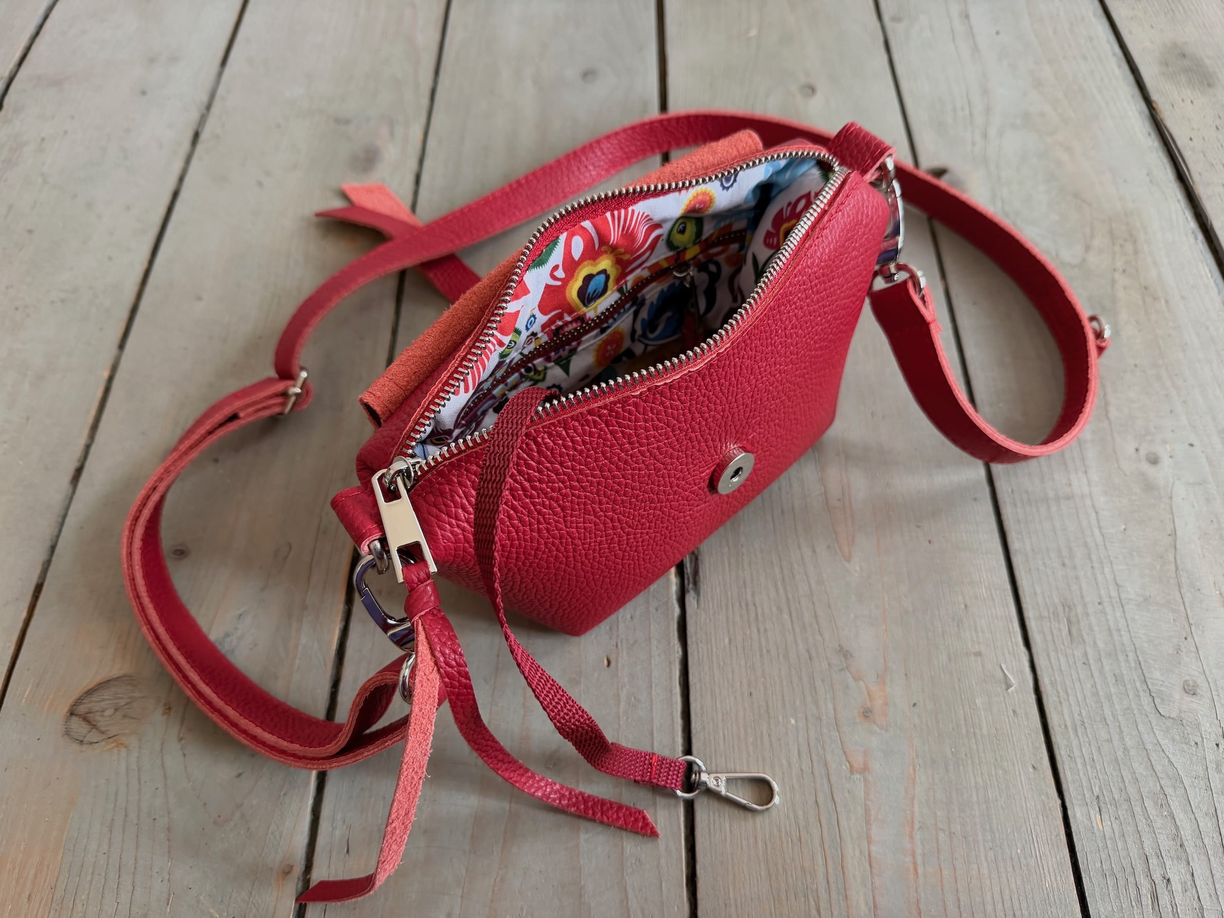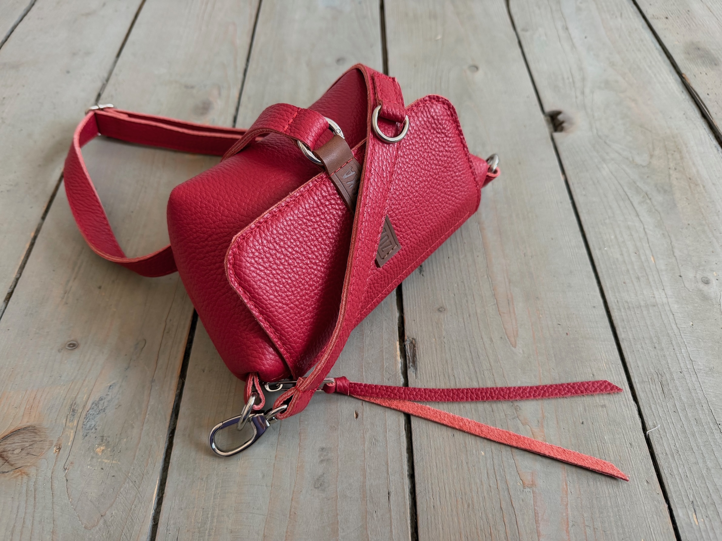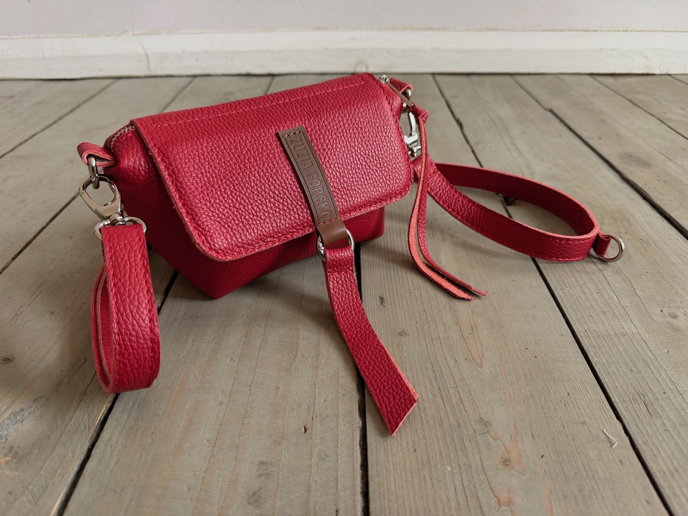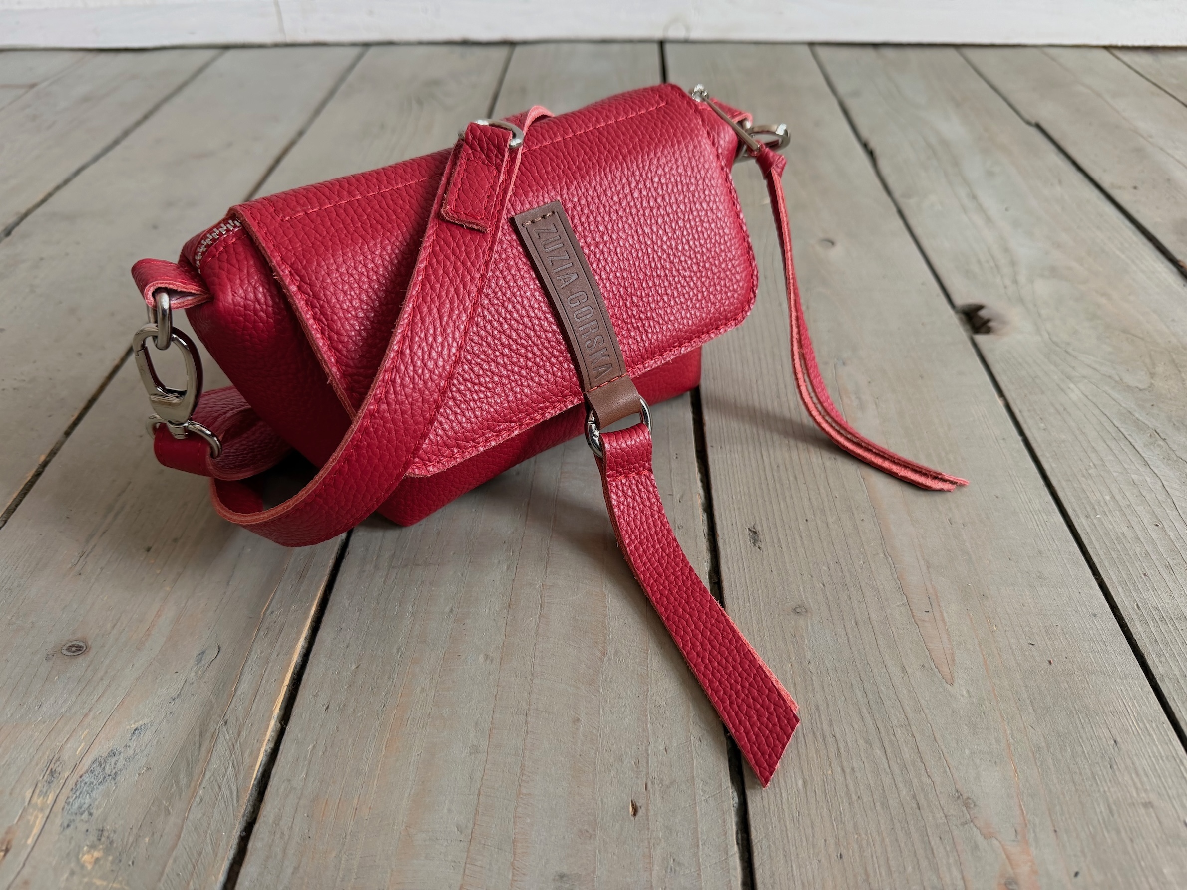 Uszyta ze skóry naturalnej licowej + bawełnianej podszewki.