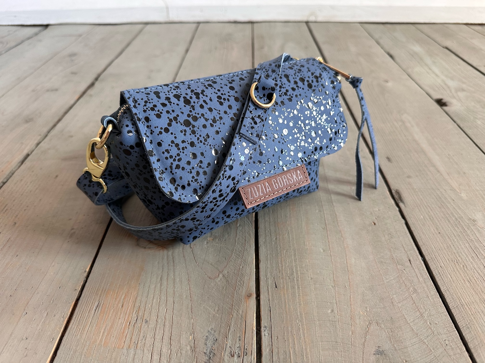 Uszyta ze skóry naturalnej nubukowej + bawełnianej podszewki.