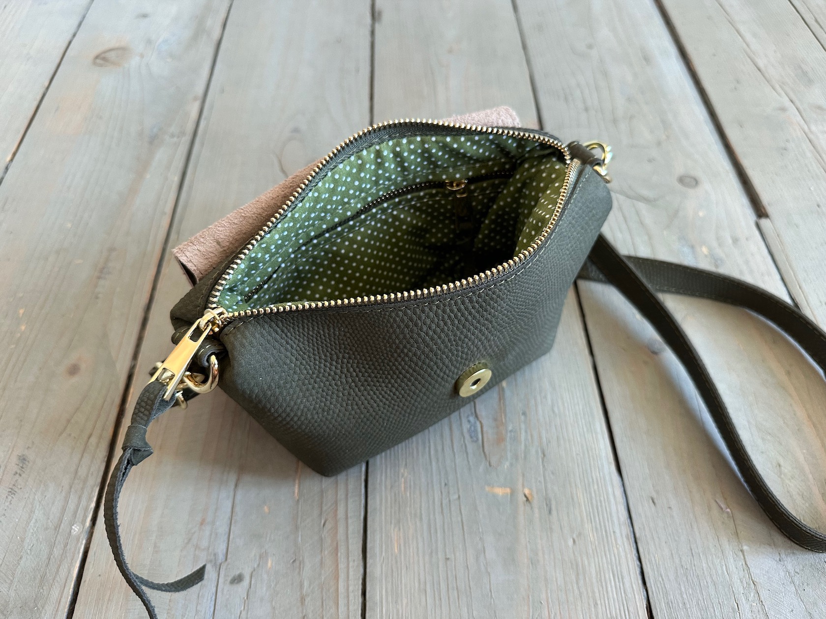 Wewnątrz kieszonka na zamek oraz smyczka z karabińczykiem.