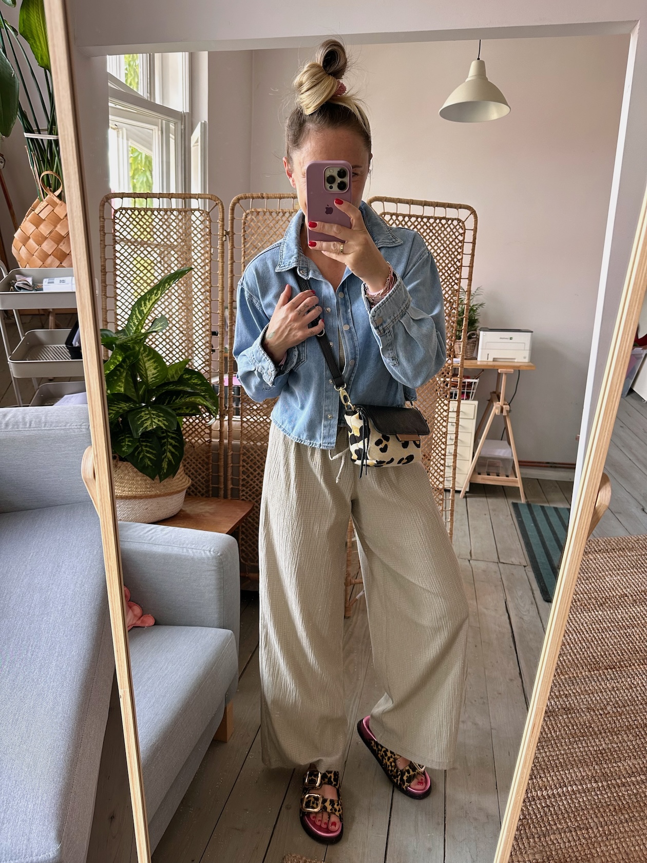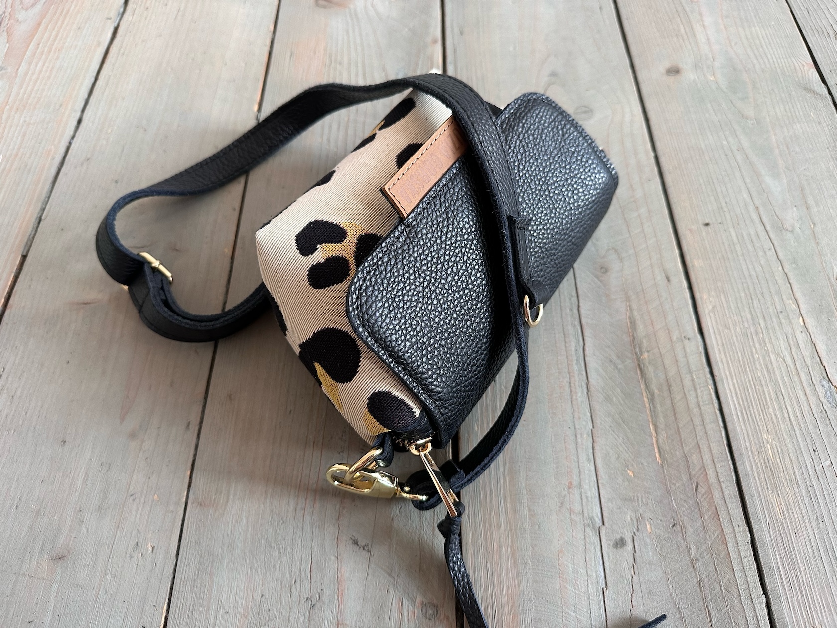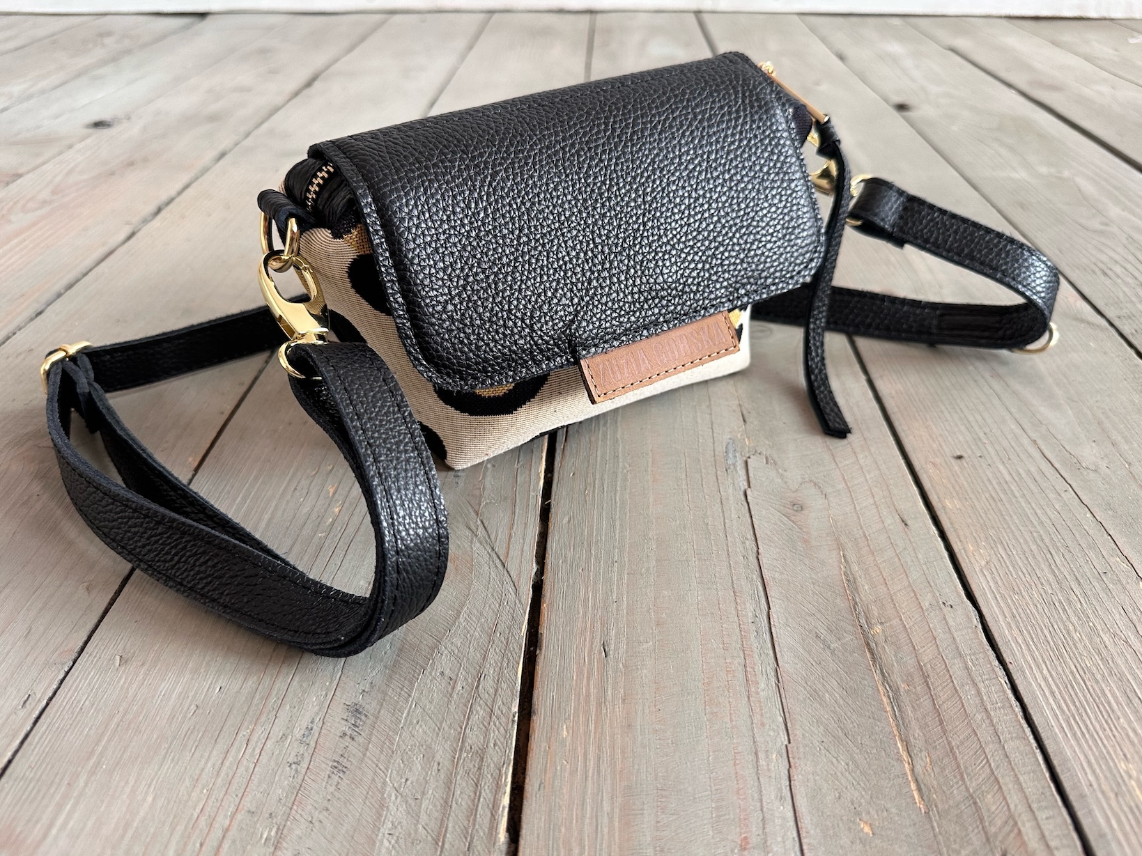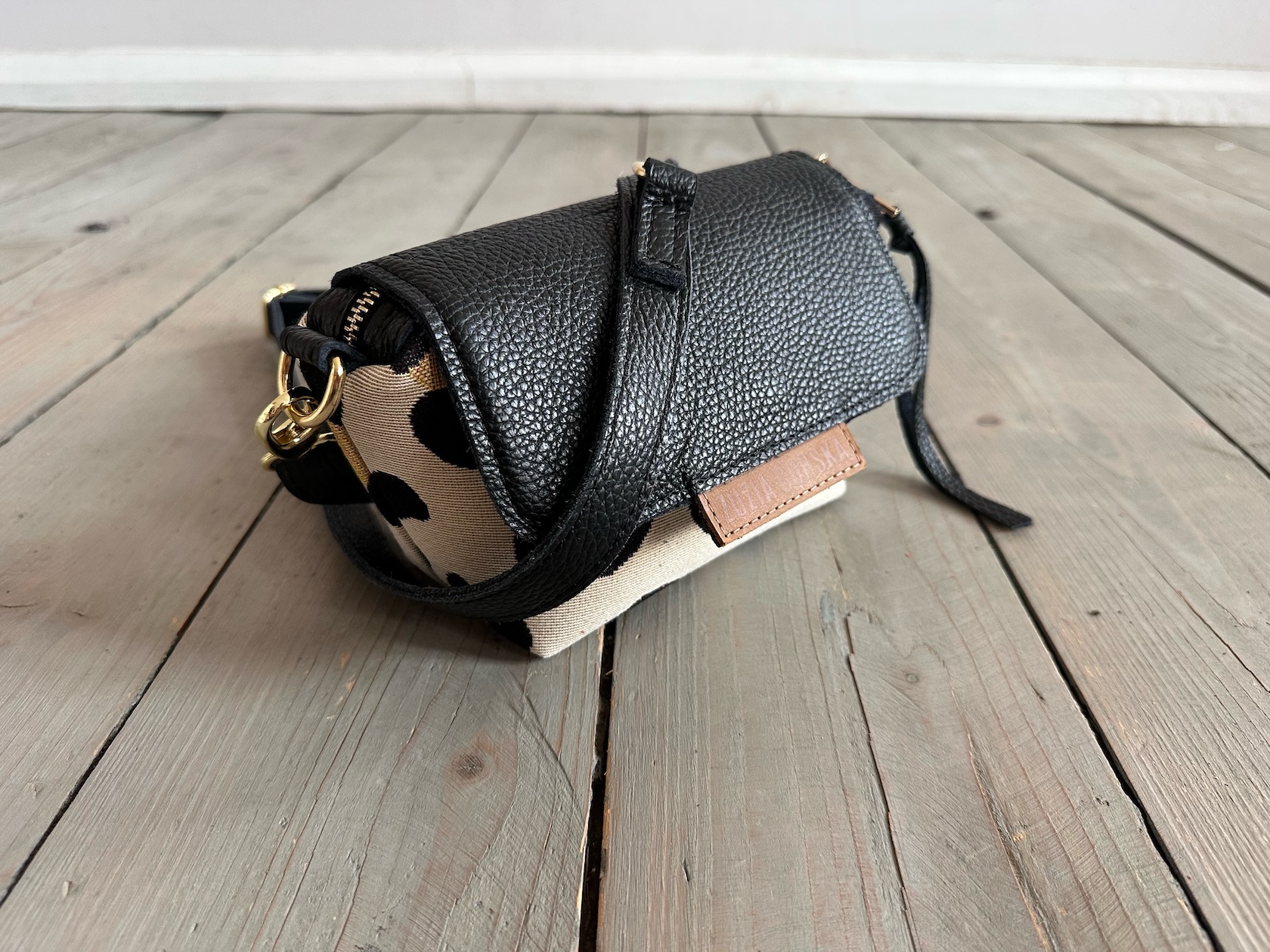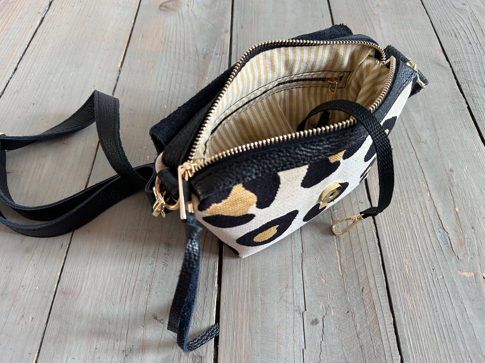 Uszyta z tkaniny dekoracyjnej bawełniano-poliestrowej + skóry naturalnej + bawełnianej podszewki.