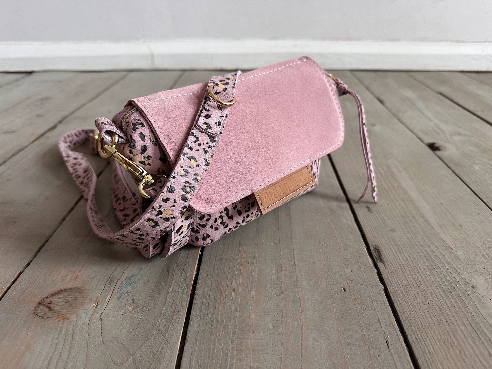 Uszyta ze skóry naturalnej welurowej + bawełnianej podszewki.