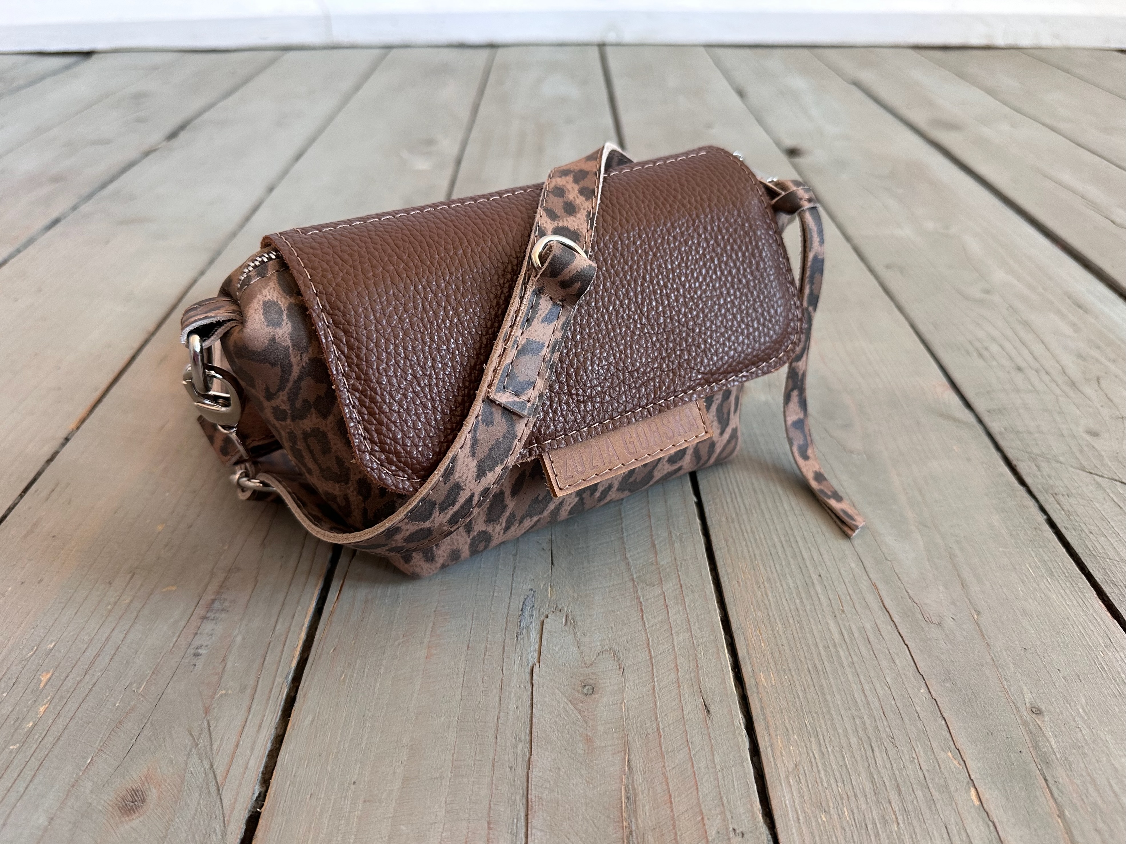Uszyta ze skóry naturalnej licowej + nubukowej + bawełnianej podszewki.