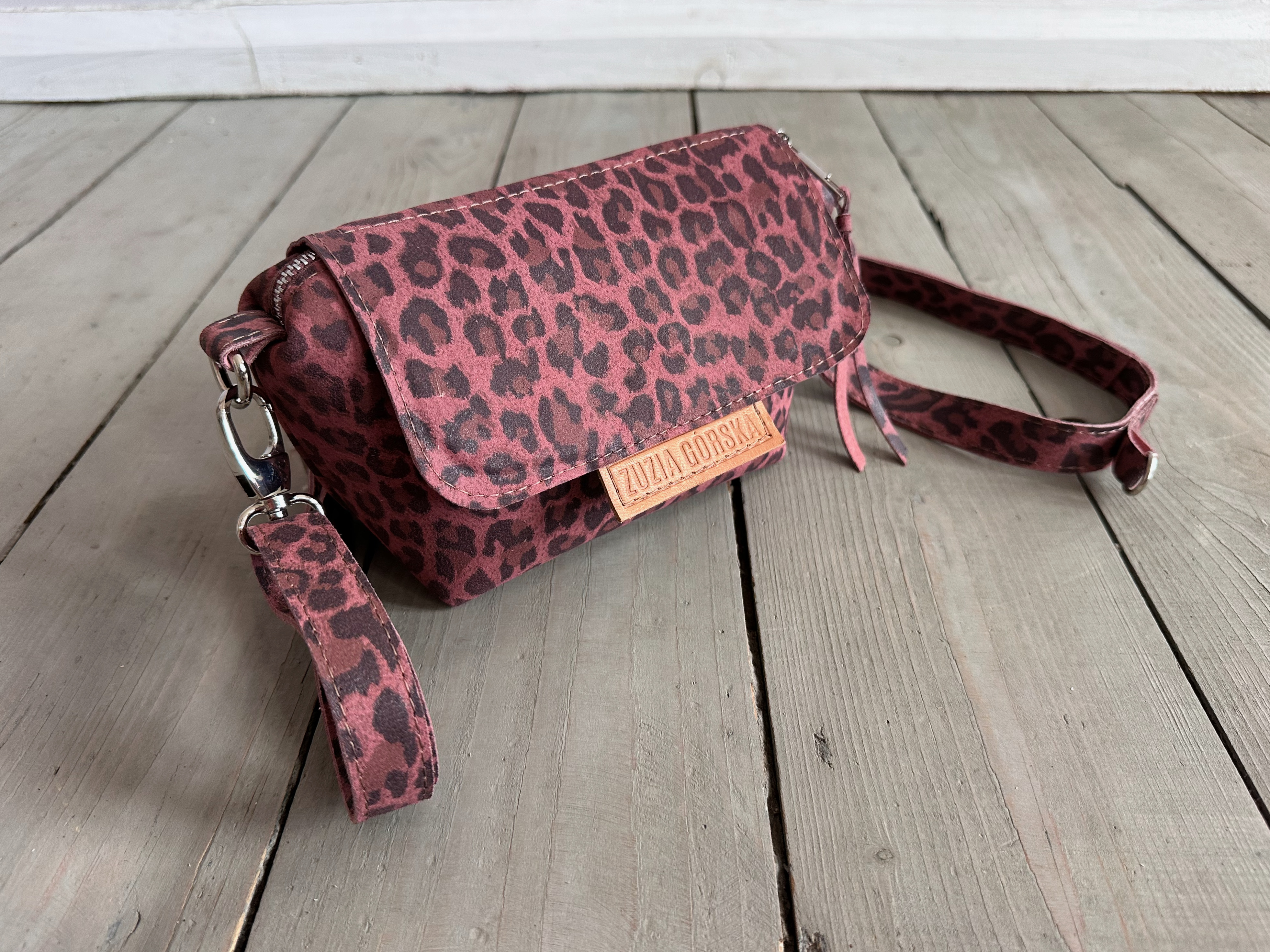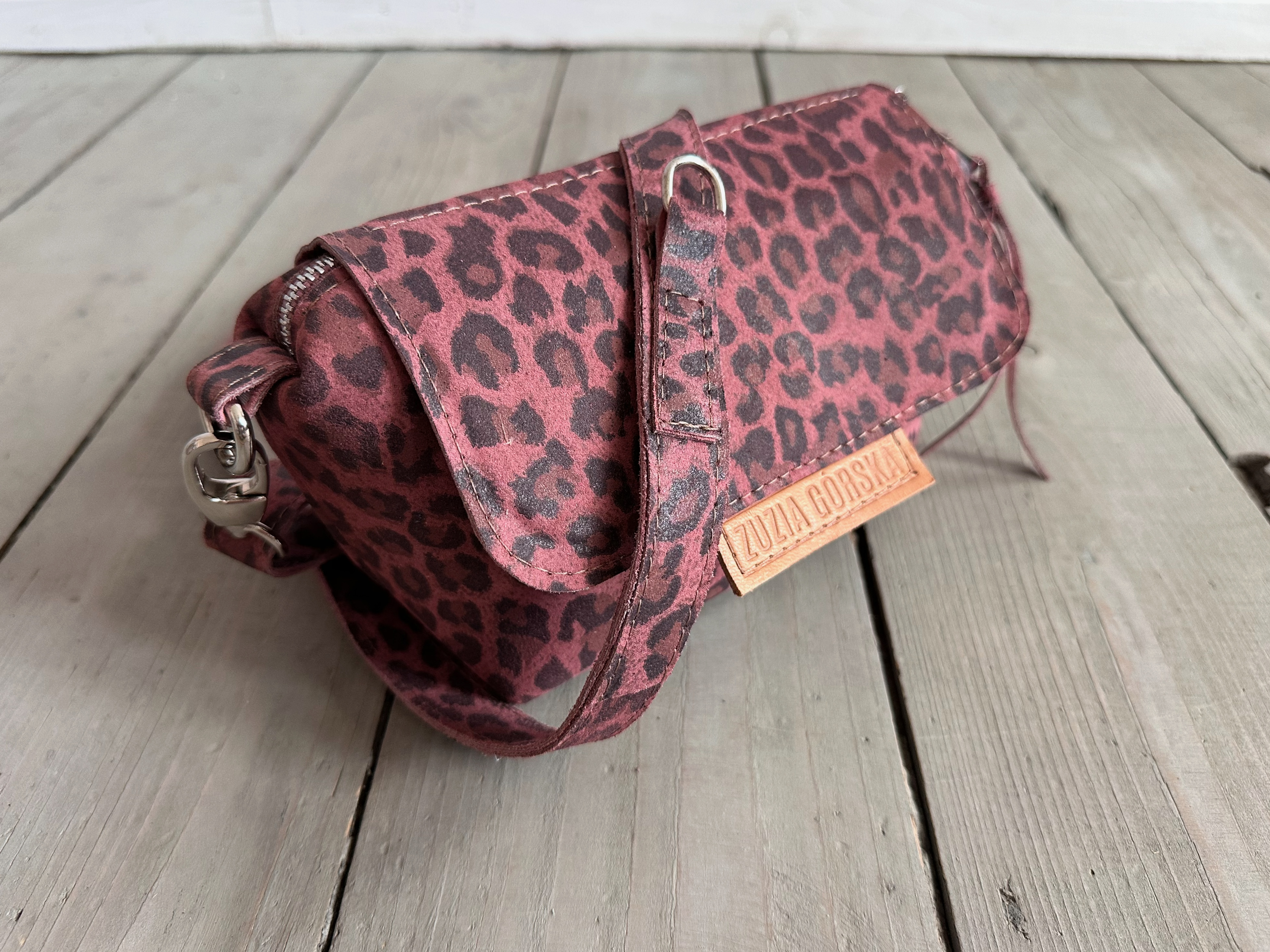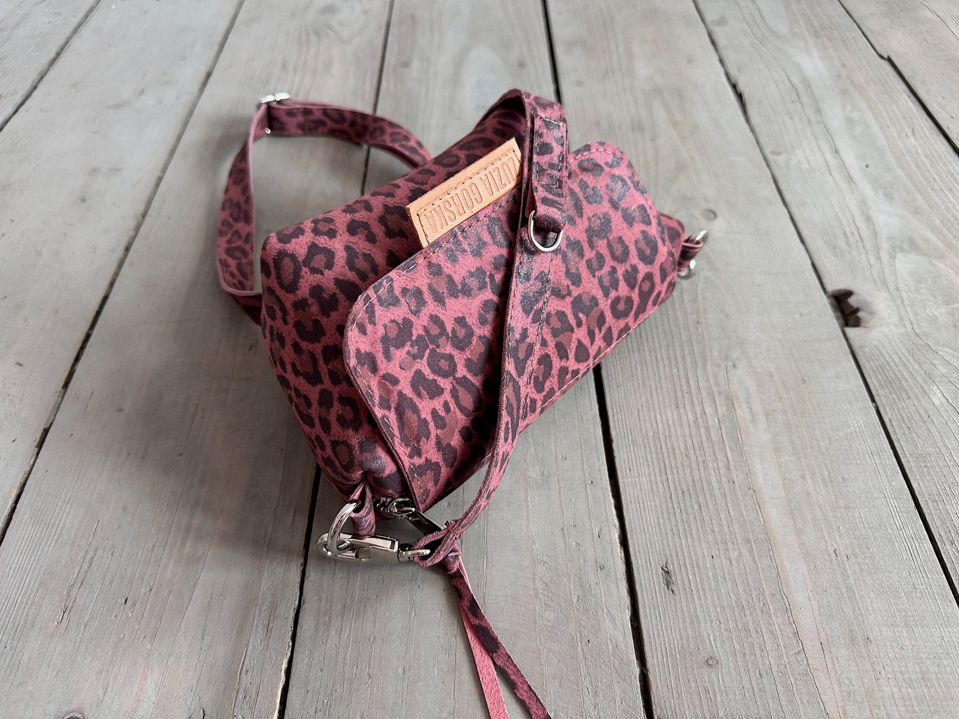 Uszyta ze skóry naturalnej nubukowej + bawełnianej podszewki.