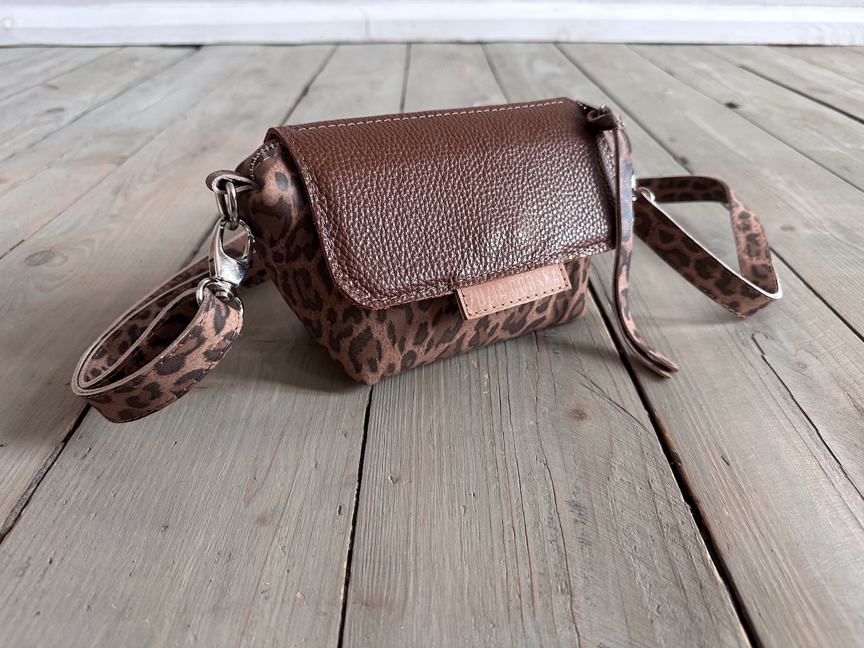 Uszyta ze skóry naturalnej licowej + nubukowej + bawełnianej podszewki.