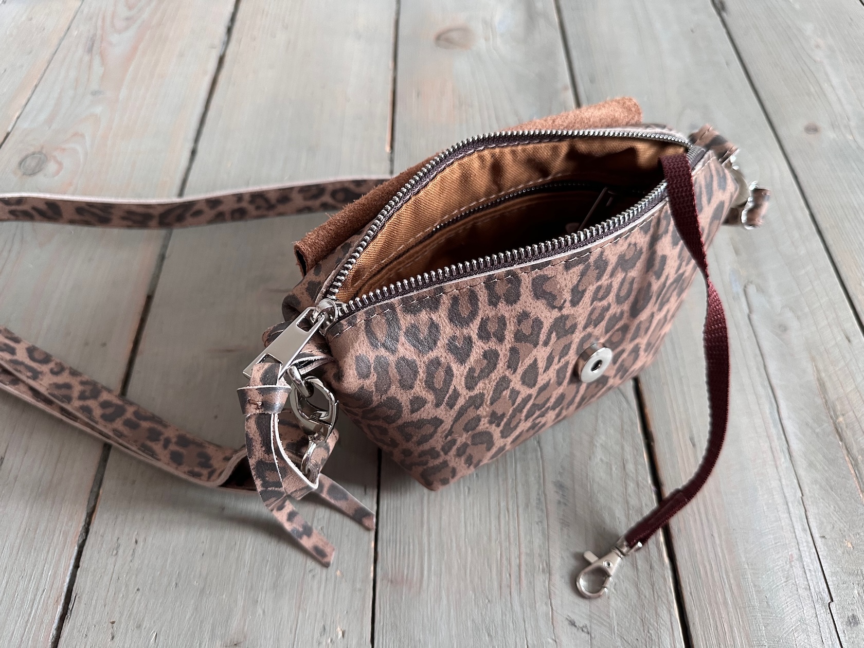 Wewnątrz kieszonka na zamek oraz smyczka z karabińczykiem.