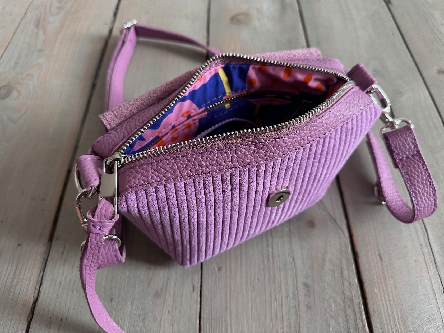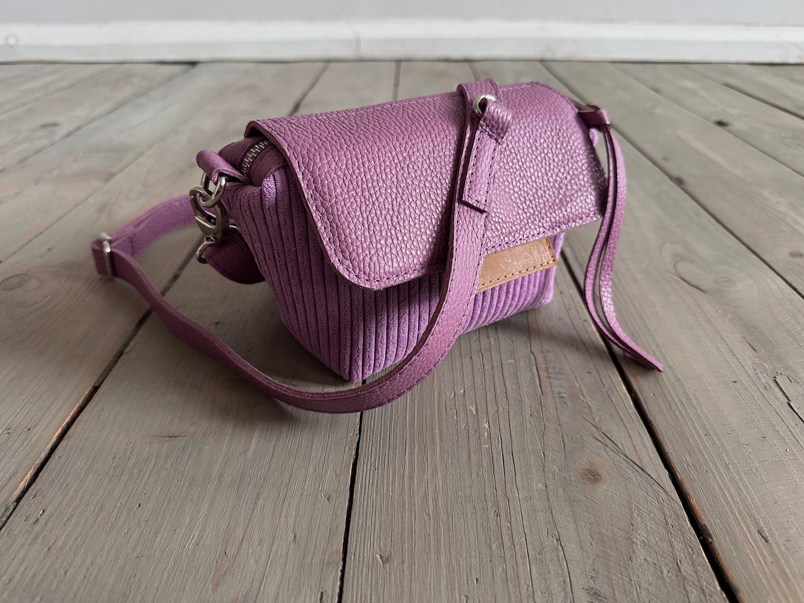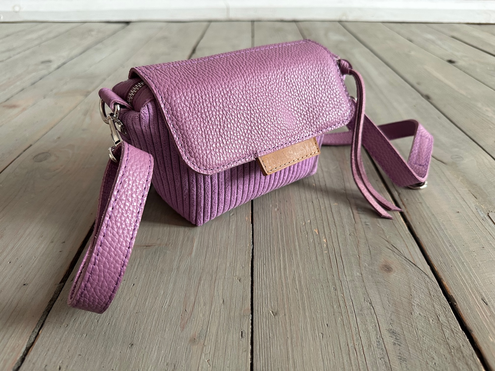 Uszyta z tkaniny dekoracyjnej bawełniano-poliestrowej + skóry naturalnej + bawełnianej podszewki.