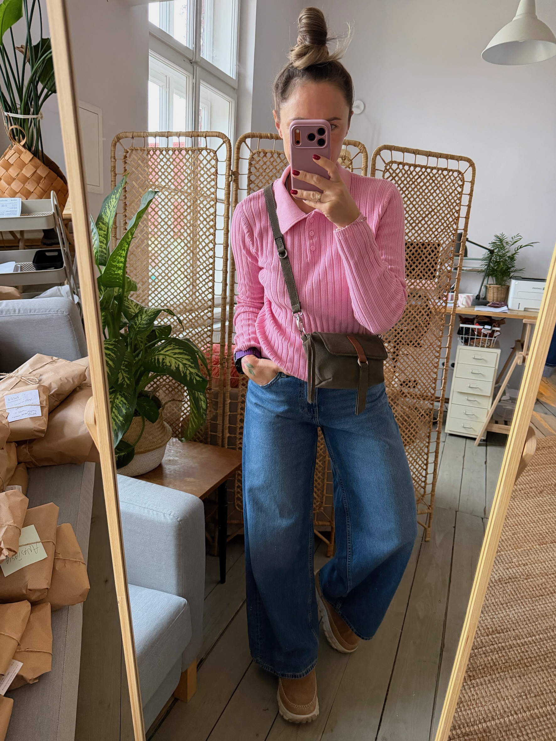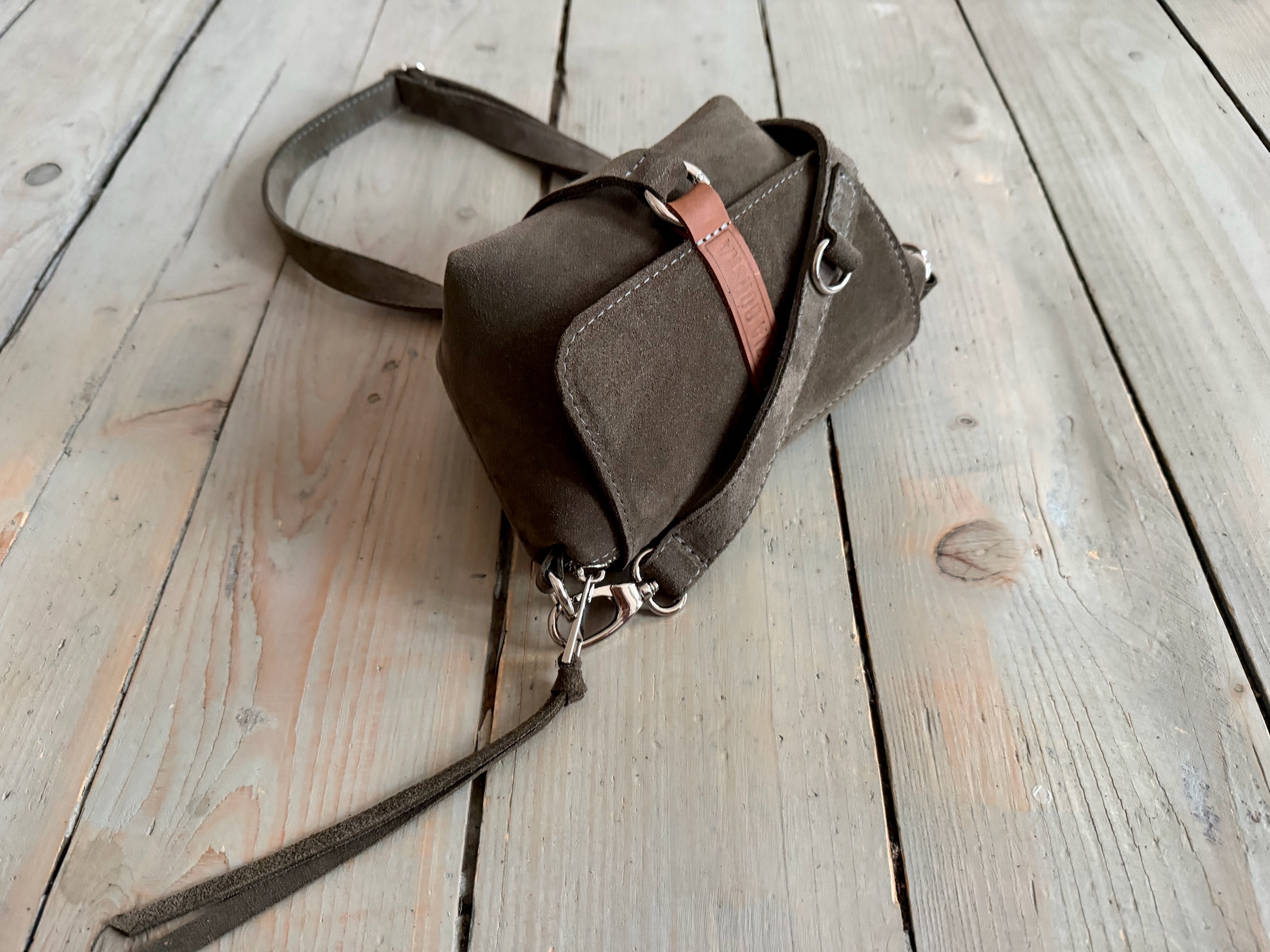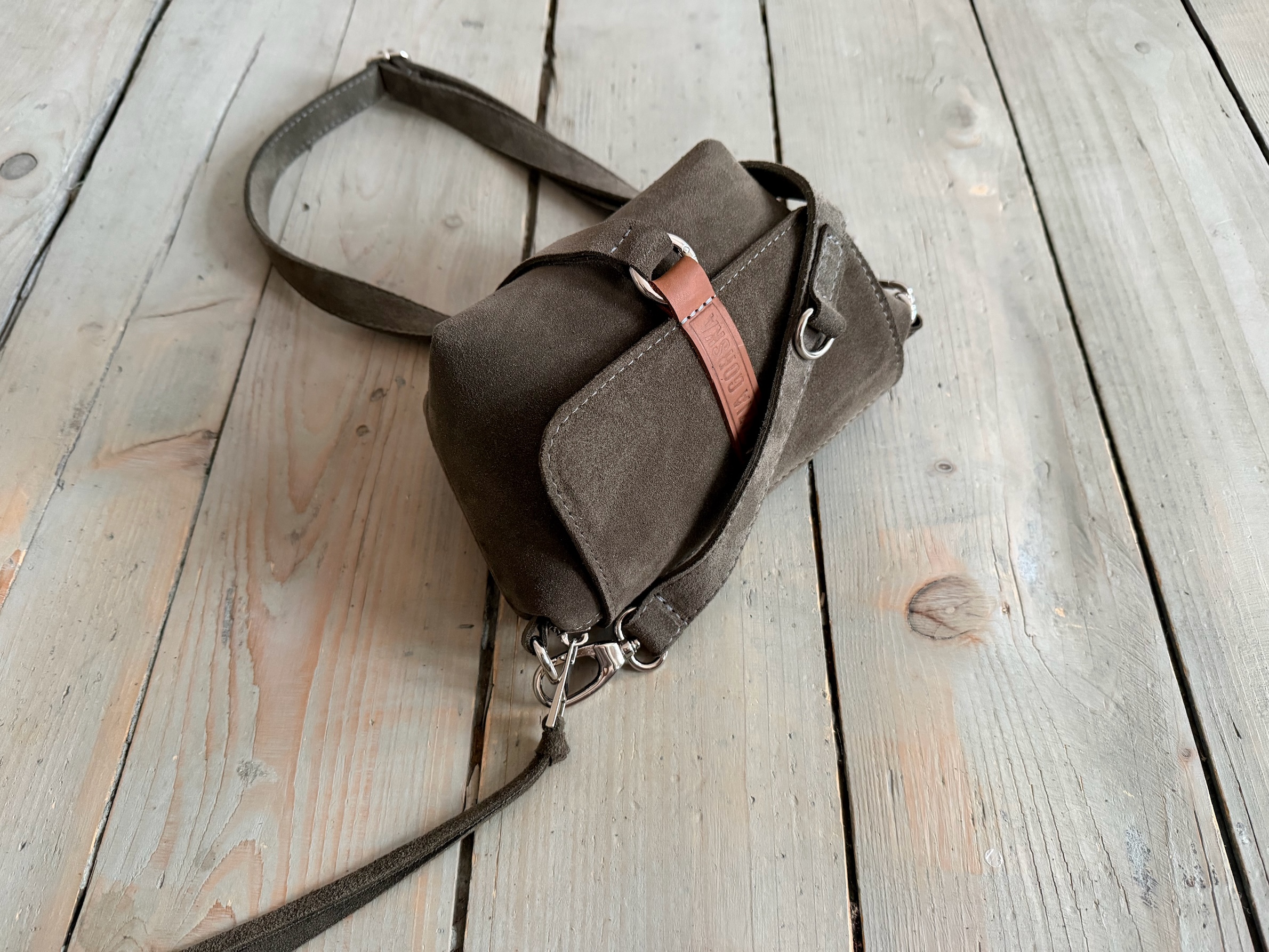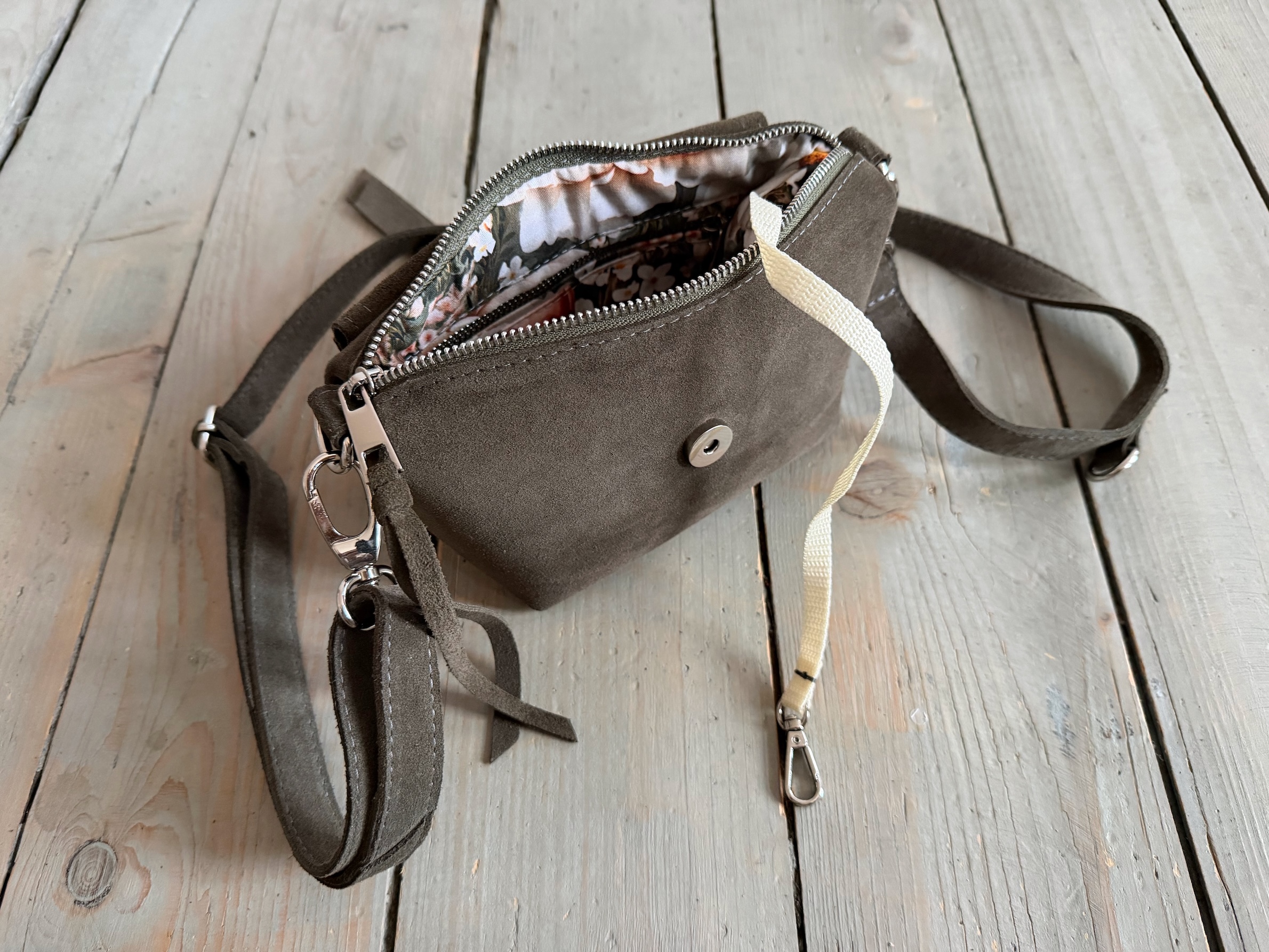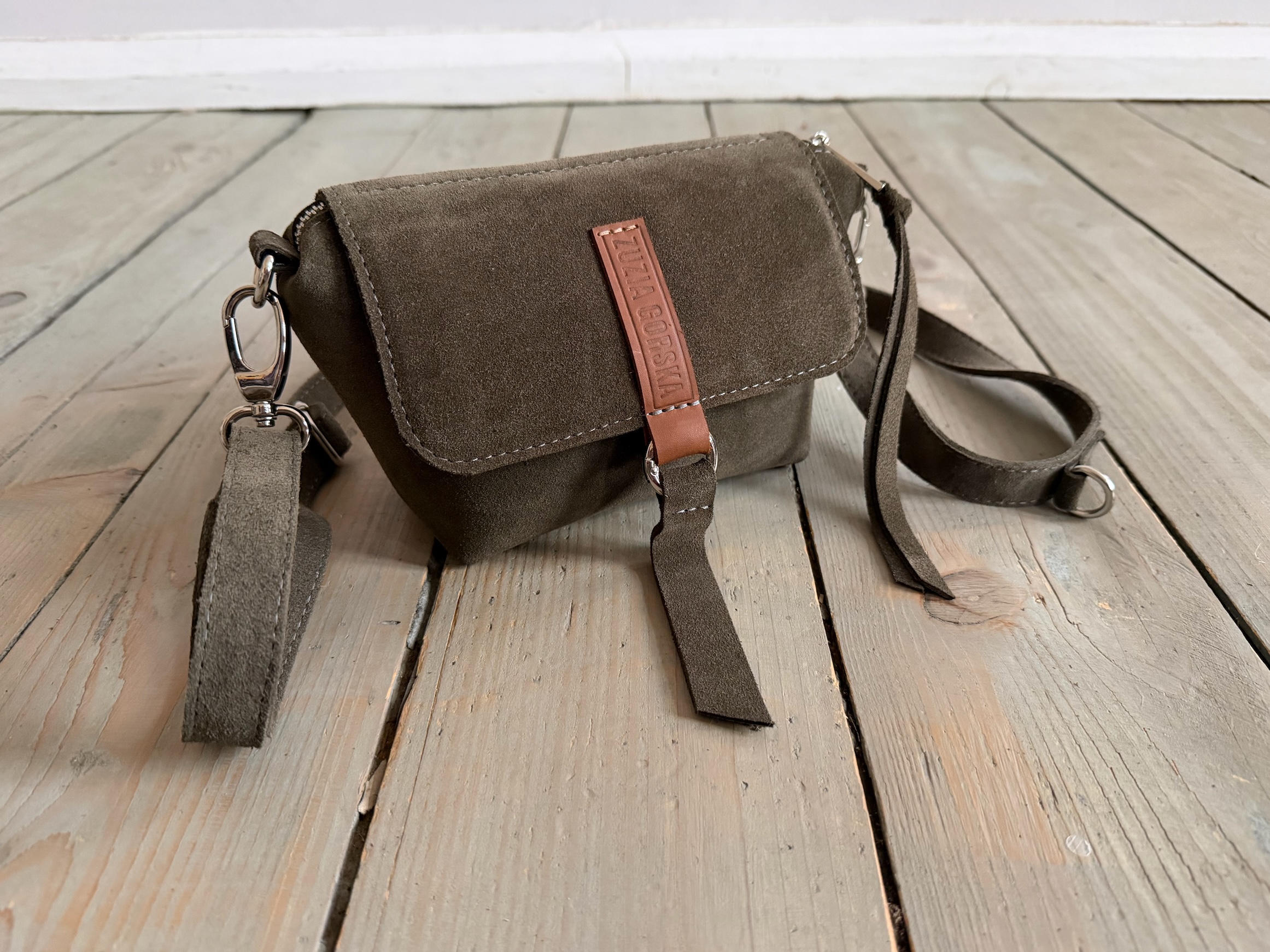 Uszyta ze skóry naturalnej welurowej + bawełnianej podszewki.