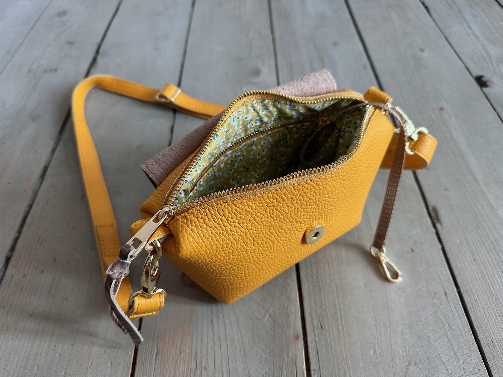 Uszyta ze skóry naturalnej licowej + welurowej + bawełnianej podszewki.