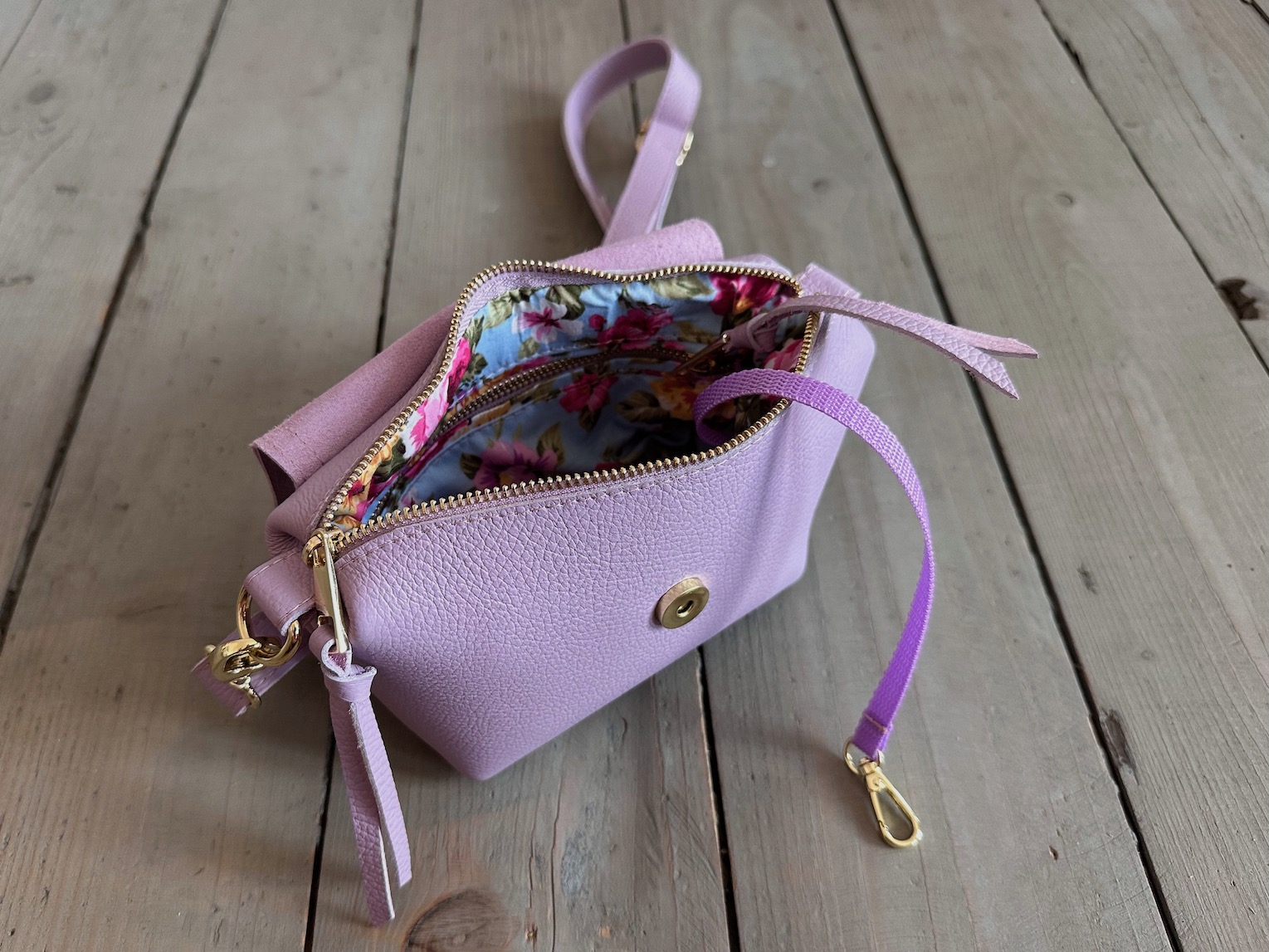 Uszyta ze skóry naturalnej licowej + bawełnianej podszewki.