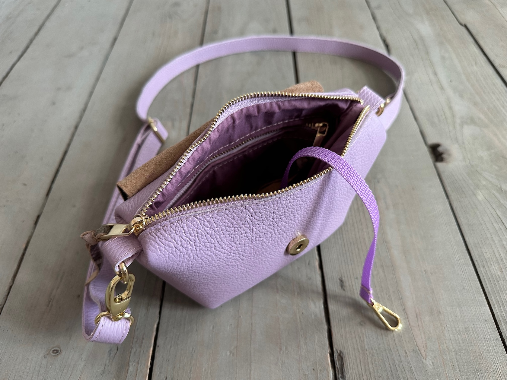 Wewnątrz kieszonka na zamek oraz smyczka z karabińczykiem.