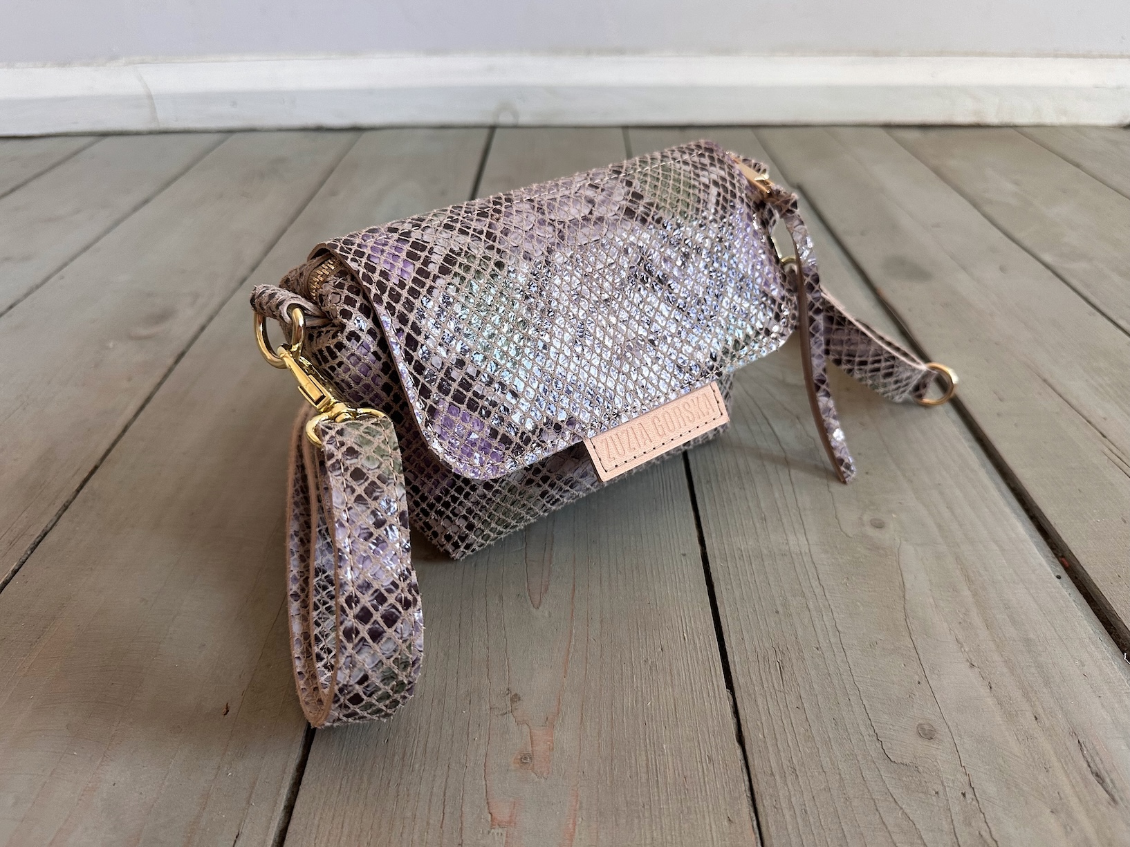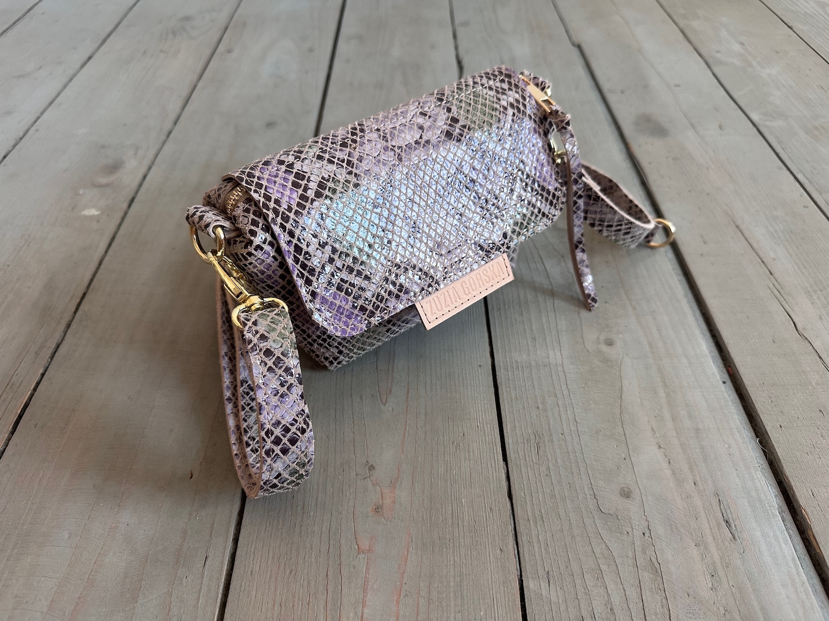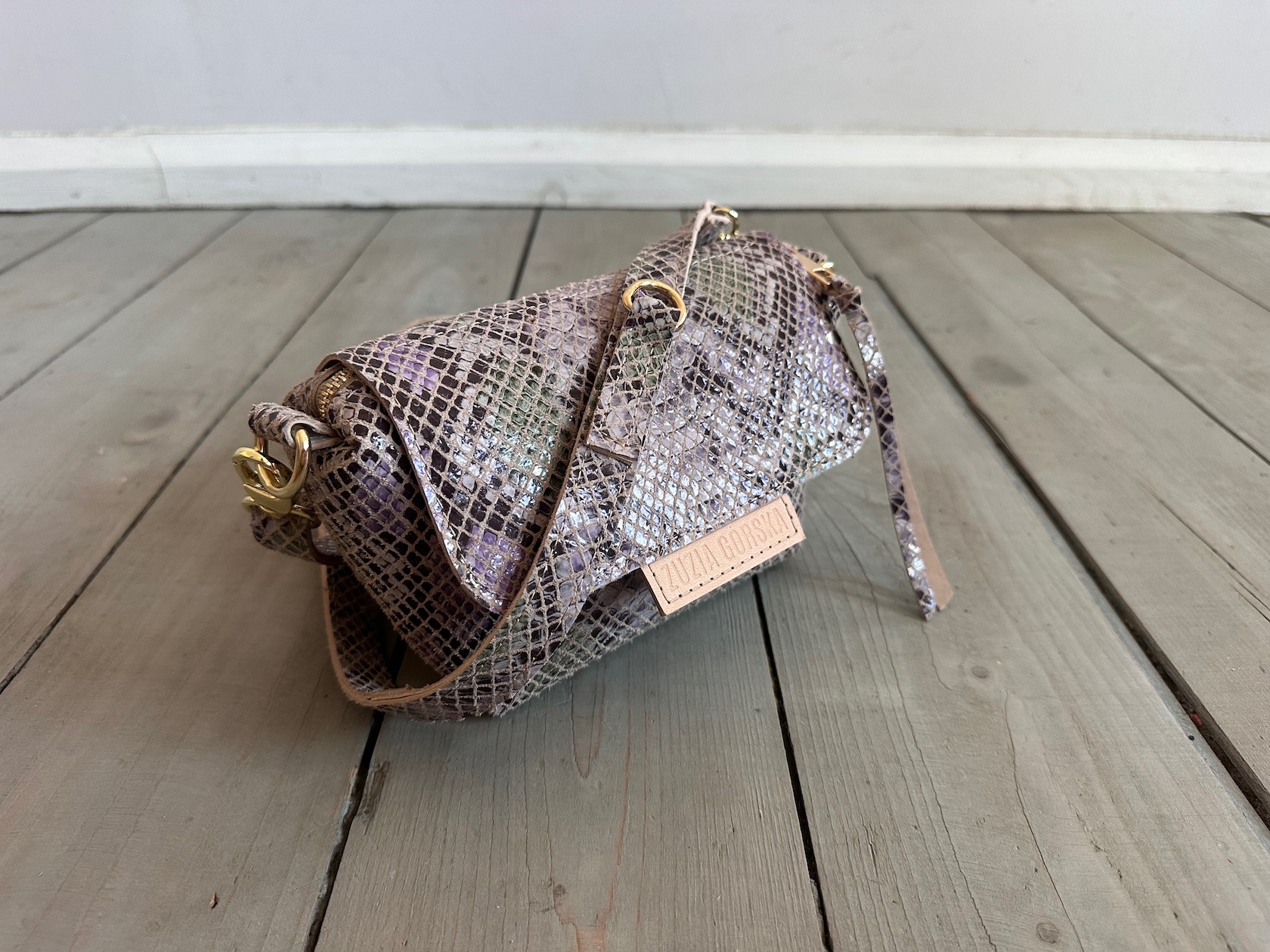 Uszyta ze skóry naturalnej welurowej + bawełnianej podszewki.