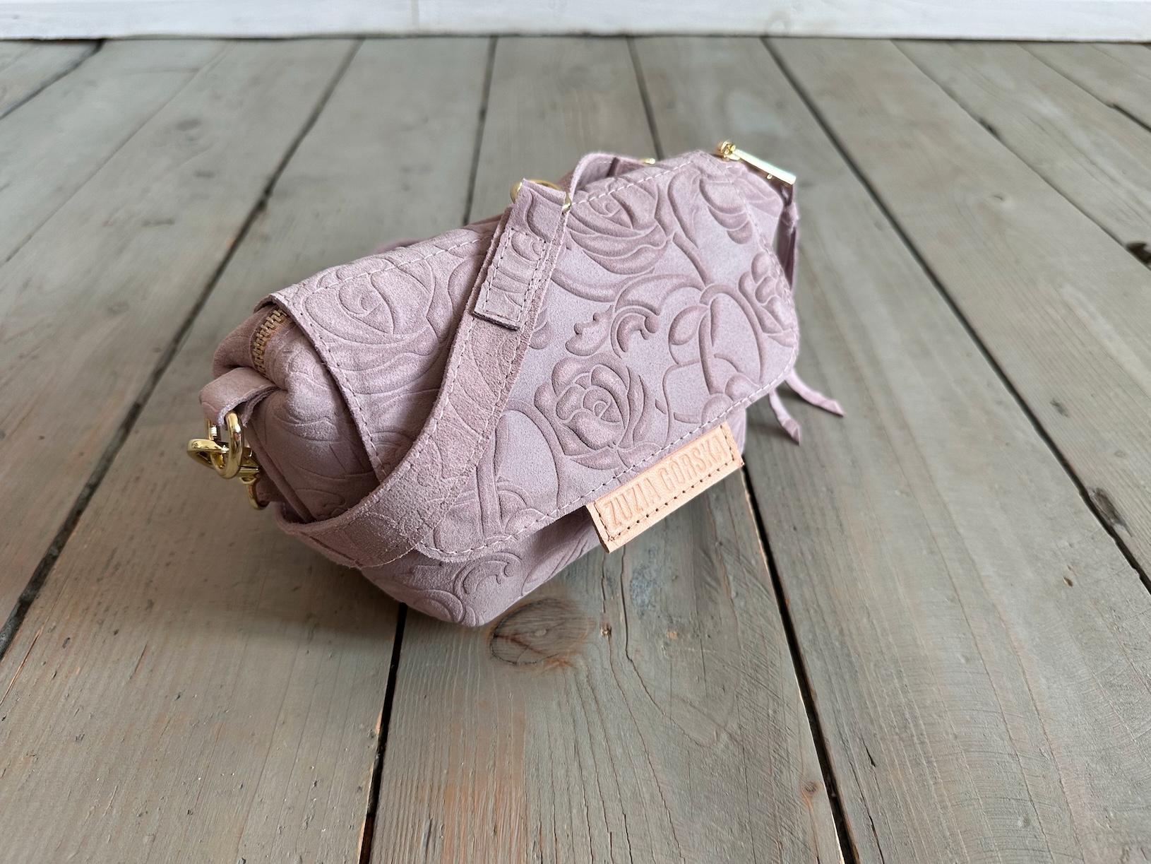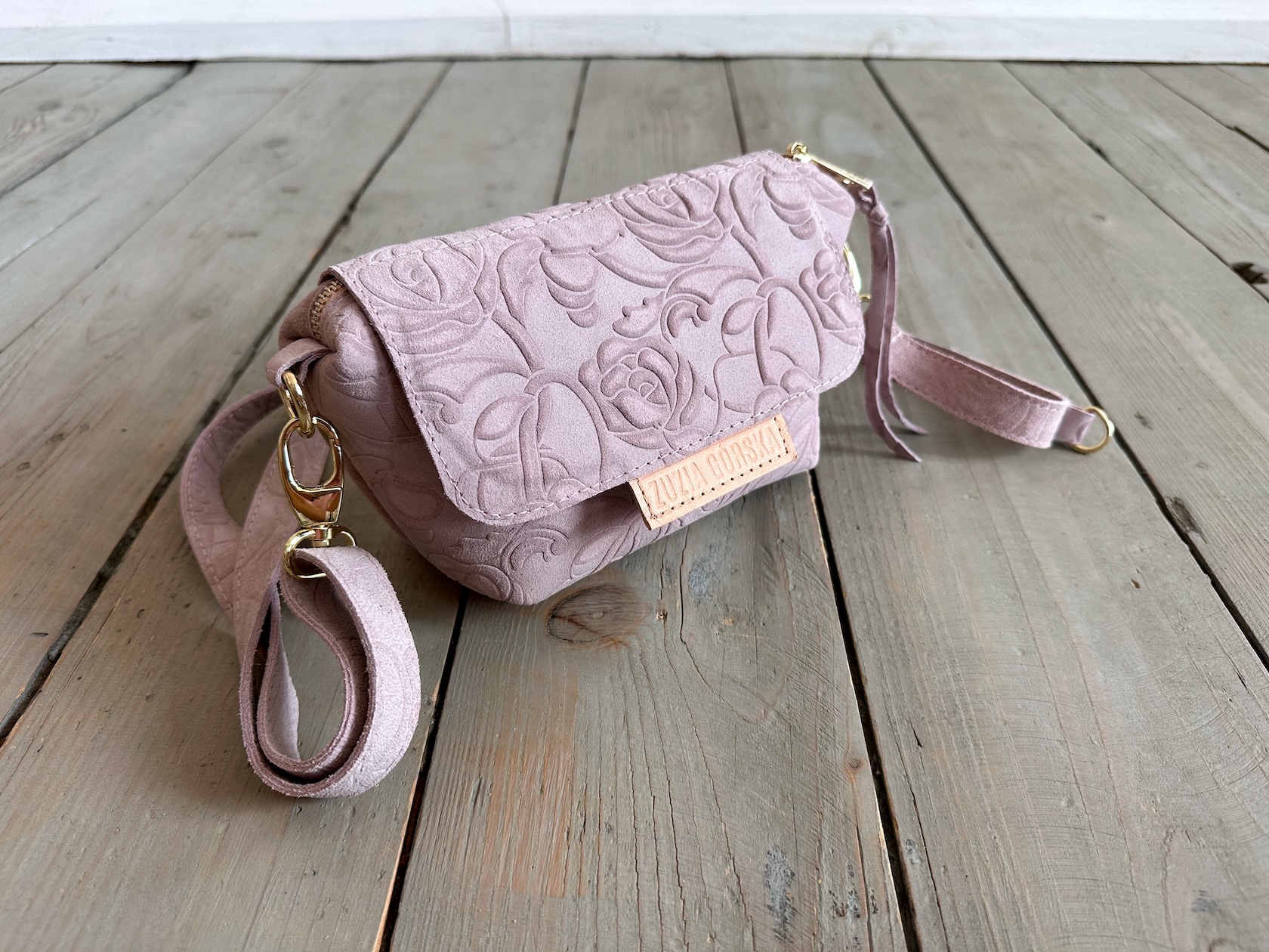 Uszyta ze skóry naturalnej welurowej + bawełnianej podszewki.