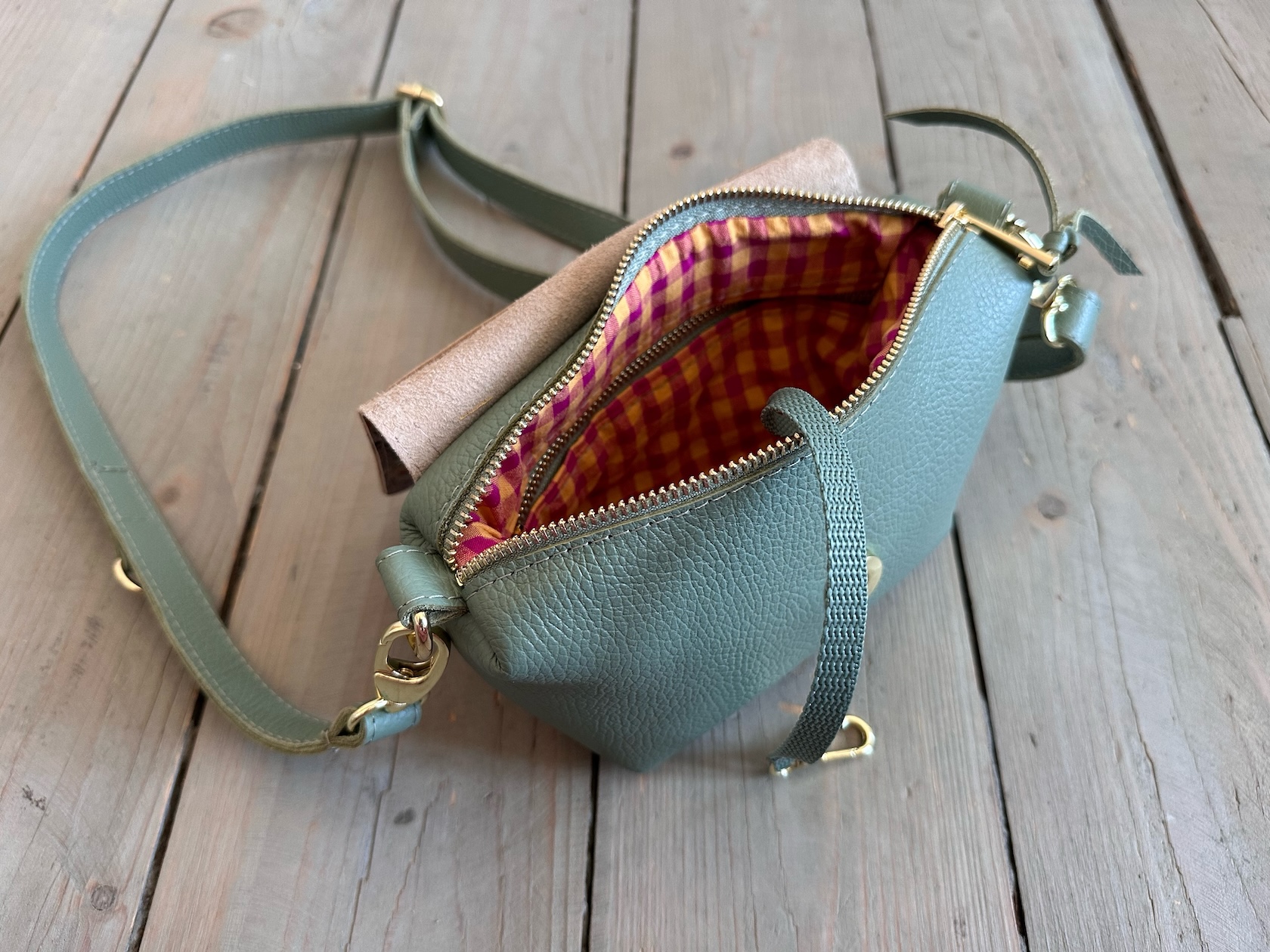 Uszyta ze skóry naturalnej licowej + bawełnianej podszewki.