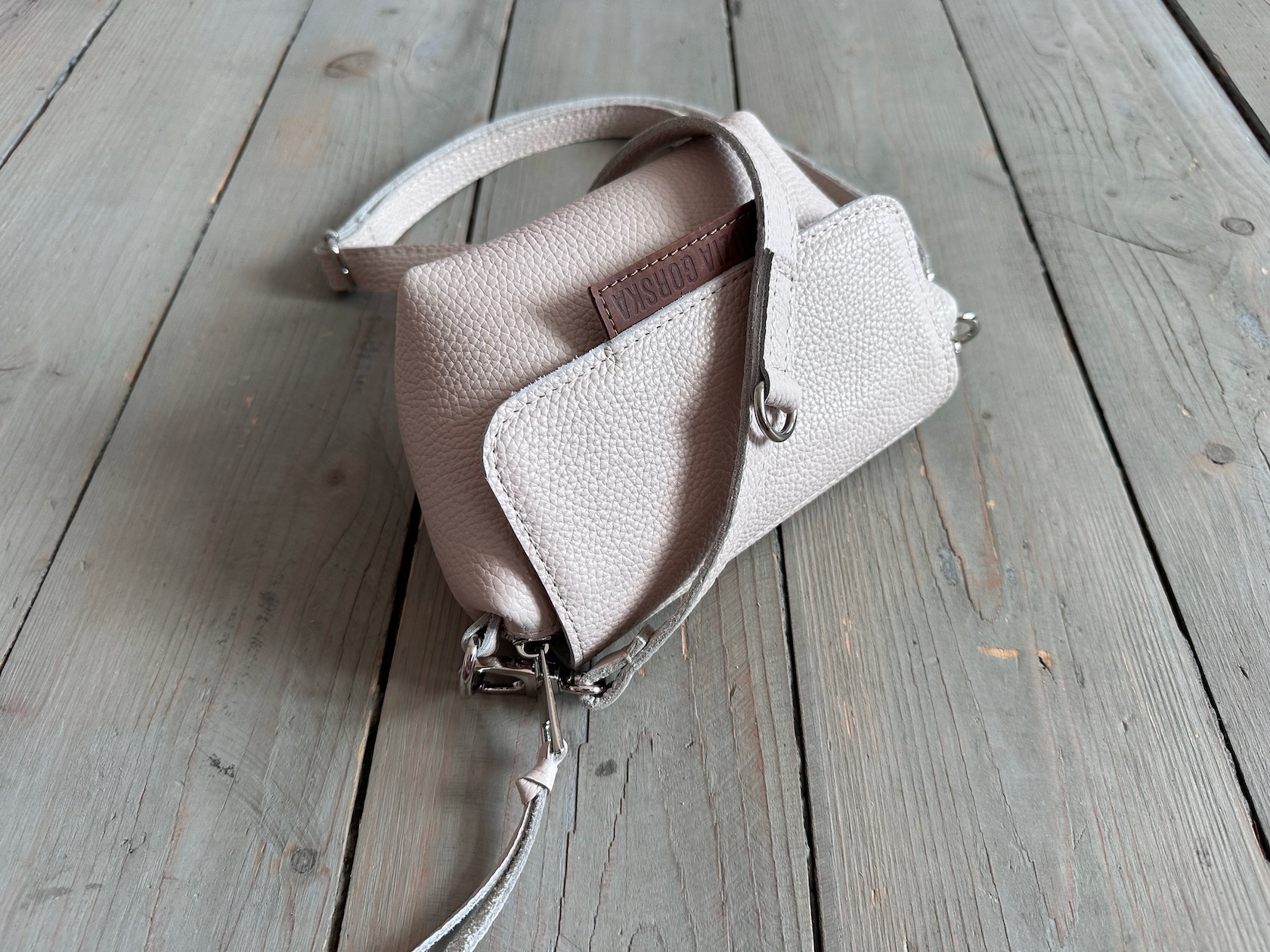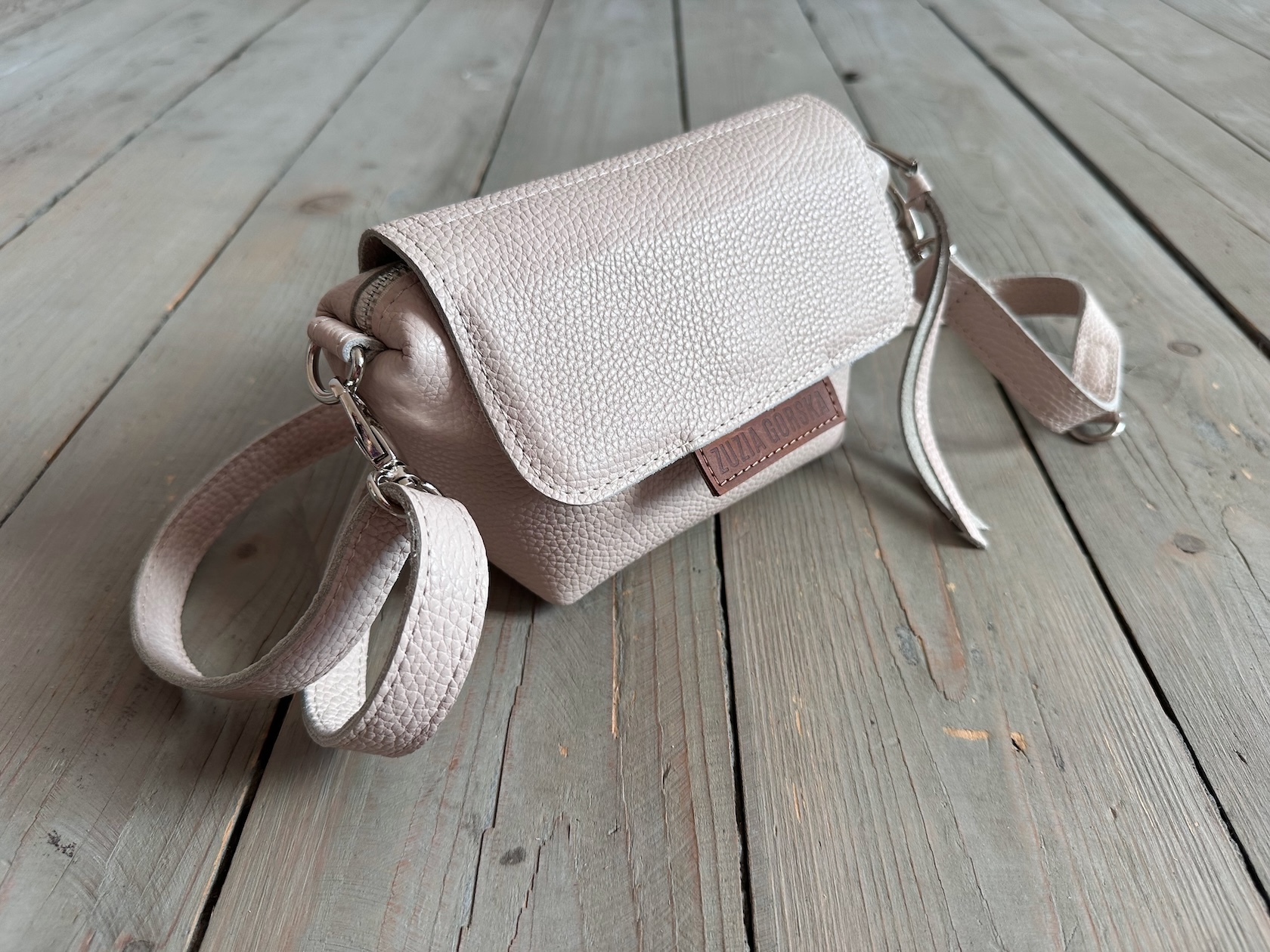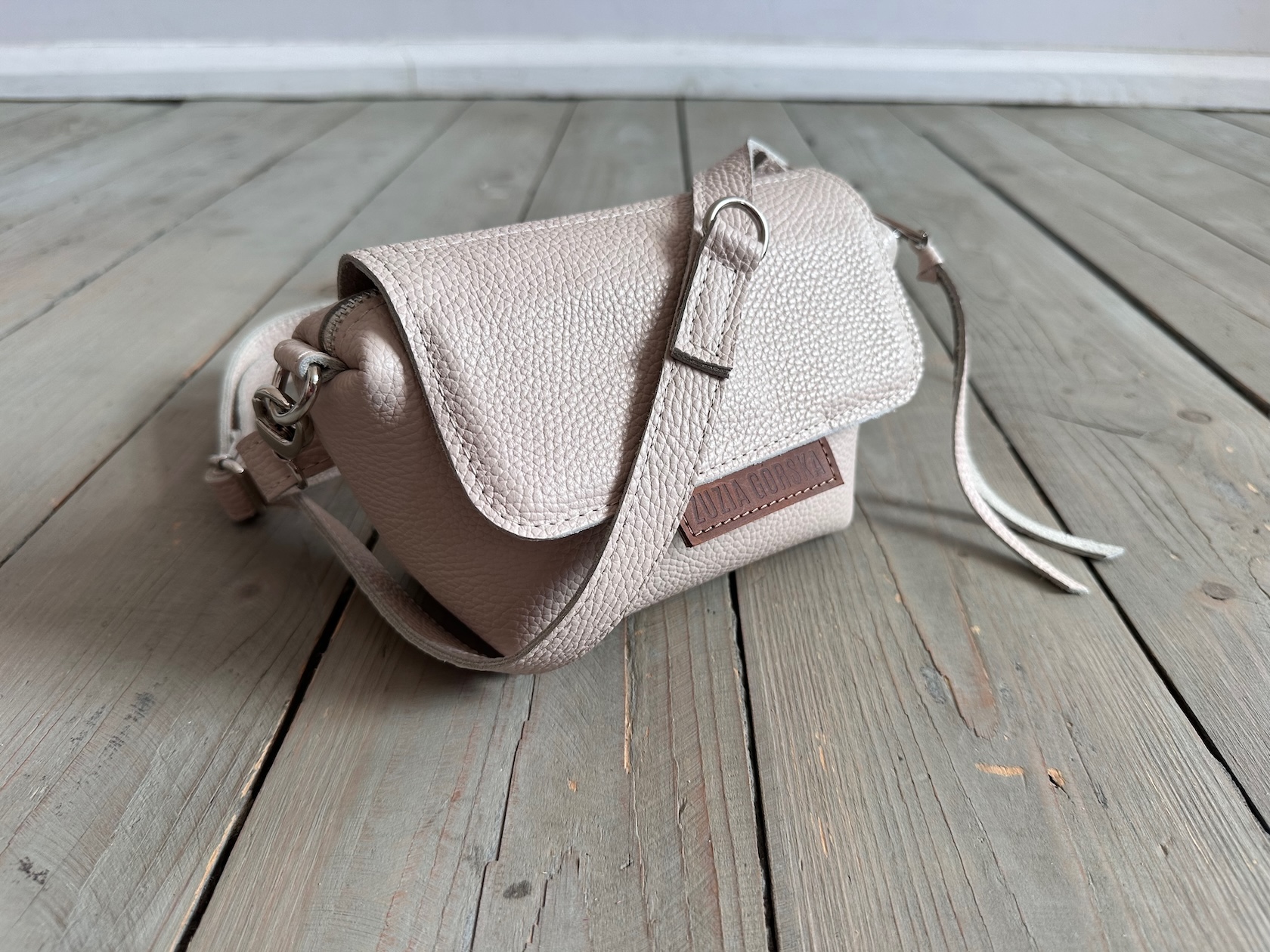 Uszyta ze skóry naturalnej licowej + bawełnianej podszewki.