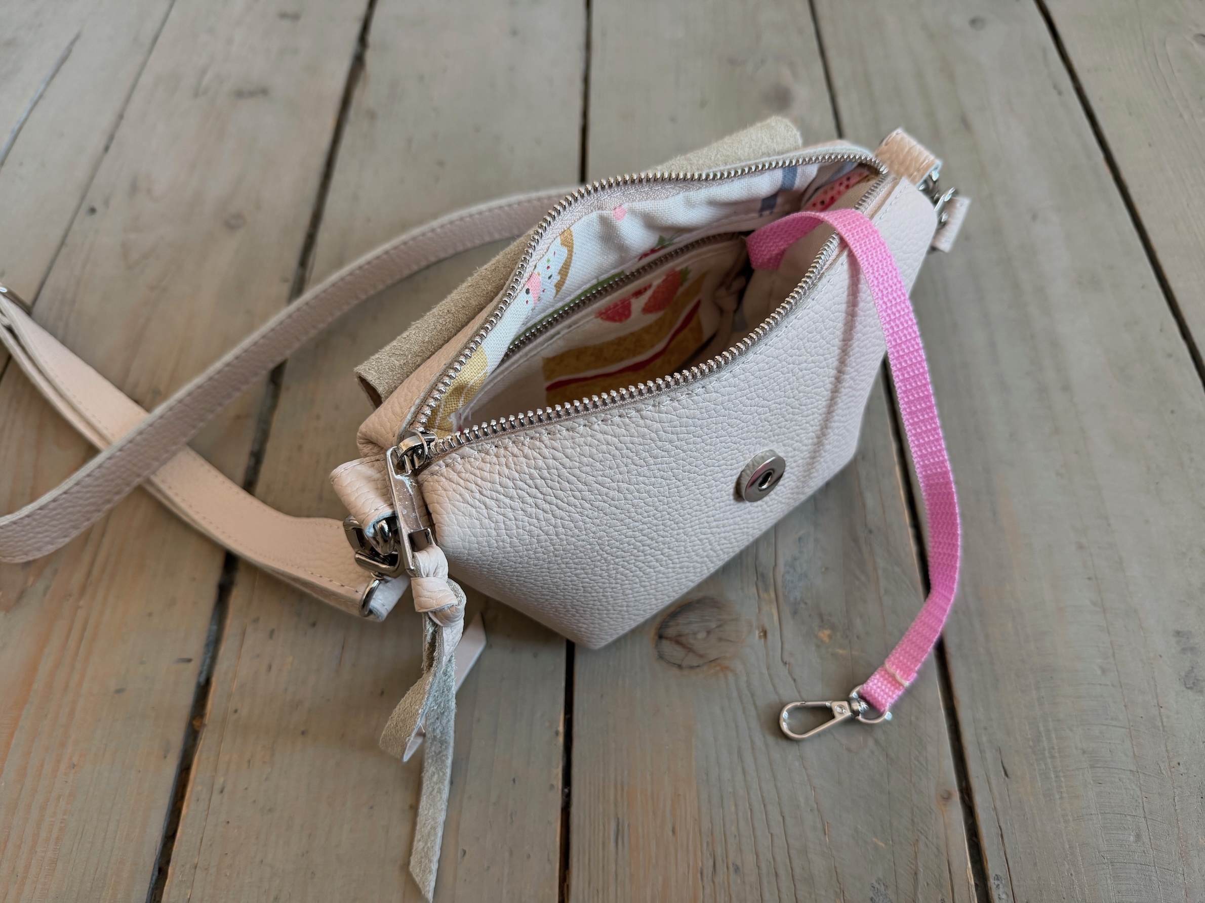 Wewnątrz kieszonka na zamek oraz smyczka z karabińczykiem.