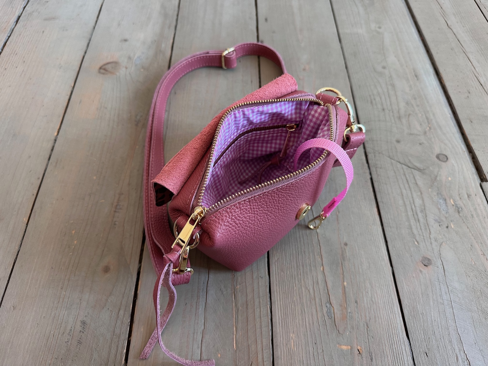 Uszyta ze skóry naturalnej nubukowej + bawełnianej podszewki.