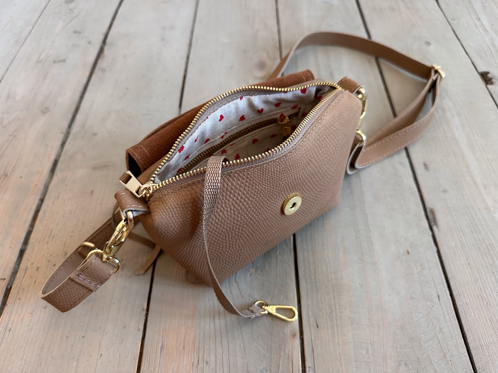Uszyta ze skóry naturalnej nubukowej + bawełnianej podszewki.