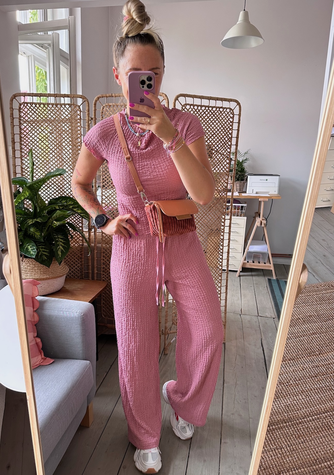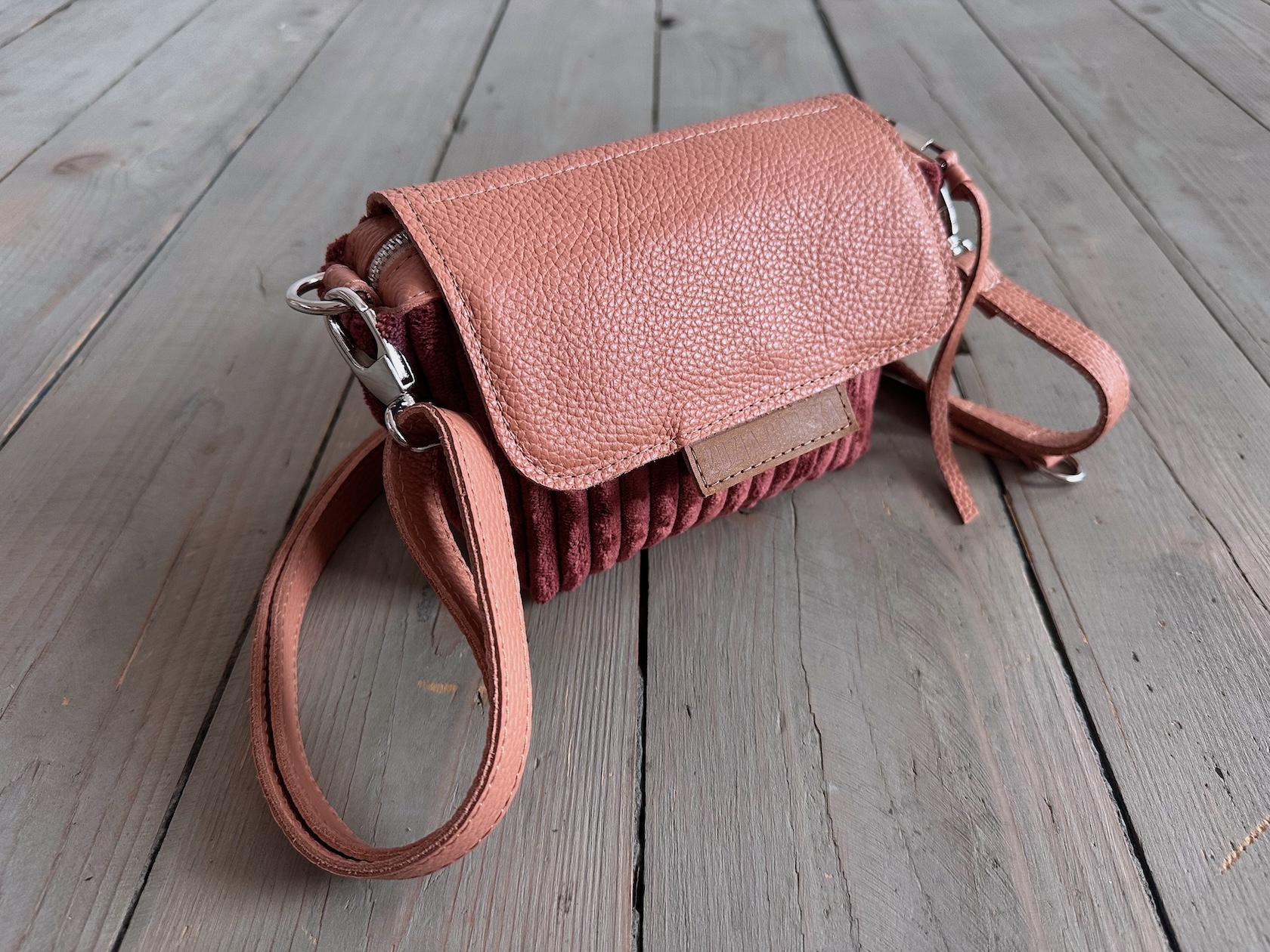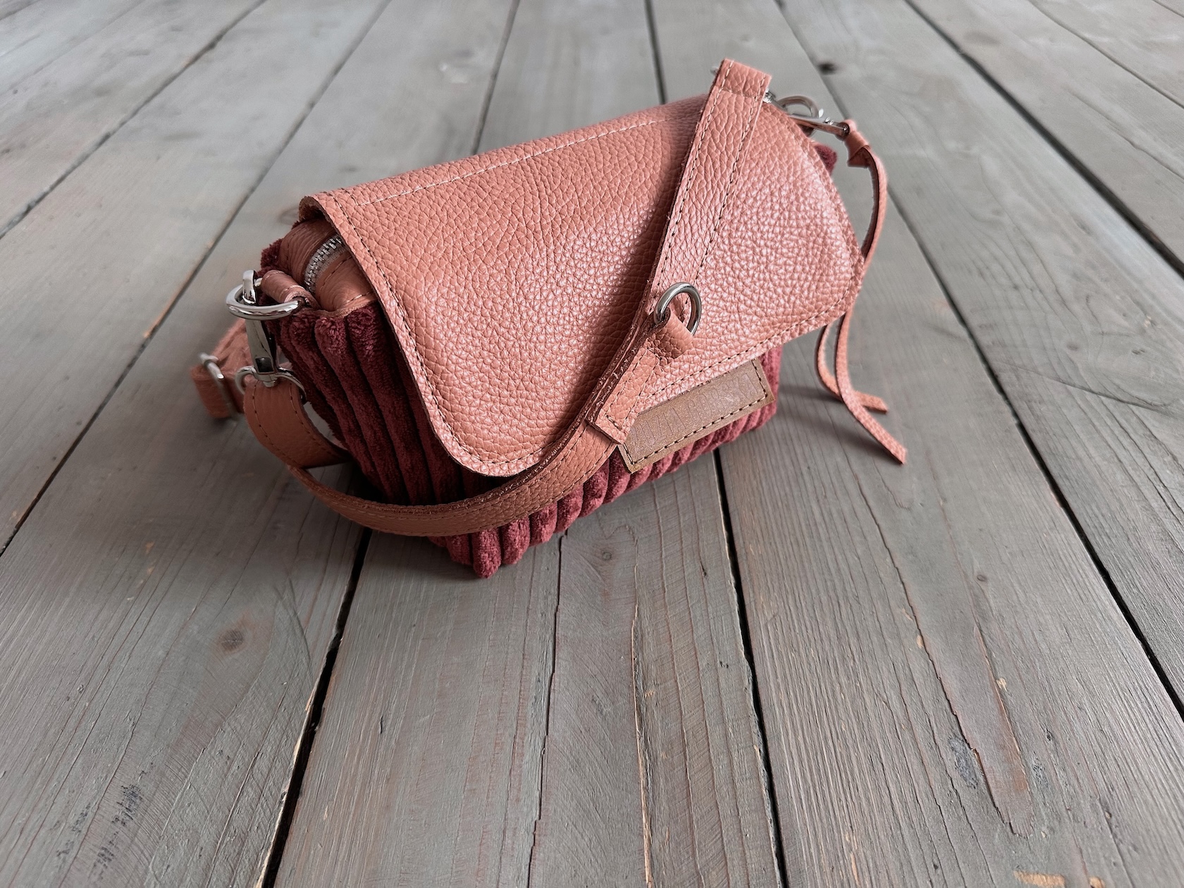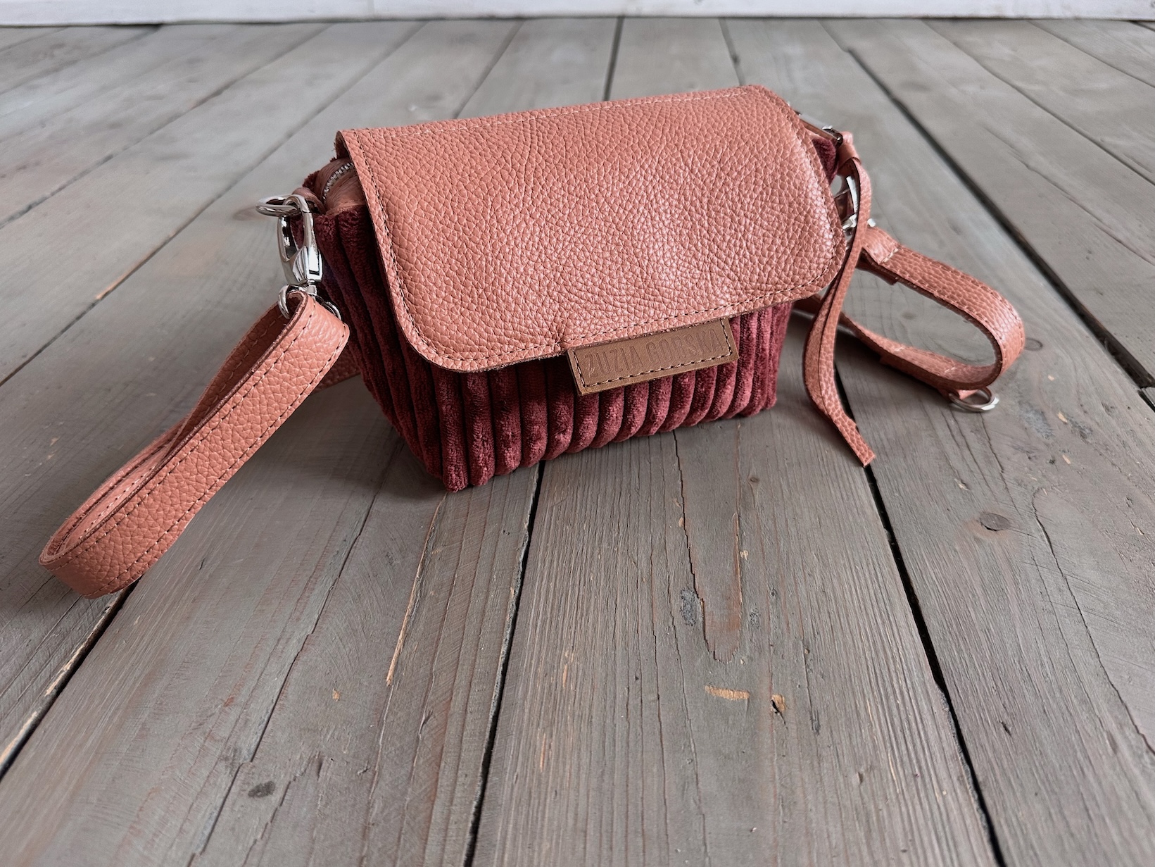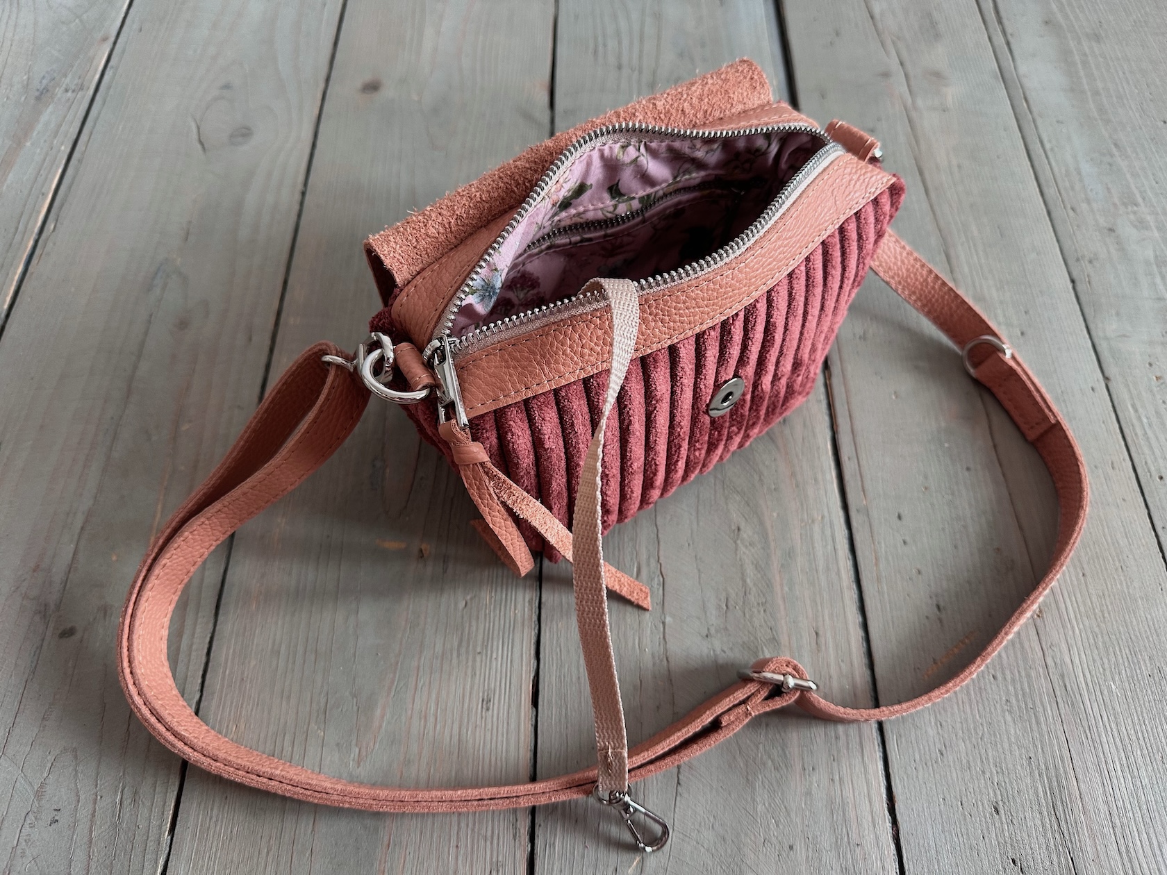 Uszyta z tkaniny dekoracyjnej bawełniano-poliestrowej + skóry naturalnej + bawełnianej podszewki.