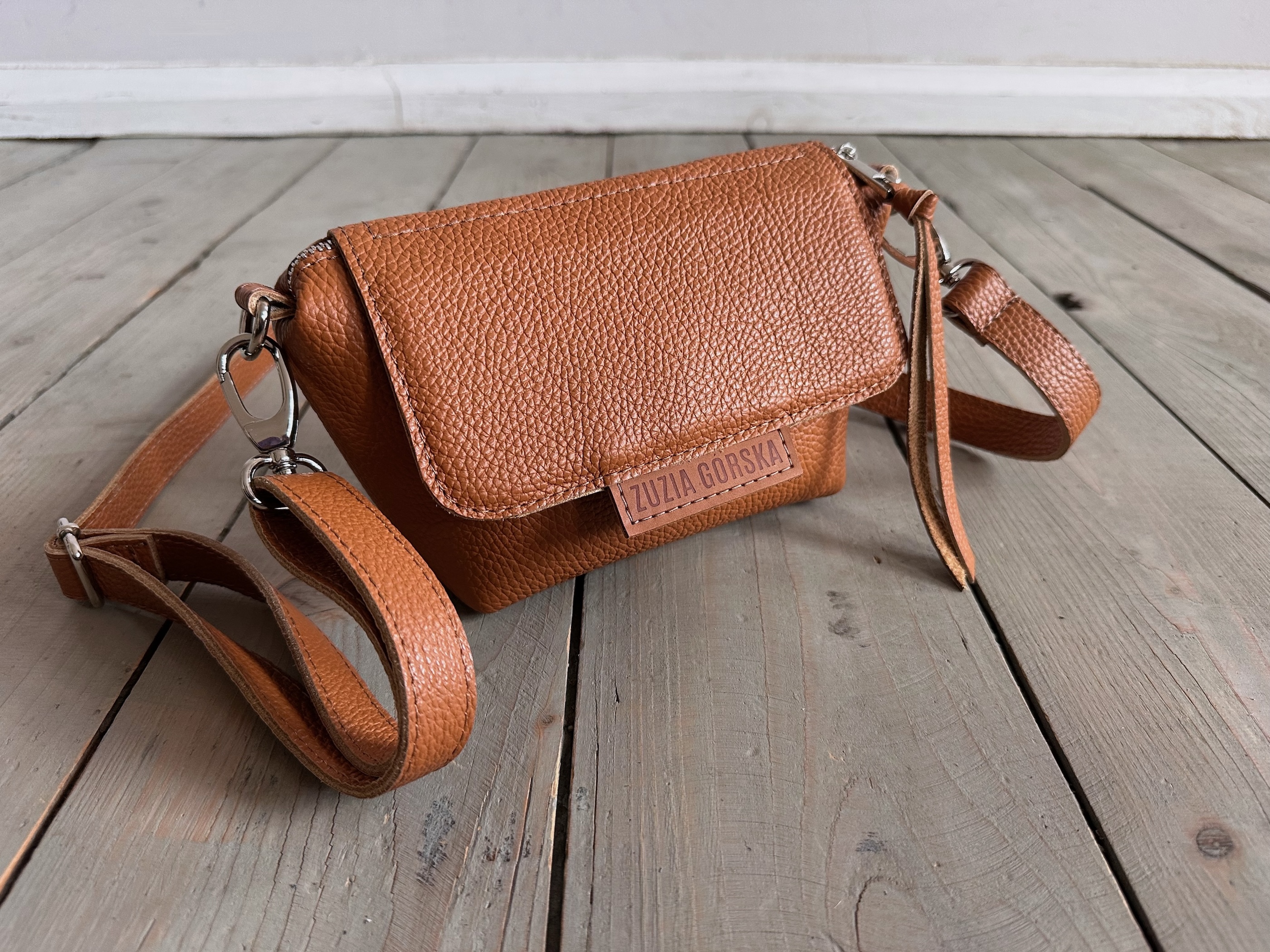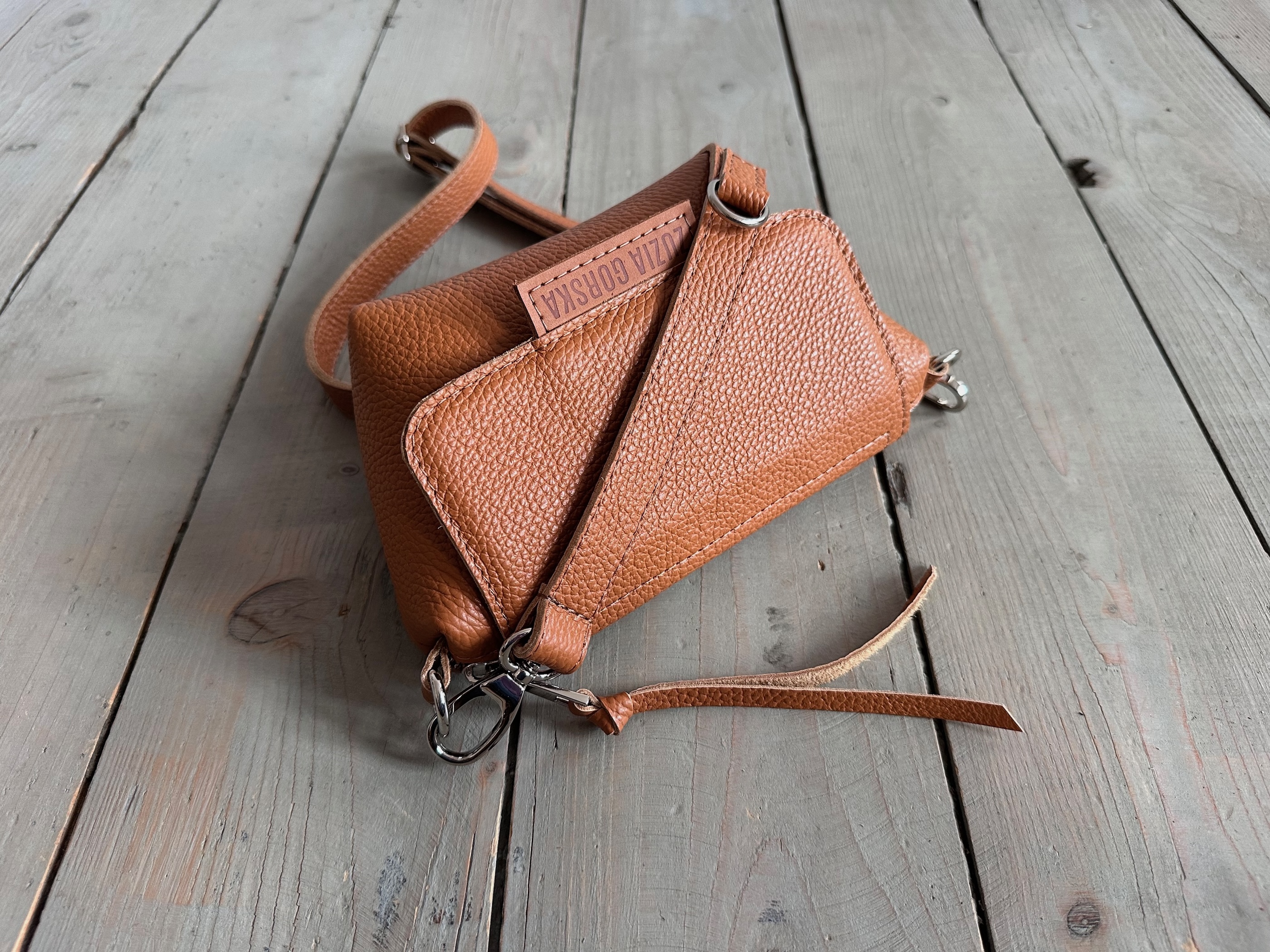 Uszyta ze skóry naturalnej licowej + bawełnianej podszewki.