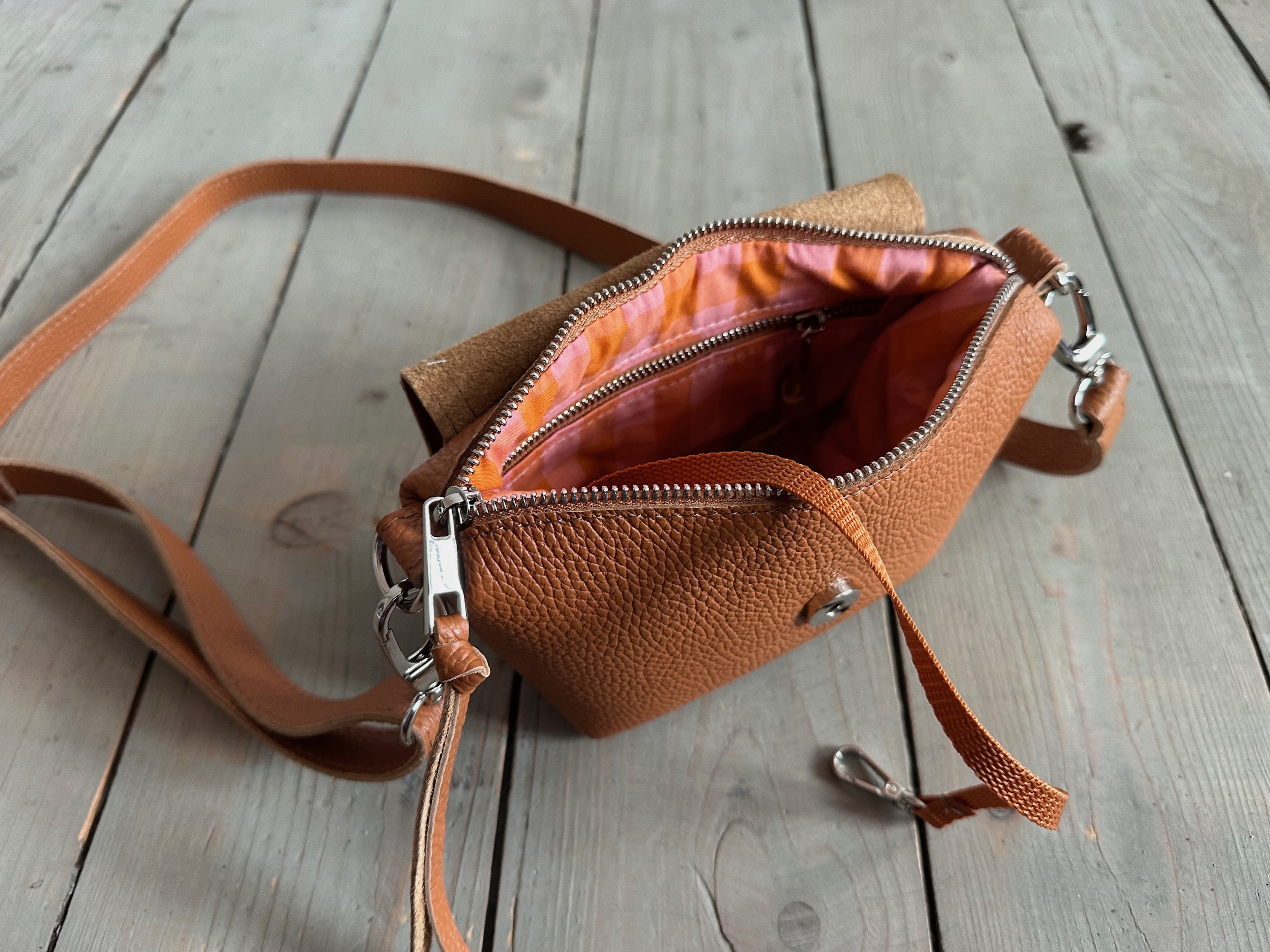 Wewnątrz kieszonka na zamek oraz smyczka z karabińczykiem.